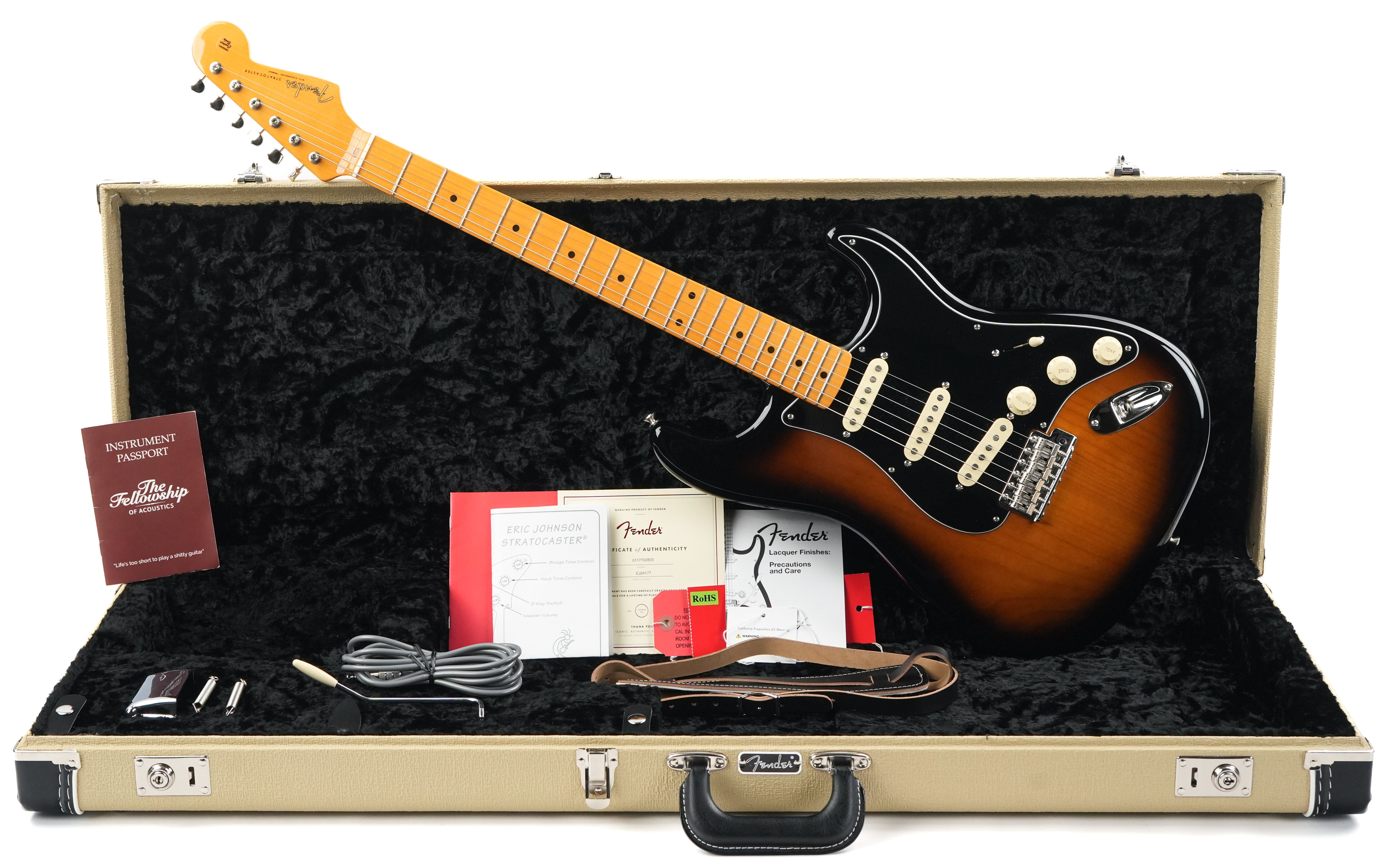 Mit der Eric Johnson Signature Stratocaster hat Fender eine Gitarre geschaffen, die vollständig auf die spezifischen Wünsche dieses legendären Blues- und Rockgitarristen abgestimmt ist!Mit der Eric Johnson Signature Stratocaster hat Fender eine Gitarre geschaffen, die vollständig auf die spezifischen Wünsche dieses legendären Blues- und Rockgitarristen abgestimmt ist. Die speziell entwickelten Single-Coils mit versenkten Schrauben, das weiche V-Halsprofil und das Vintage-Tremolo sorgen dafür, dass du den warmen, fließenden Ton von Eric Johnson jederzeit abrufen kannst. Dies ist keine gewöhnliche Stratocaster, sondern ein durchdachtes Instrument, das Jahrzehnte an Erfahrung und Verfeinerung in sich trägt.