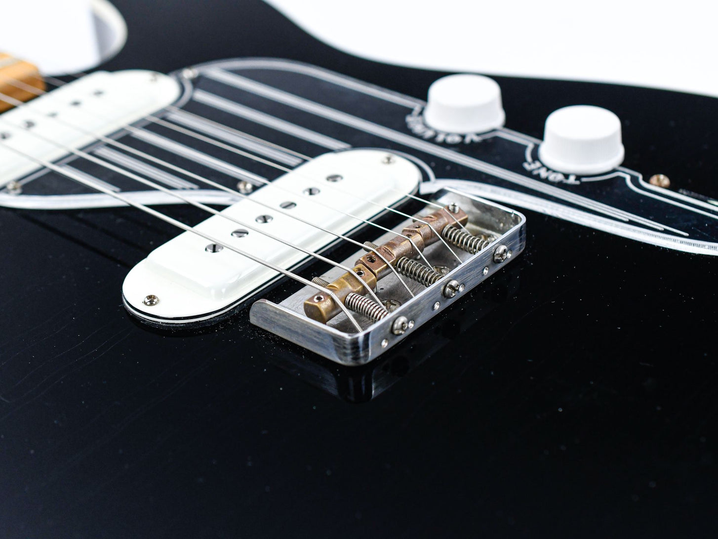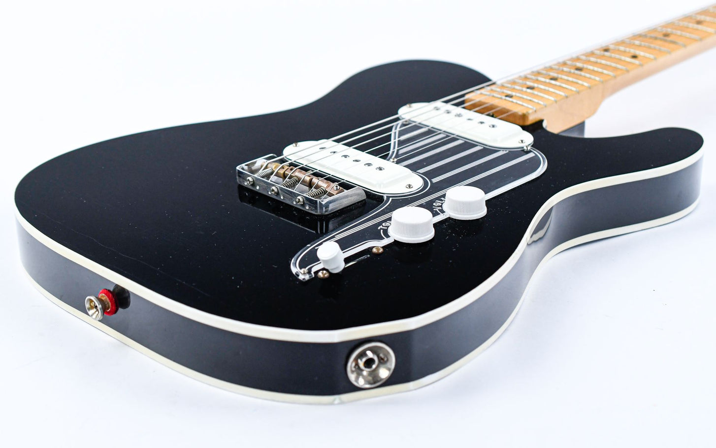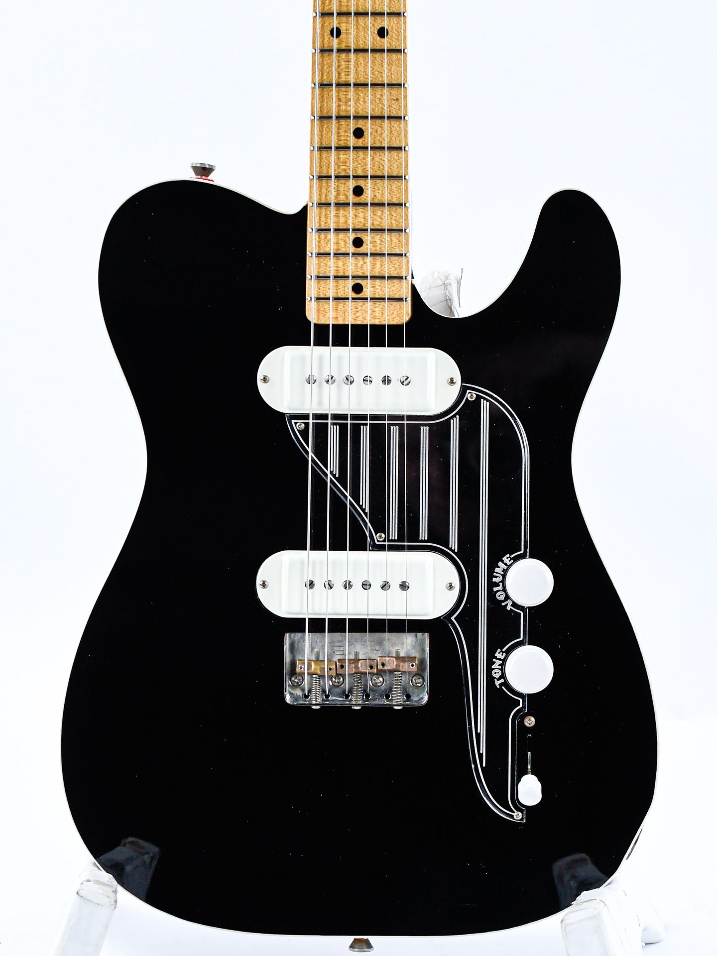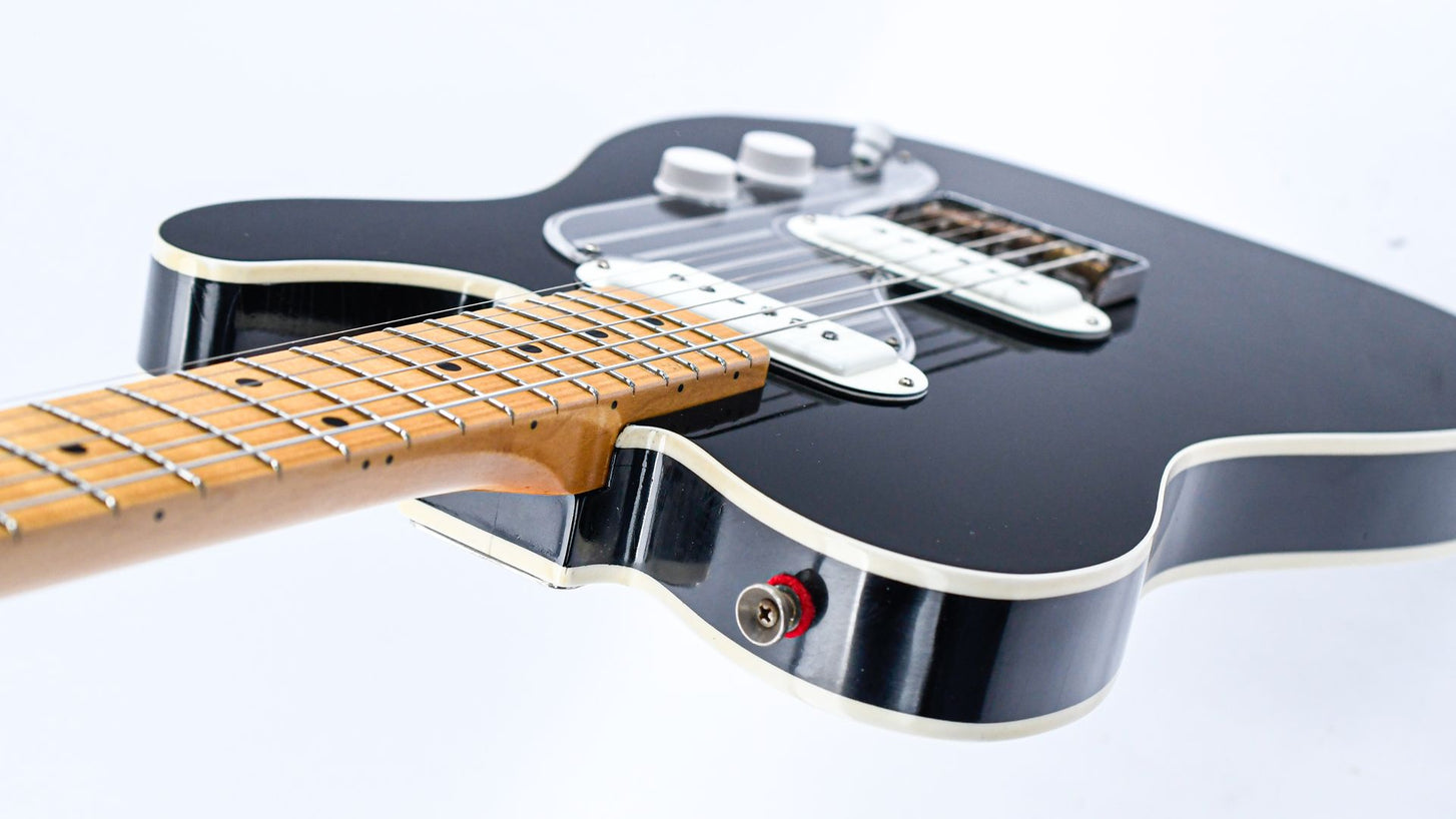 Die Model T ist eine Gitarre, die von einem der kultigsten Modelle der 50er Jahre inspiriert ist: der Telecaster. Diese Sonderanfertigung mit ihrem leicht angerauten schwarzen Lack wirkt wie aus längst vergangenen Zeiten bei uns im Shop, denn der Vintage-Look der Instrumente aus den 50er und 60er Jahren ist besonders überzeugend!