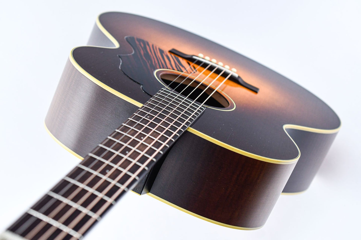 Die massive Fichtendecke sorgt für direkte Ansprache, Klarheit und Dynamik, während Boden und Zargen aus Ahorn für einen ausgeprägten Punch und eine herausragende Projektion sorgen – ideal für alle, die sich Gehör verschaffen wollen. Von satten Bässen bis hin zu hellen Mitten erfüllt diese Gitarre mühelos jeden Raum mit ihrem warmen, kraftvollen Klang.