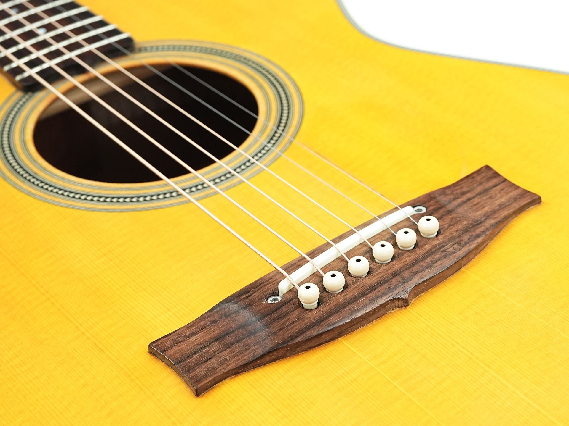 Diese Maton aus dem Jahr 2017 weist deutliche Spielspuren auf, insbesondere am Korpus. Die Decke hat drei reparierte Risse: Einer wurde beidseitig verleimt, während die beiden anderen stabil und einseitig verleimt sind. Außerdem wurde ein kleines transparentes Schlagbrett angebracht. Die Gitarre wird mit einem Hiscox-Koffer und TFOA-Pass geliefert.
