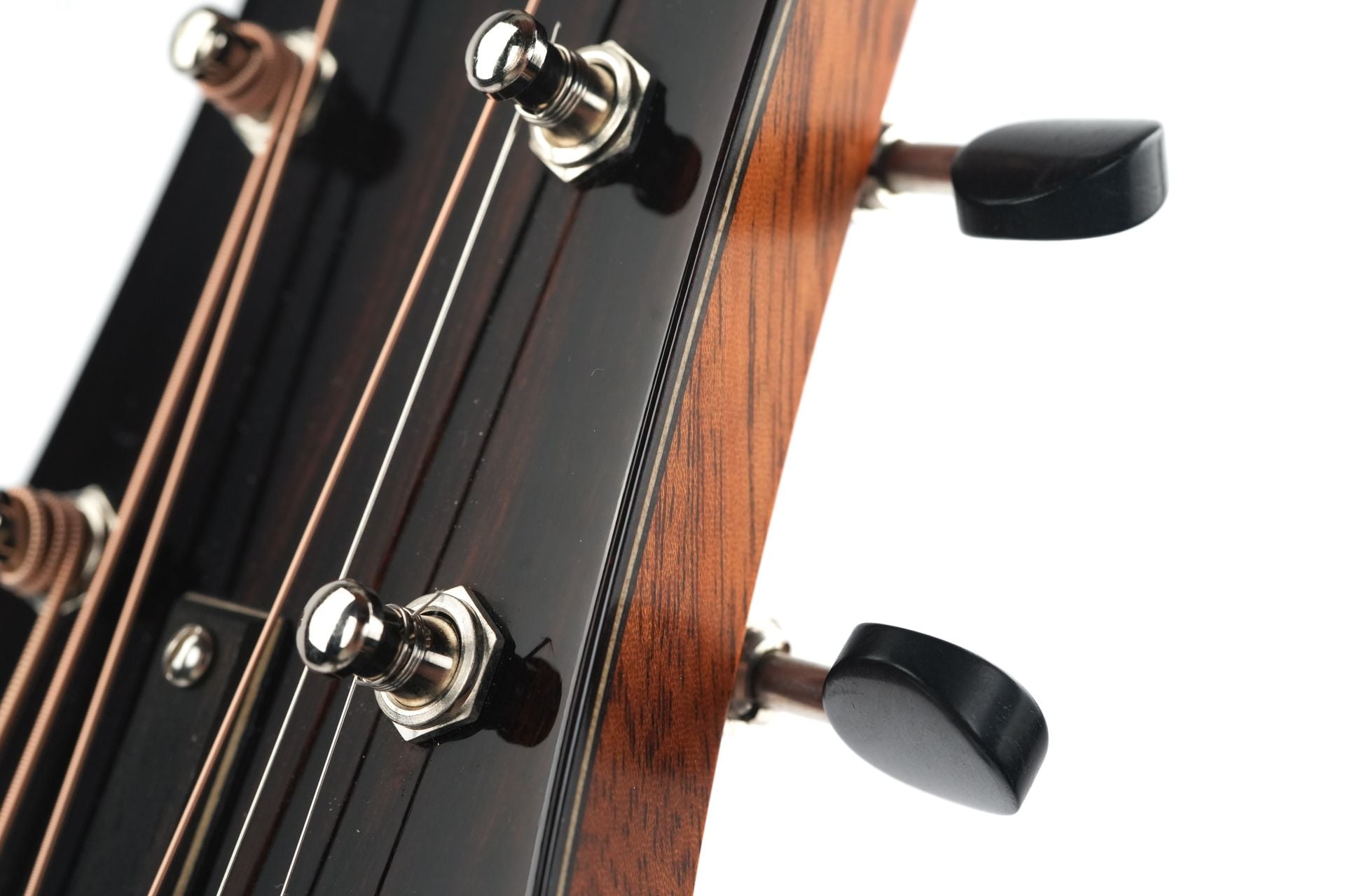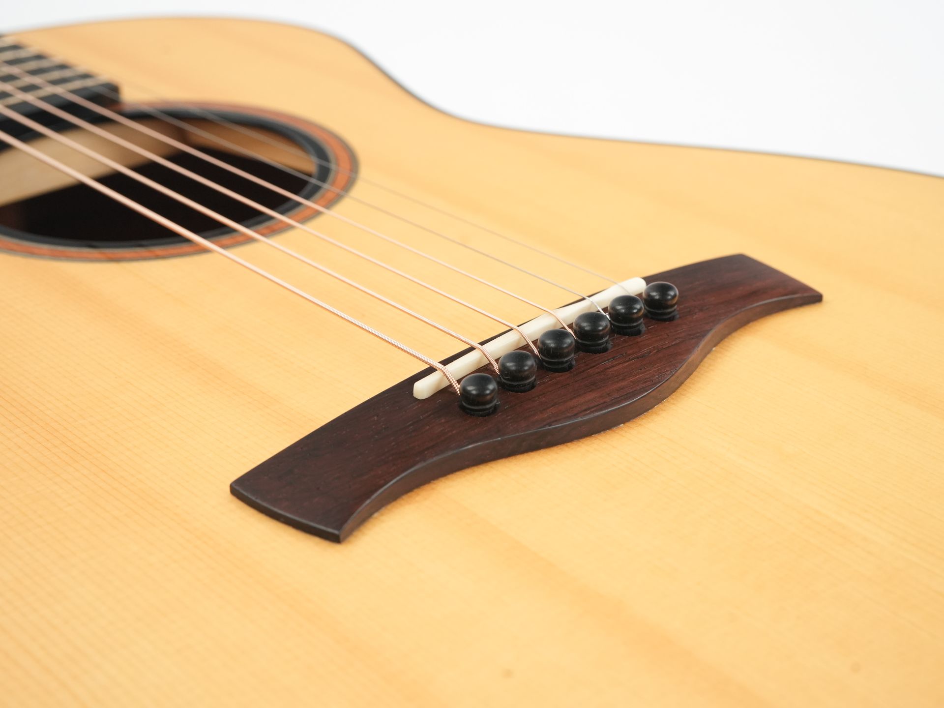 Die Decke ist aus italienischer Fichte aus dem Stradivari-Tal gefertigt, die für ihre schnelle Ansprache, Klarheit und ihren reichen Obertongehalt bekannt ist. Boden und Zargen sind aus Sacha-Palisander Higuerilla gefertigt, einem optisch auffälligen und klanglich beeindruckenden Tonholz, das nachhaltig von Terra Tonewoods bezogen wird. Klanglich liefert Sacha-Palisander tiefe, satte Bässe mit klaren und artikulierten Höhen, die oft mit Madagaskar-Palisander verglichen werden, ohne jedoch unter das CITES-Abkommen zu fallen. Die nicht gewölbte X-Verstrebung verleiht der Gitarre eine fokussierte, kontrollierte Ansprache mit ausgezeichneter Balance über alle Saiten hinweg.