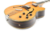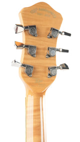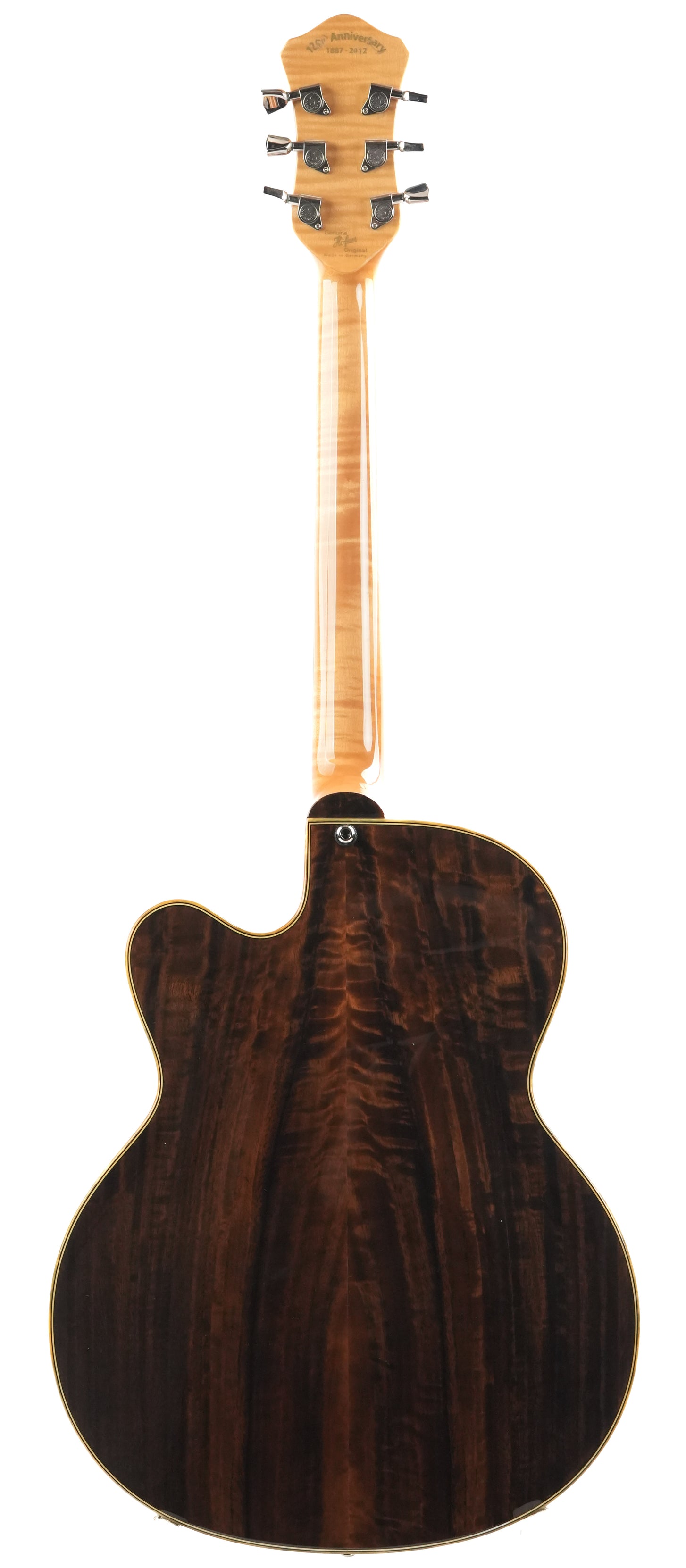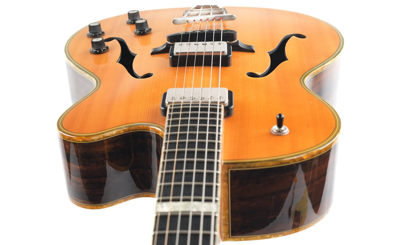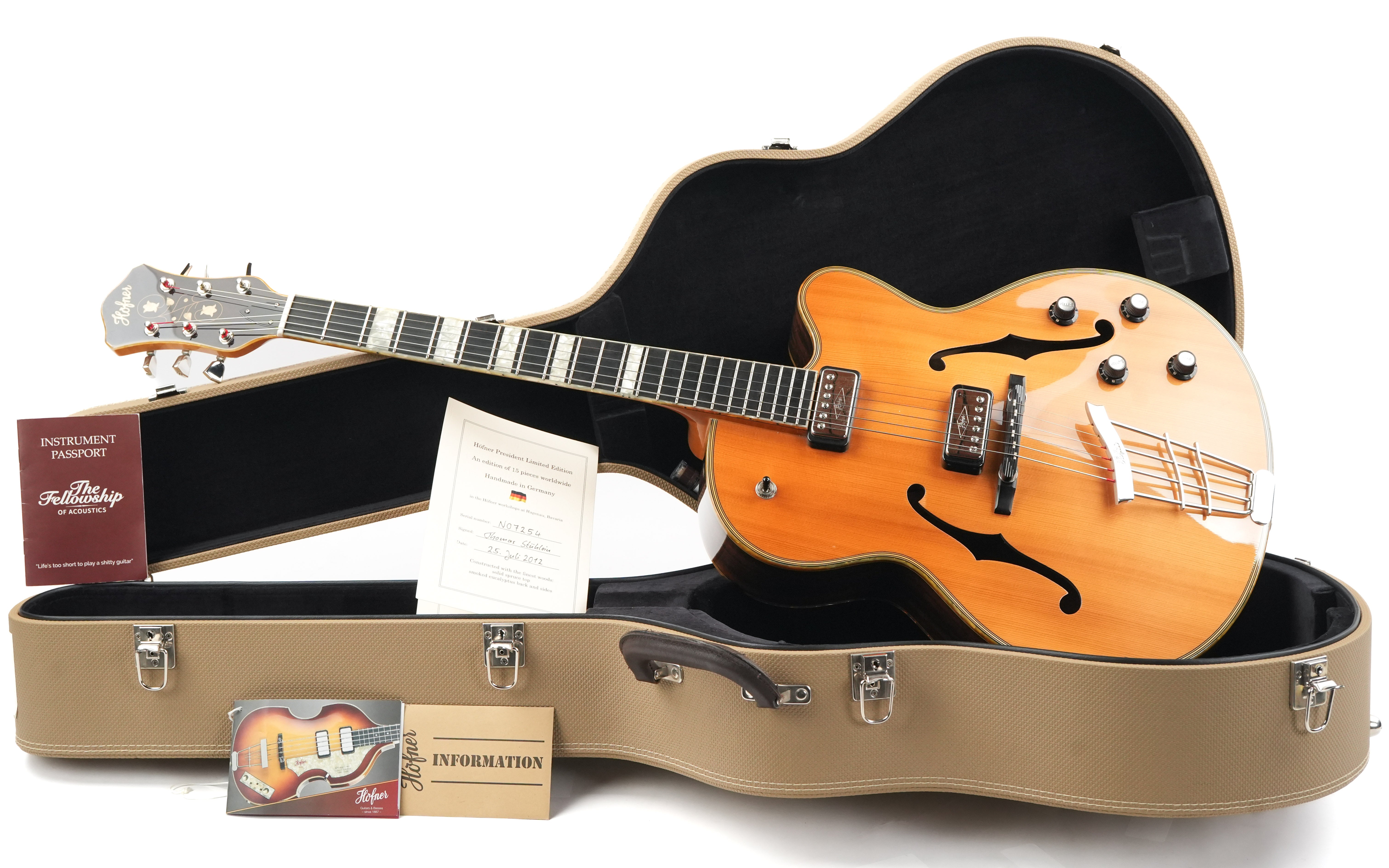 Die Höfner President LTD Edition Natural von 2012 ist eine Rarität, da weltweit nur 15 Exemplare gefertigt wurden. Diese Archtop-Gitarre, handgefertigt in der Werkstatt in Hagenau, verkörpert die Tradition des klassischen Jazzgitarrenbaus, bei dem Handwerkskunst und Materialauswahl im Mittelpunkt stehen. Die natürliche, dünne Lackierung lässt das Holz voll zur Geltung kommen und verleiht der Gitarre ein offenes, elegantes Erscheinungsbild, das sofort an die Blütezeit der 1950er-Jahre erinnert.Die Kombination aus massiver Fichtendecke und Zargen und Boden aus geräuchertem Eukalyptus erzeugt einen vollen, vielschichtigen Klang. Die Fichtendecke sorgt für schnelle Ansprache und Klarheit, während Eukalyptus Wärme und Tiefe mit einer wunderbar ausgewogenen Projektion beisteuert. Die Korpusgröße von 16 Zoll bietet die ideale Balance aus Spielkomfort und Lautstärke, sodass diese President sowohl akustisch als auch verstärkt überzeugt. Der traditionelle Ebenholzsteg und das Höfner Lyre-Saitenhalter tragen zu einer direkten Klangübertragung und einem klassischen Spielgefühl bei.Ausgestattet mit zwei Höfner Diamond Pickups, einem Dreiwegeschalter und separaten Lautstärke- und Klangreglern bietet diese Gitarre ein breites Klangspektrum – von warmen Jazz-Akkorden bis hin zu prägnanten, klaren Linien. Die edle Einfassung und die Zierleisten runden das Gesamtbild harmonisch ab und unterstreichen den handgefertigten Charakter dieses Instruments. Eine besondere Archtop für Liebhaber, die Tradition, Seltenheit und einen unverwechselbaren Klang schätzen.Diese Höfner befindet sich in exzellentem Zustand. Leichte Gebrauchsspuren und einige kleine Dellen sind auf der Decke und den Zargen zu finden, die Einfassungen sind leicht vergilbt. Außerdem befindet sich ein kleiner Riss in der Umrandung des Steg-Pickups, ansonsten ist die Gitarre in einem gepflegten, gebrauchten Zustand.Sie wird mit TFOA-Pass und Höfner-Koffer geliefert.