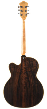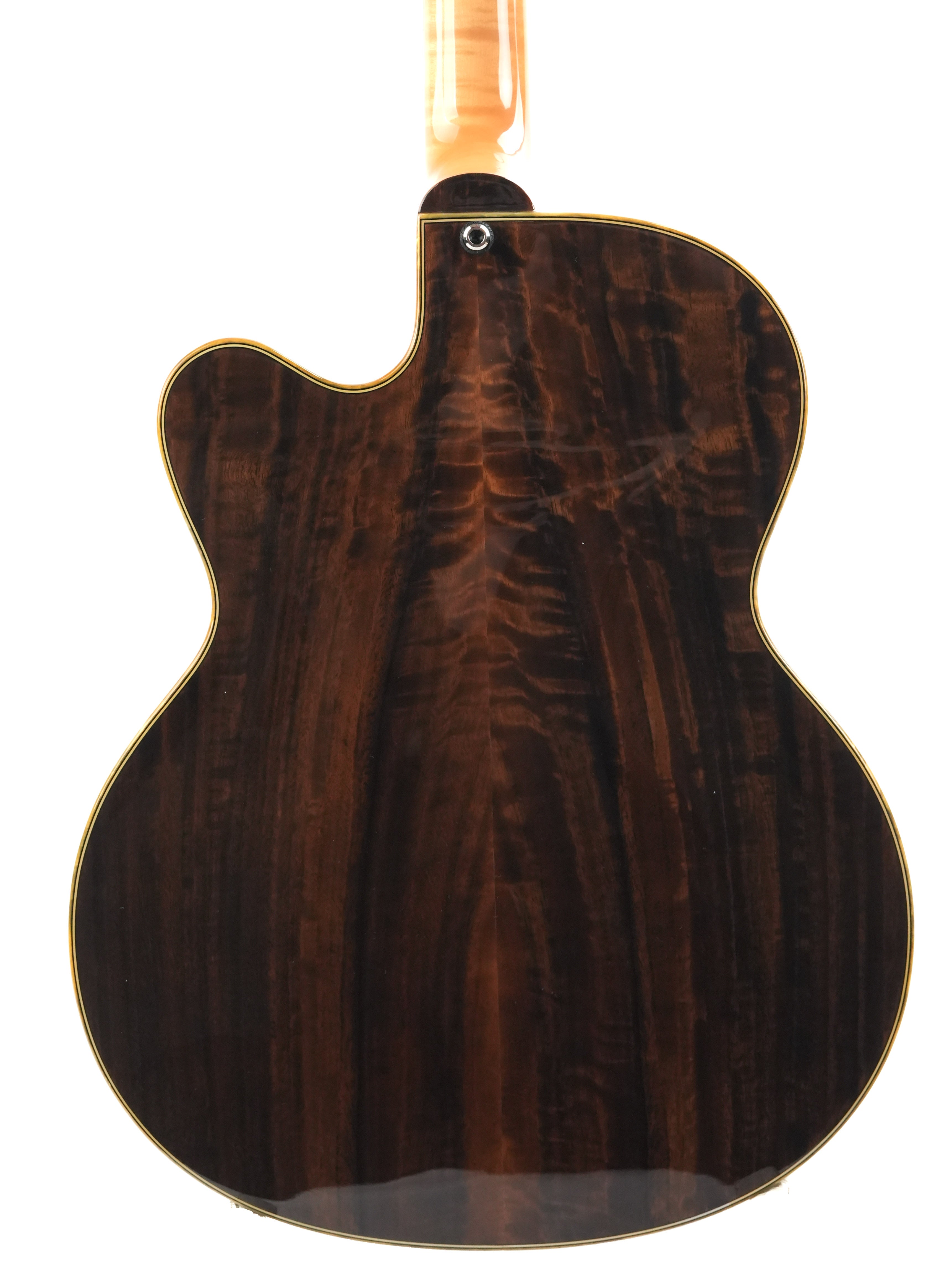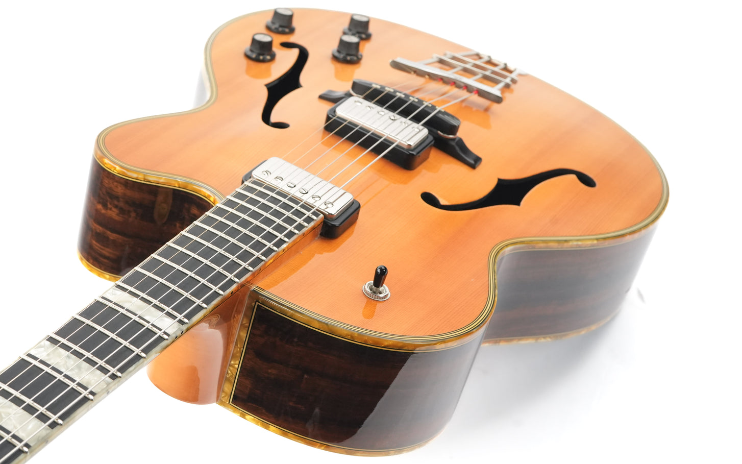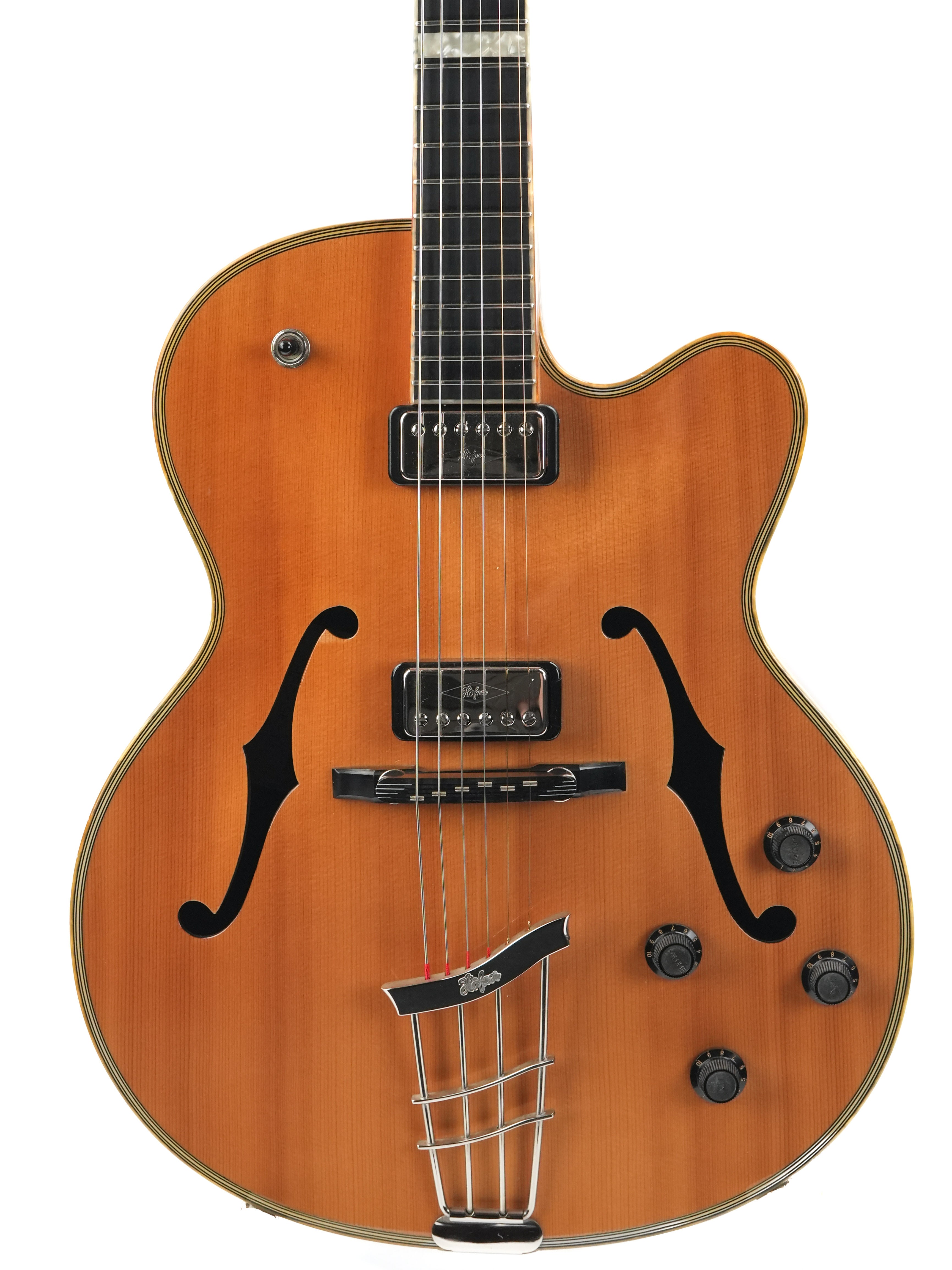 Die Höfner President LTD Edition Natural von 2012 ist eine Rarität, da weltweit nur 15 Exemplare gefertigt wurden. Diese Archtop-Gitarre, handgefertigt in der Werkstatt in Hagenau, verkörpert die Tradition des klassischen Jazzgitarrenbaus, bei dem Handwerkskunst und Materialauswahl im Mittelpunkt stehen. Die natürliche, dünne Lackierung lässt das Holz voll zur Geltung kommen und verleiht der Gitarre ein offenes, elegantes Erscheinungsbild, das sofort an die Blütezeit der 1950er-Jahre erinnert.Die Kombination aus massiver Fichtendecke und Zargen und Boden aus geräuchertem Eukalyptus erzeugt einen vollen, vielschichtigen Klang. Die Fichtendecke sorgt für schnelle Ansprache und Klarheit, während Eukalyptus Wärme und Tiefe mit einer wunderbar ausgewogenen Projektion beisteuert. Die Korpusgröße von 16 Zoll bietet die ideale Balance aus Spielkomfort und Lautstärke, sodass diese President sowohl akustisch als auch verstärkt überzeugt. Der traditionelle Ebenholzsteg und das Höfner Lyre-Saitenhalter tragen zu einer direkten Klangübertragung und einem klassischen Spielgefühl bei.Ausgestattet mit zwei Höfner Diamond Pickups, einem Dreiwegeschalter und separaten Lautstärke- und Klangreglern bietet diese Gitarre ein breites Klangspektrum – von warmen Jazz-Akkorden bis hin zu prägnanten, klaren Linien. Die edle Einfassung und die Zierleisten runden das Gesamtbild harmonisch ab und unterstreichen den handgefertigten Charakter dieses Instruments. Eine besondere Archtop für Liebhaber, die Tradition, Seltenheit und einen unverwechselbaren Klang schätzen.Diese Höfner befindet sich in exzellentem Zustand. Leichte Gebrauchsspuren und einige kleine Dellen sind auf der Decke und den Zargen zu finden, die Einfassungen sind leicht vergilbt. Außerdem befindet sich ein kleiner Riss in der Umrandung des Steg-Pickups, ansonsten ist die Gitarre in einem gepflegten, gebrauchten Zustand.Sie wird mit TFOA-Pass und Höfner-Koffer geliefert.