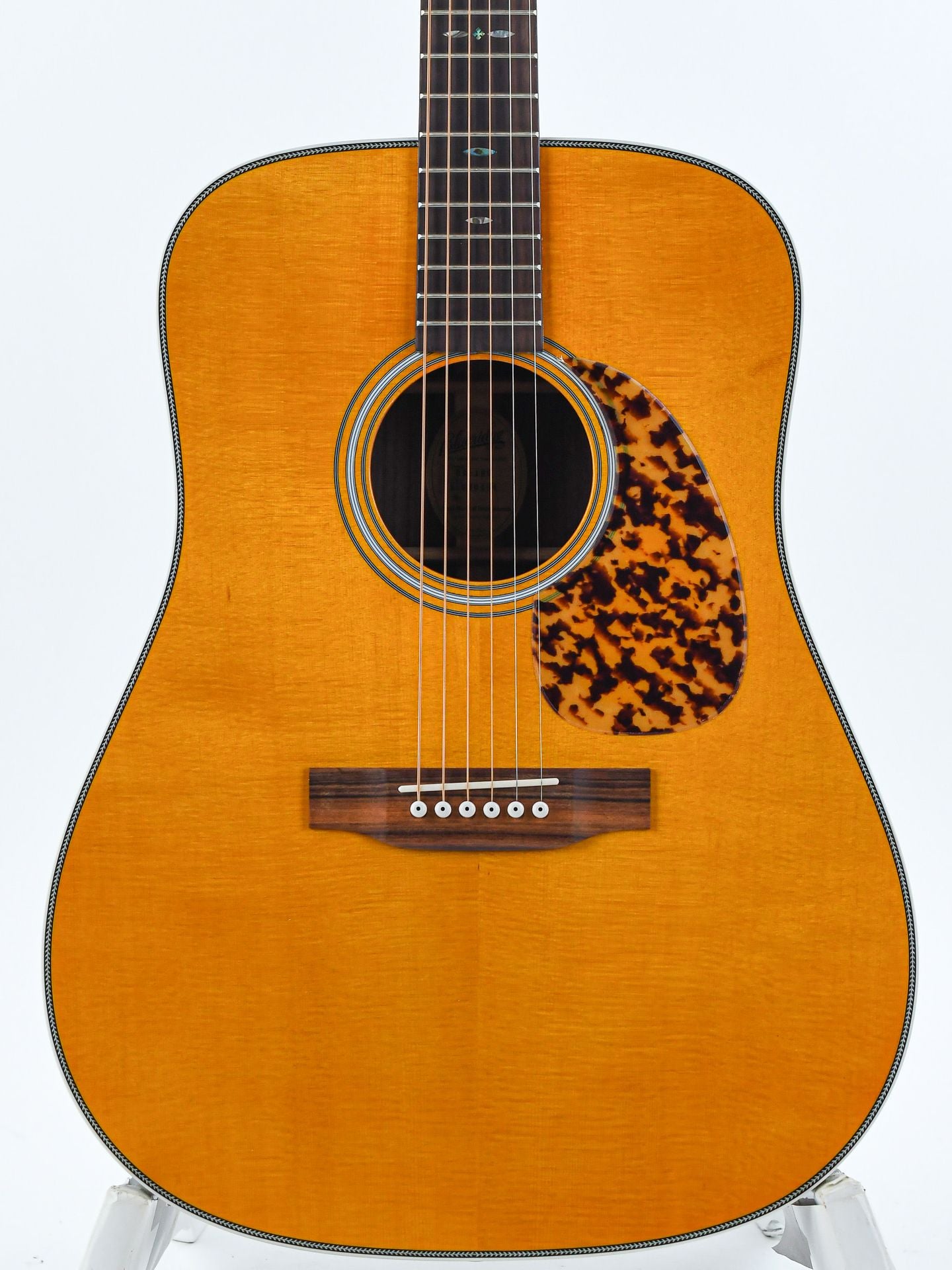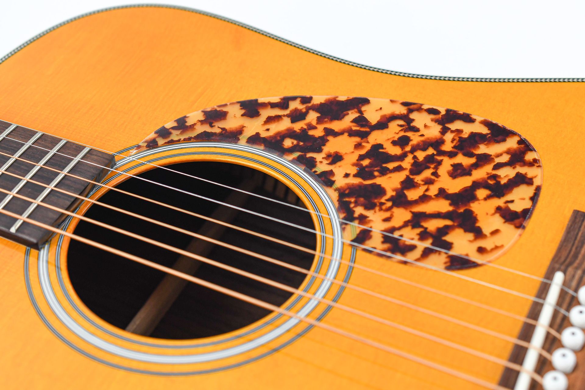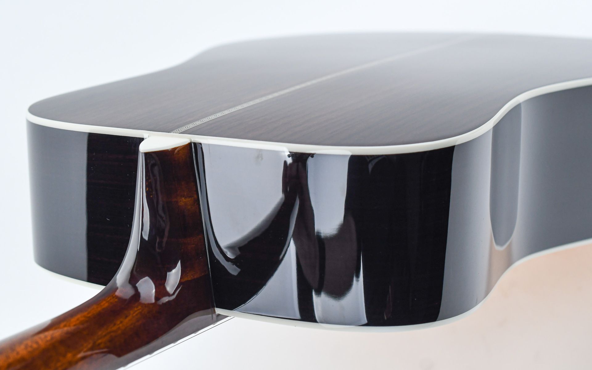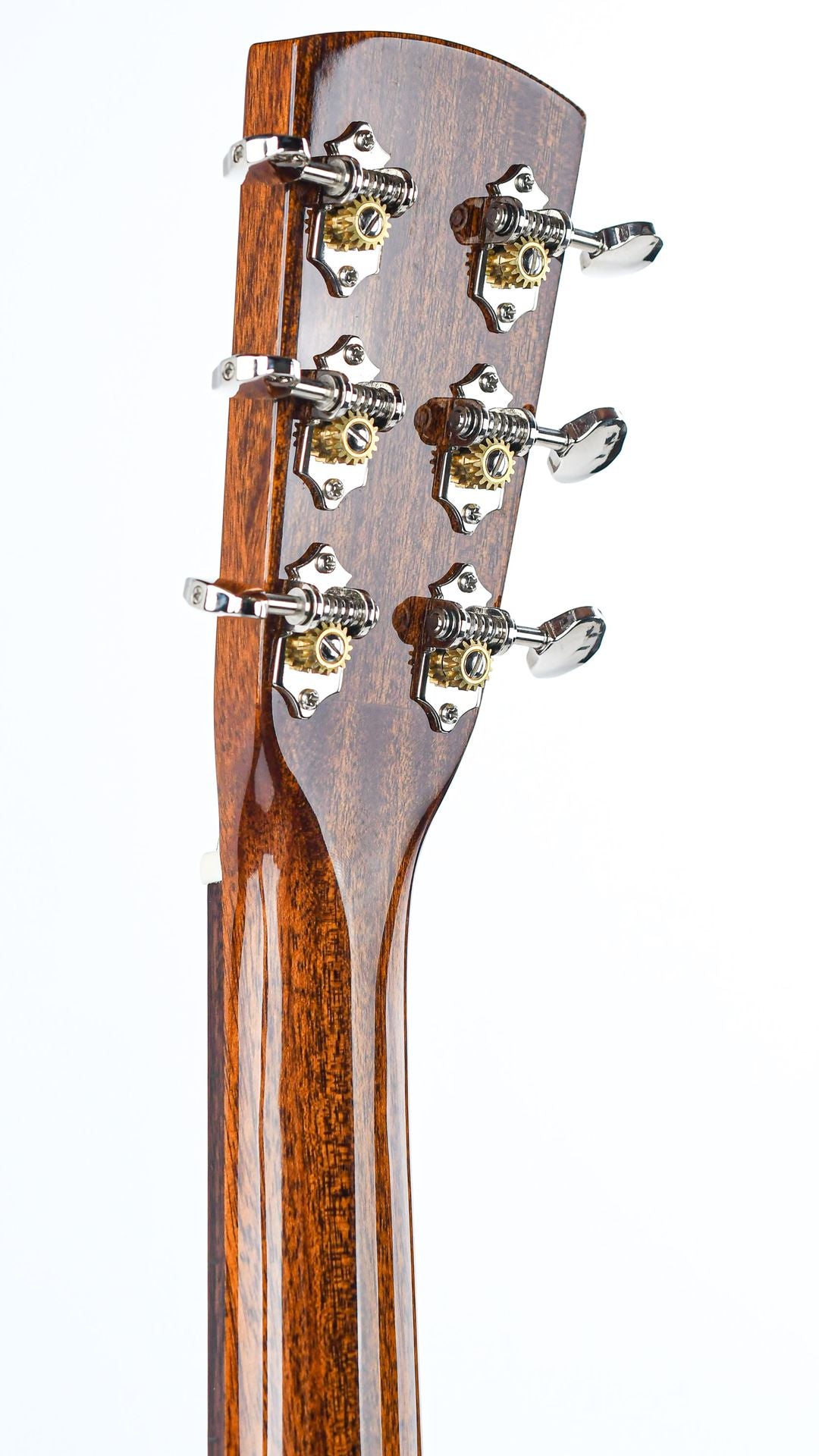 Het begint met een massief Sitka sparren bovenblad en scalloped topbraces die het vooroorlogse 'forward shifted' X-patroon respecteren. Santos palissander zij- en achterkant voegen een sterke bas toe aan het toch al volle geluid van het sparrenhouten bovenblad. De slanke mahonie hals is comfortabel en is voorzien van een 'dovetail' halsverbinding en verstelbare truss rod. Mooie uiterlijke kenmerken zijn onder meer een 'Dalmatian' slagplaat en parelmoeren hals- en kopinleg.