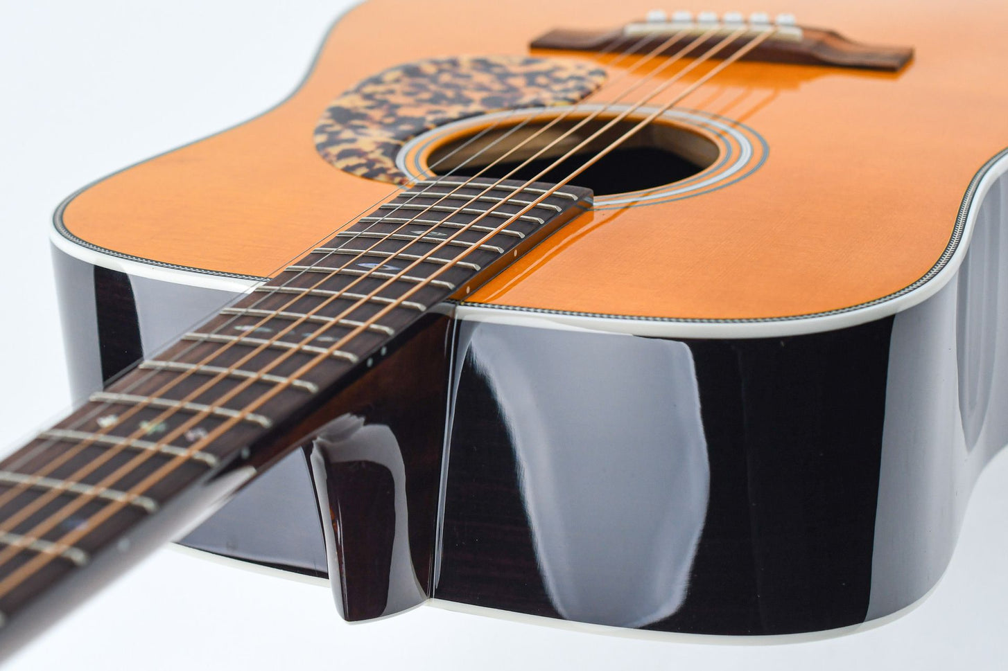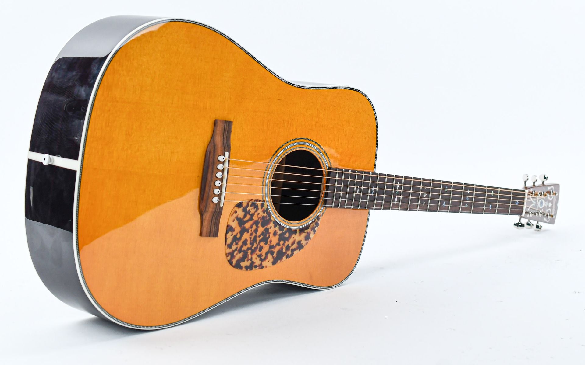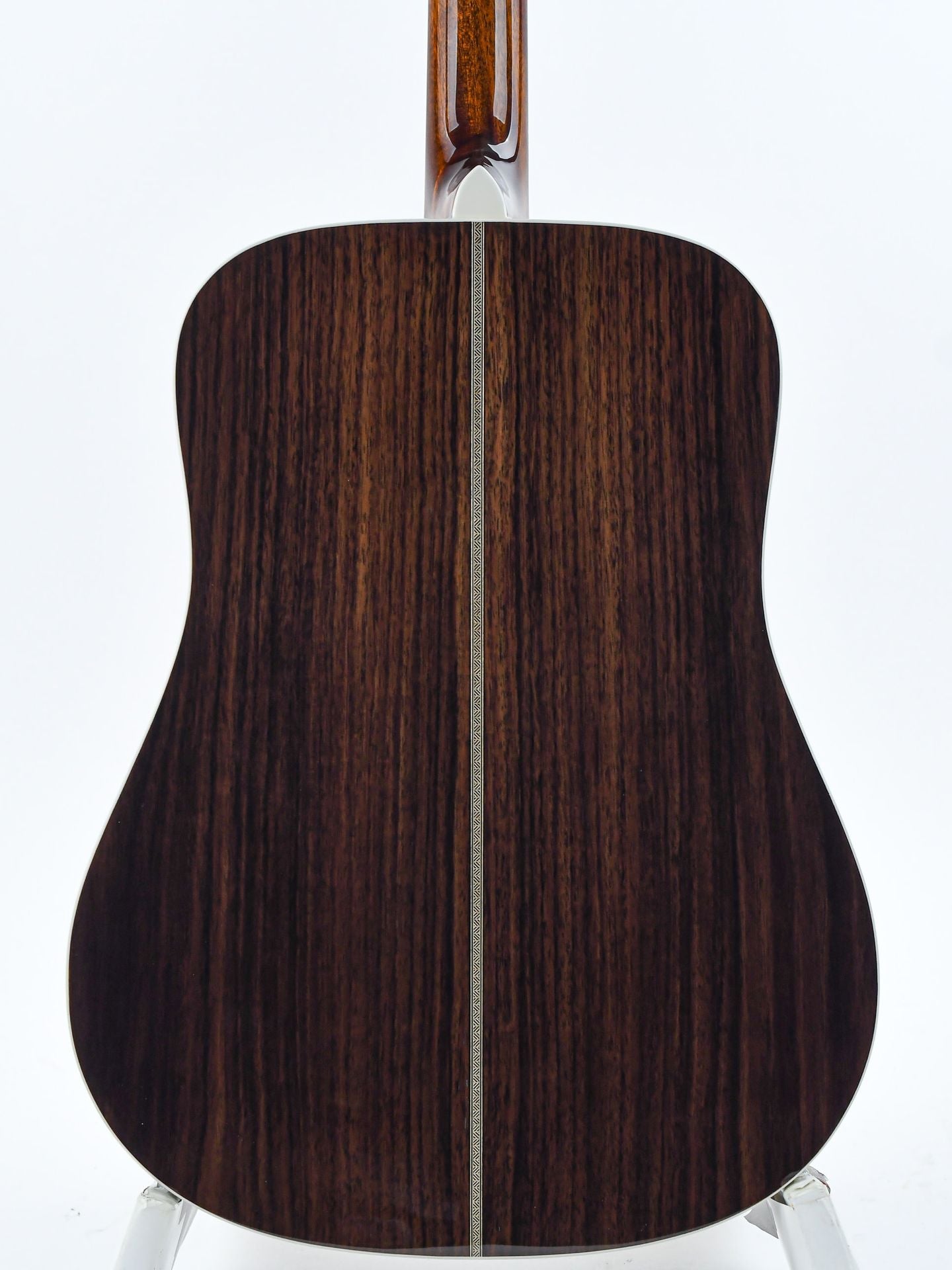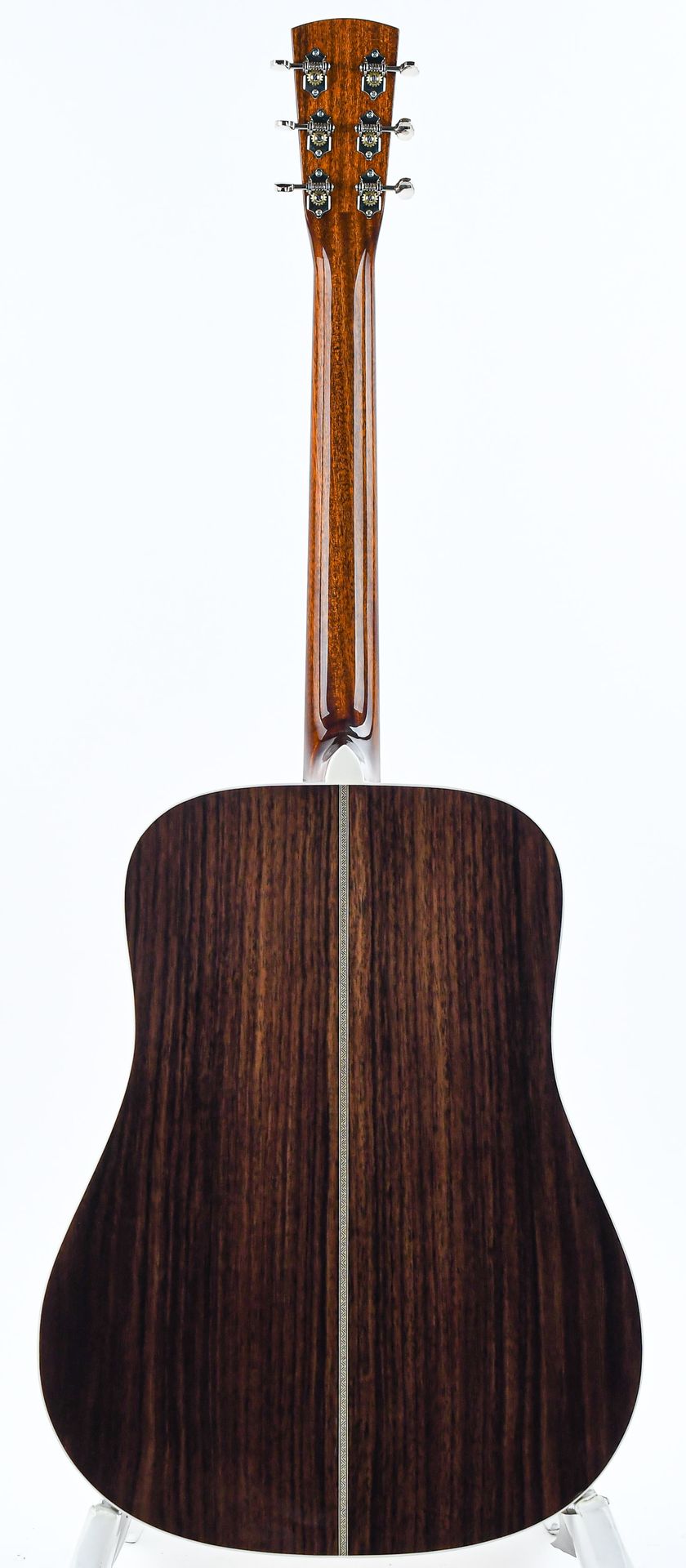 Het begint met een massief Sitka sparren bovenblad en scalloped topbraces die het vooroorlogse 'forward shifted' X-patroon respecteren. Santos palissander zij- en achterkant voegen een sterke bas toe aan het toch al volle geluid van het sparrenhouten bovenblad. De slanke mahonie hals is comfortabel en is voorzien van een 'dovetail' halsverbinding en verstelbare truss rod. Mooie uiterlijke kenmerken zijn onder meer een 'Dalmatian' slagplaat en parelmoeren hals- en kopinleg.