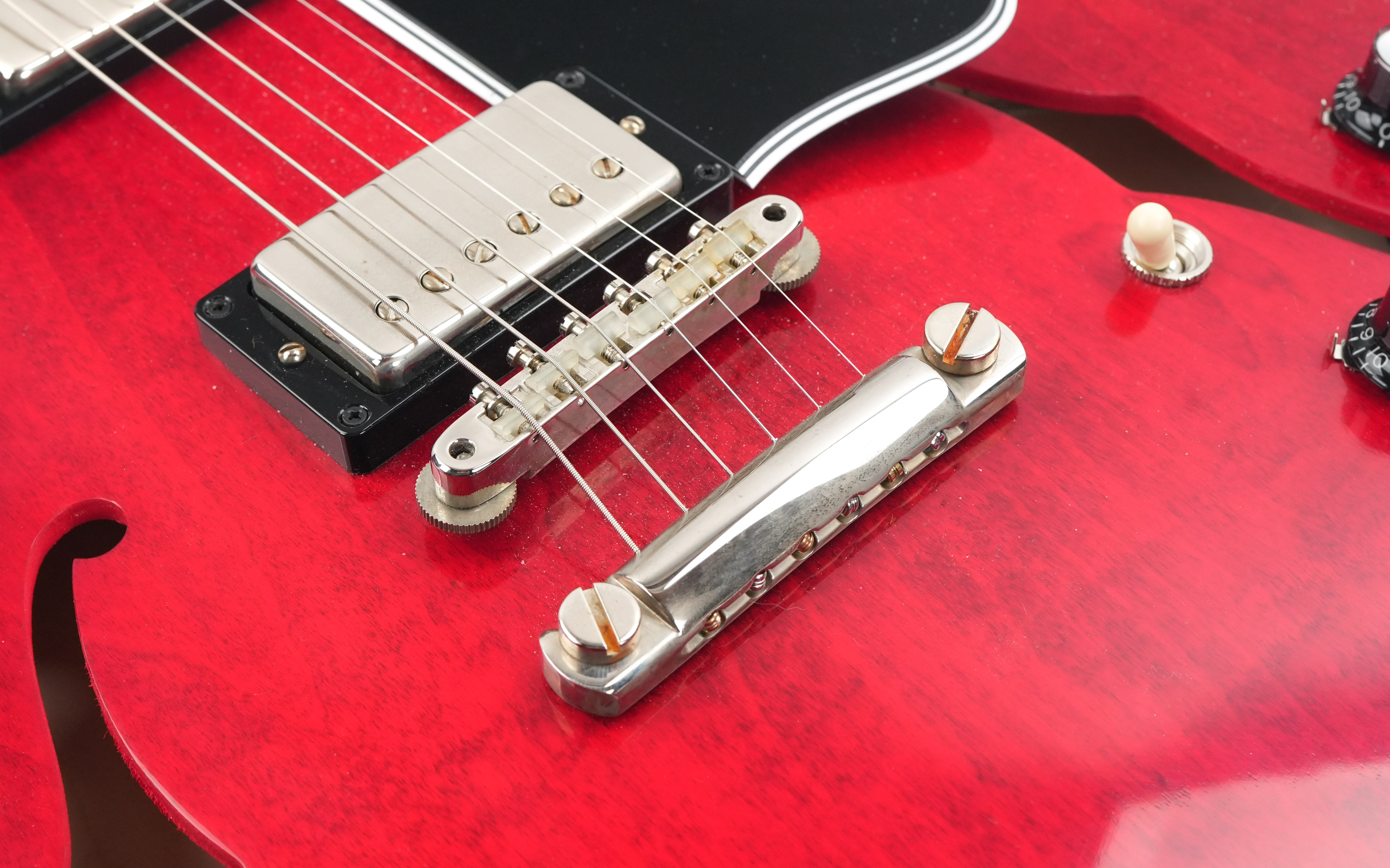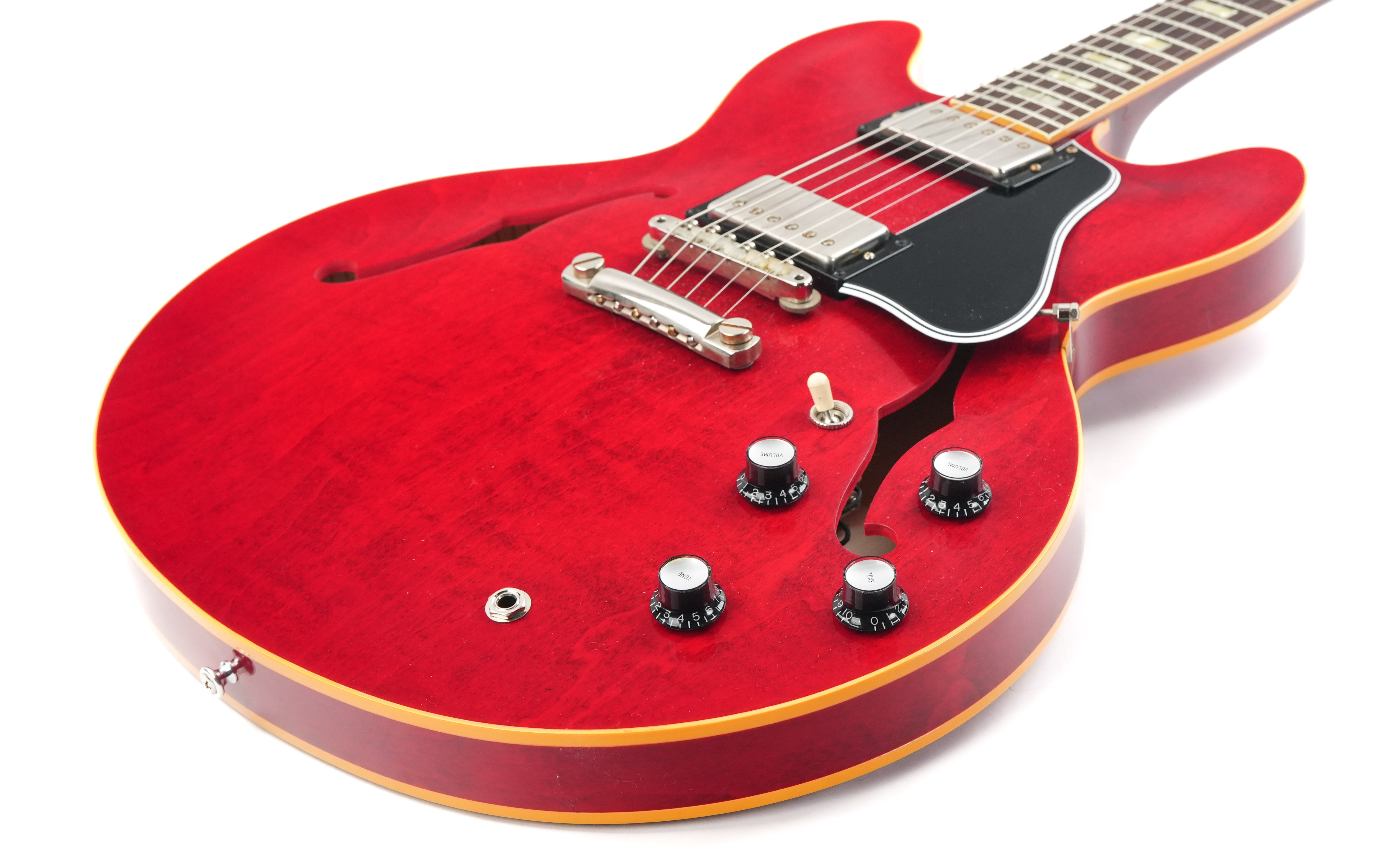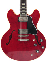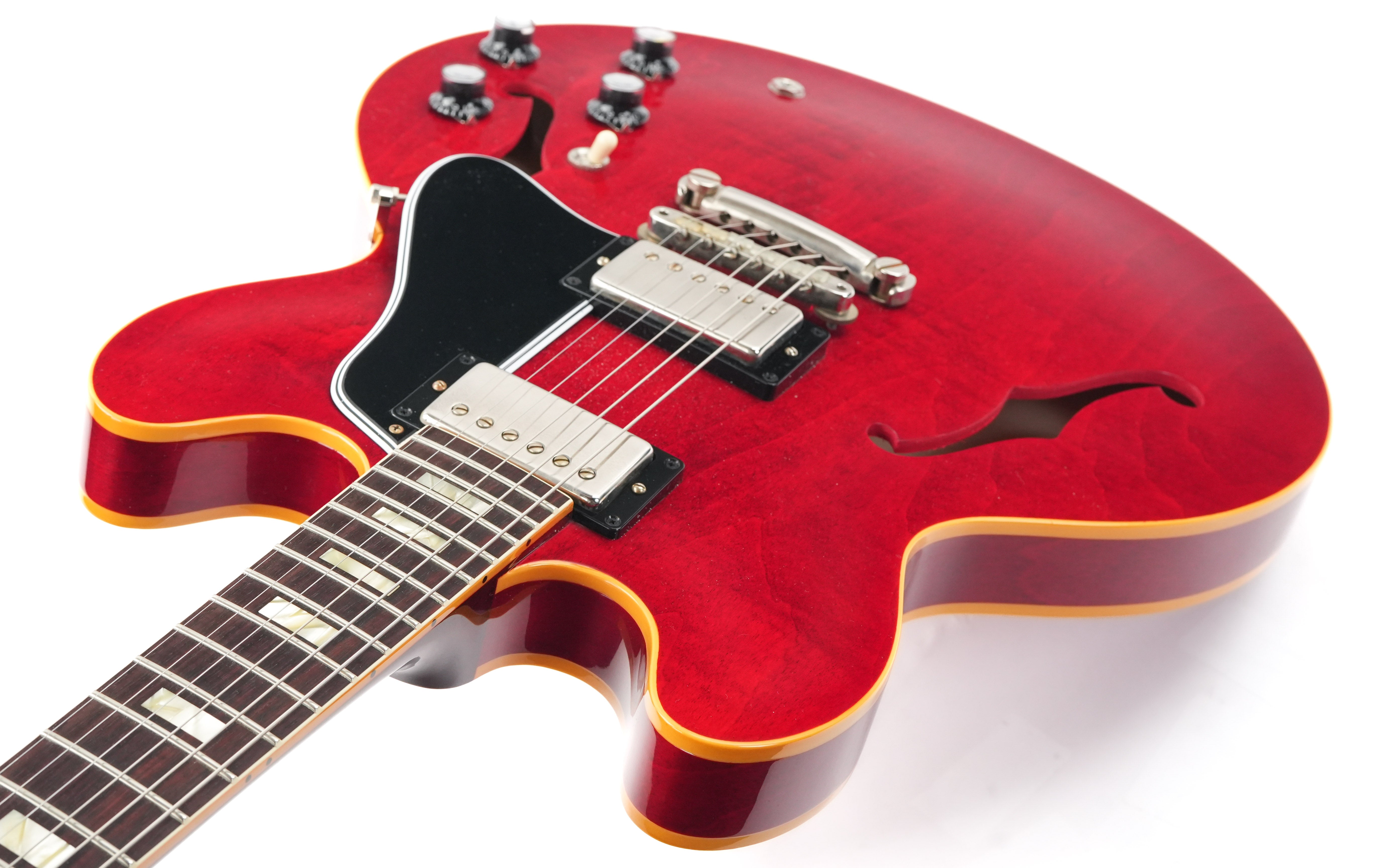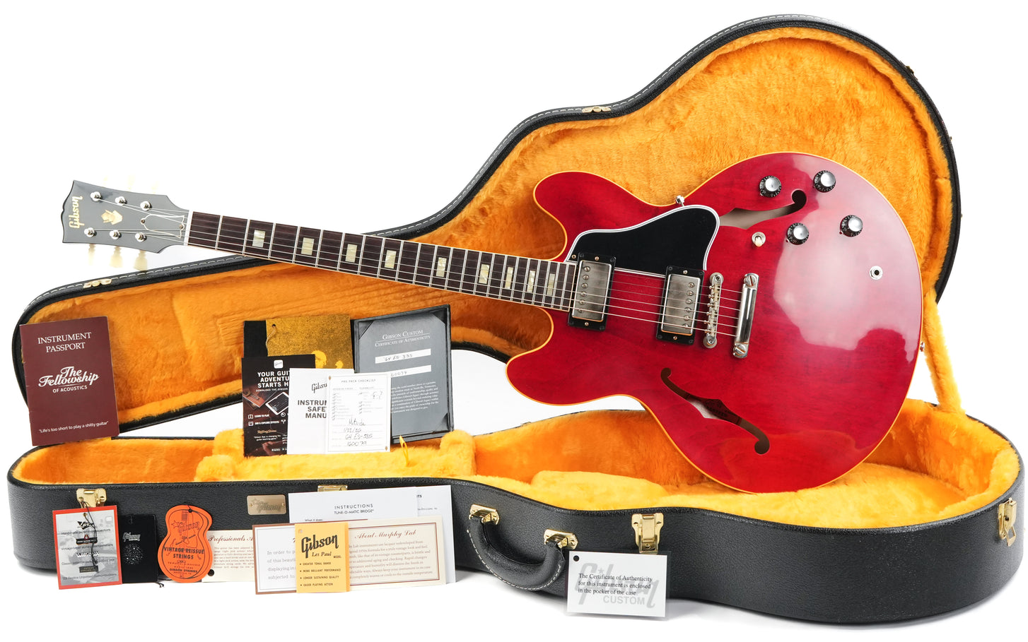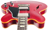 De Gibson Custom 1964 ES-335 Reissue in Sixties Cherry brengt de magie van een van Gibson’s meest legendarische semi-hollow gitaren tot leven. Na een grondige studie van originele vintage exemplaren heeft de Gibson Custom Shop elk detail, elke contour en elke kleur met indrukwekkende precisie nagebootst. Van de scherpe cutaways tot de period-correct inlays en hardware, deze reissue is een perfecte combinatie van historische authenticiteit en moderne bespeelbaarheid.De body is gemaakt van gelamineerd esdoorn met een massieve esdoorn center block, wat zorgt voor de kenmerkende helderheid en sustain van de ES-335, terwijl feedback tot een minimum wordt beperkt. De hals van één stuk mahonie met een medium C-profiel, rechtstreeks gescand van een origineel model uit 1964, voelt comfortabel en vertrouwd aan. De palissander toets met kleine block inlays maakt het klassieke uiterlijk compleet.De Custombucker Alnico III pickups zorgen voor die warme, expressieve klank die de ES-335 zo beroemd maakte—rijke middentonen, een zingende sustain en dynamiek die perfect reageert op de aanslag van de speler. Samen met de vintage-stijl bedrading en hardware levert de 1964 Reissue de authentieke sound en ziel van Gibson’s gouden tijdperk.Deze Gibson Custom 1964 ES-335 Reissue heeft een prachtige Sixties Cherry finish met VOS afwerking, wat zorgt voor een subtiel verouderd vintage karakter. Een meesterlijke combinatie van traditie en vakmanschap, en een gitaar die net zo inspirerend klinkt als hij eruitziet. Wordt geleverd in de originele koffer met TFOA-paspoort.