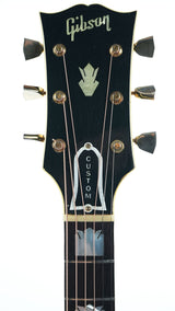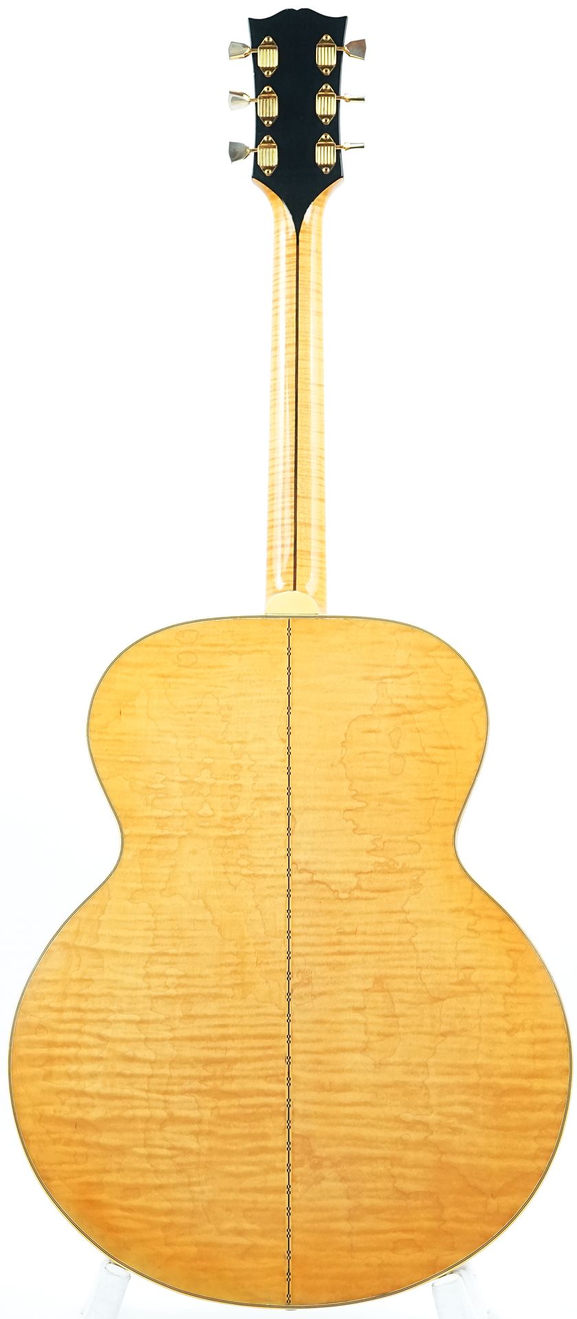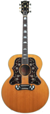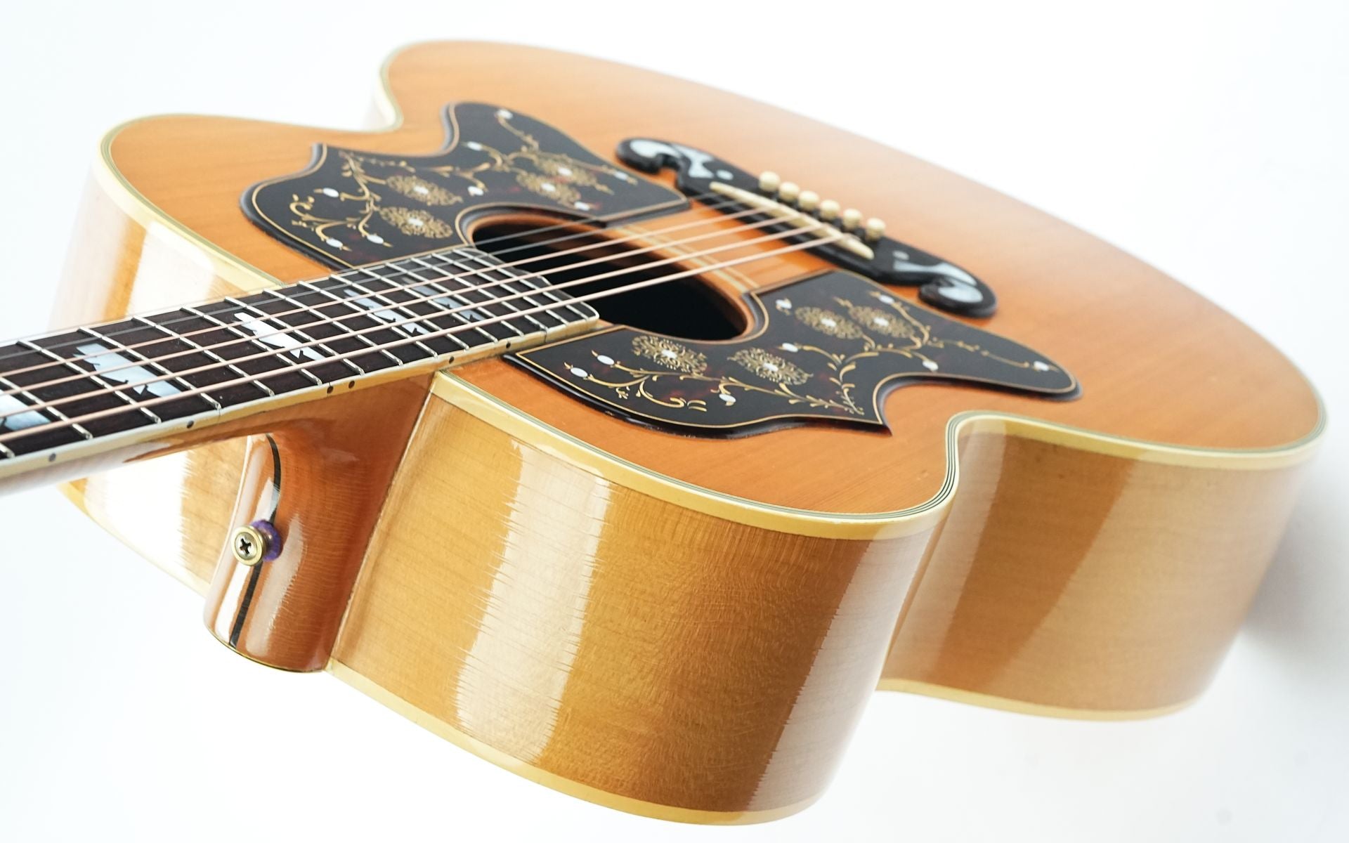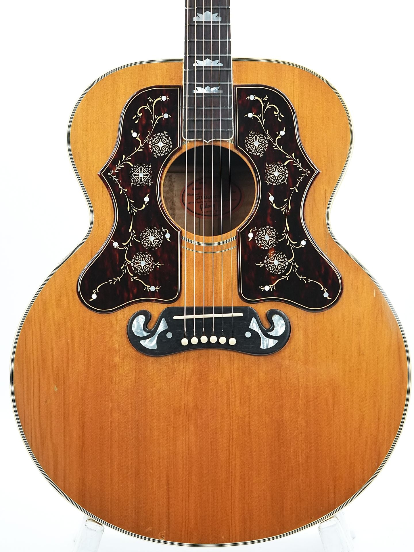 Het meest opvallende aan deze gitaar is zonder twijfel de later aangebrachte dubbele gegraveerde slagplaat, een modificatie die meteen doet denken aan de legendarische SJ200 van Bob Dylan. Deze toevoeging geeft de gitaar een uniek en imposant uiterlijk, waarbij de gravures op beide slagplaten een prachtig symmetrisch geheel vormen. Dit detail maakt deze gitaar niet alleen muzikaal bijzonder, maar ook visueel een buitenbeentje binnen de J200-familie, met een duidelijke link naar de folk- en rockgeschiedenis.