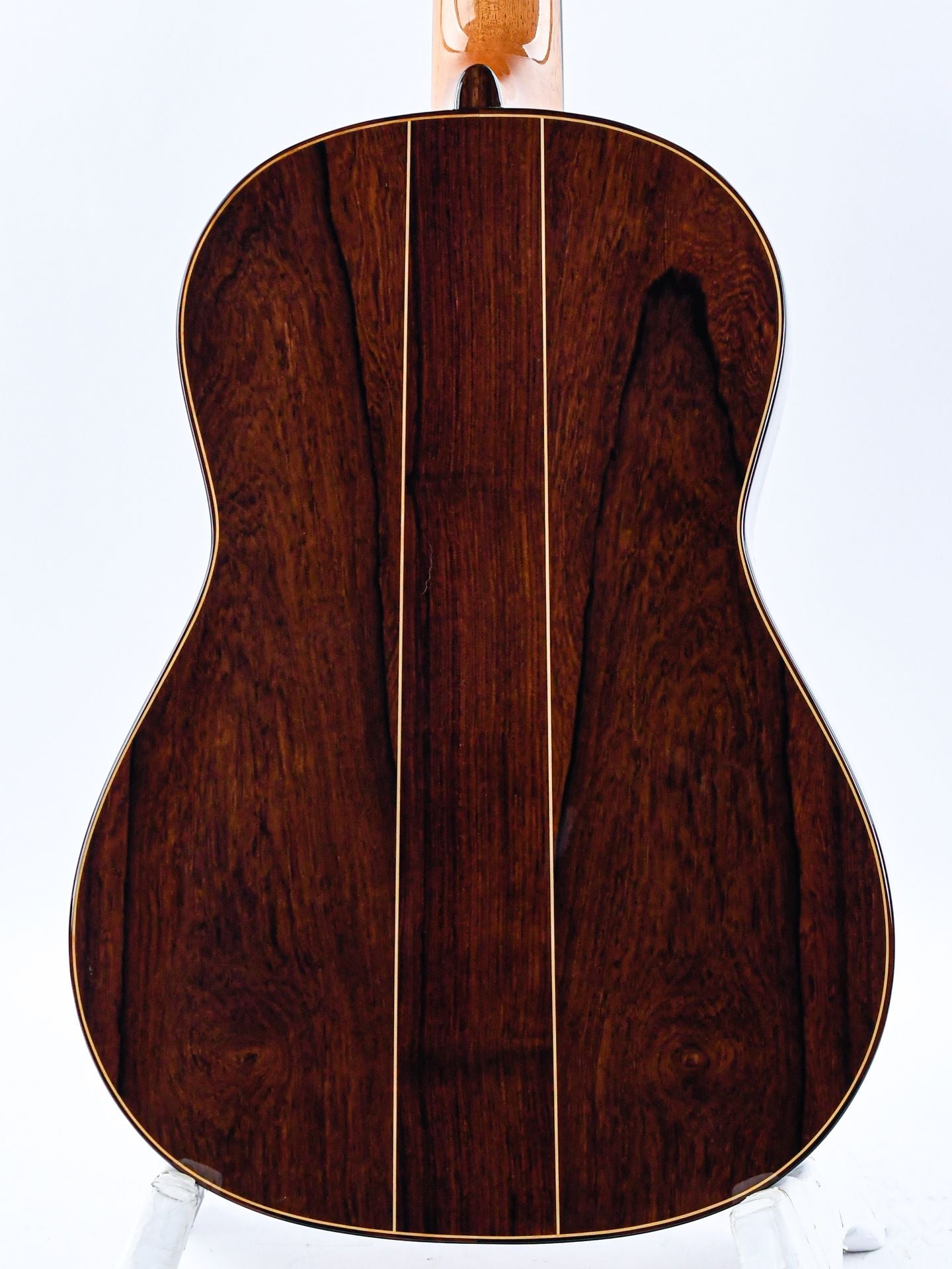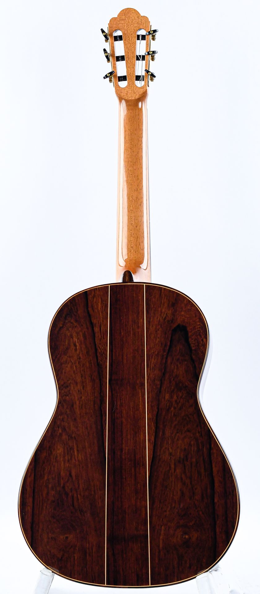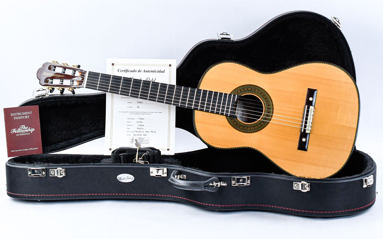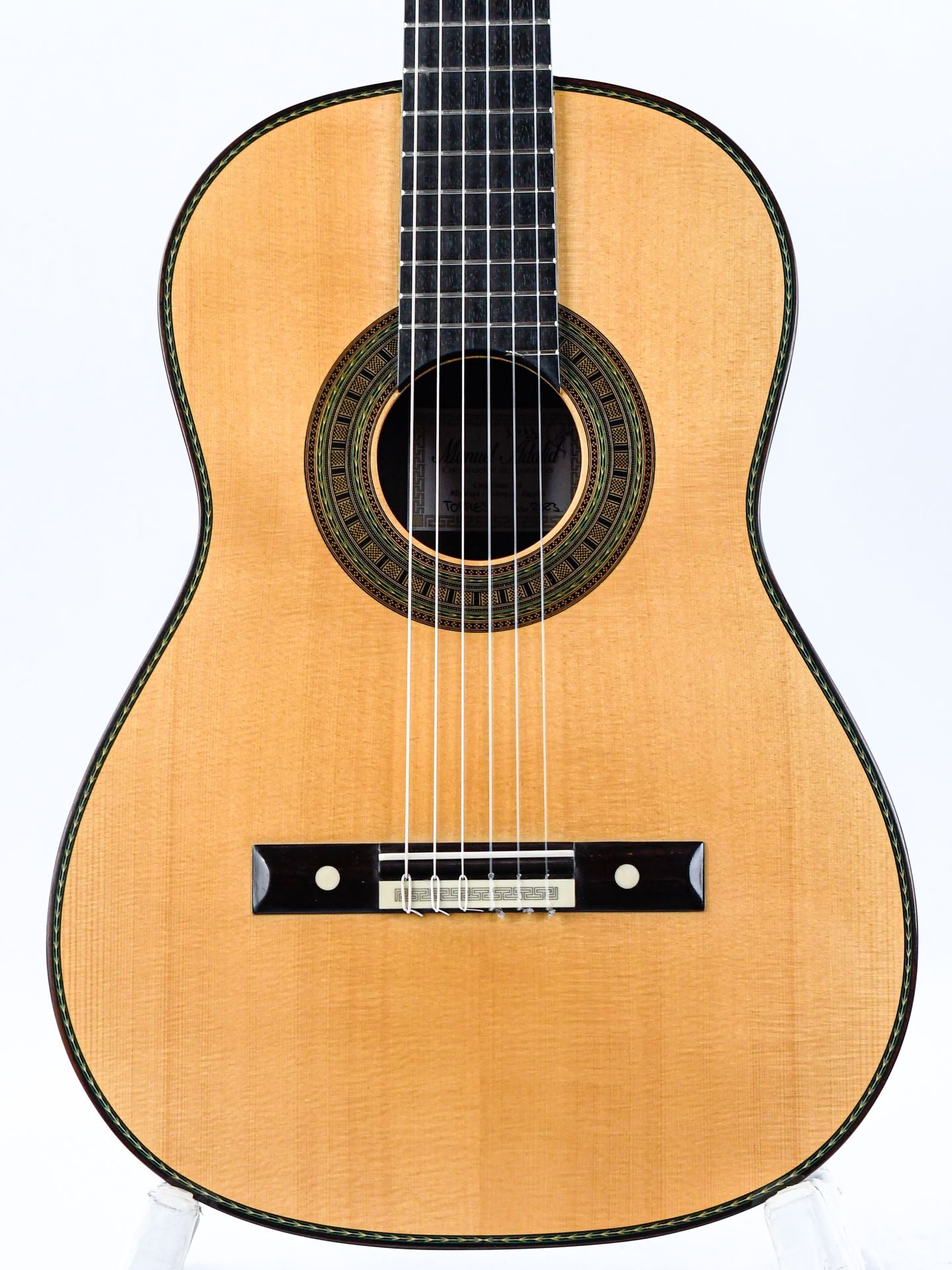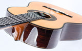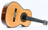 Manuel Adalid, een gerenommeerde Spaanse gitaarbouwer, groeide op in een familie van gitaarbouwers, met zijn vader, Manuel Adalid Lázaro, evenals Francisco Esteve Calatayud en Antonio Monfort, als zijn leraren in het vak. Door zijn levenslange passie voor het vak is Adalid een gerespecteerd figuur geworden in de wereld van de gitaarbouw, en heeft hij een blijvende impact op het veld achtergelaten.Deze Manuel Adalid "Torres" gitaar is een prachtig instrument dat een eerbetoon is aan de legendarische Antonio de Torres gitaar in de moderne tijd. De gitaar heeft een prachtig sparren bovenblad en opvallend Indisch palissander achter- en zijkanten. Het sparrenhouten blad is afgewerkt met French Polish, waardoor het er glad en glanzend uitziet, terwijl het hout vrij kan vibreren en een rijke, complexe klank produceert. Ondertussen zijn de achterkant en zijkanten afgewerkt met Nitrocellulose, een hoogwaardige afwerking die de duurzaamheid verhoogt zonder in te leveren op toon of resonantie.Qua geluid vangt de Manuel Adalid "Torres"-gitaar de essentie van de vroege 20e-eeuwse Spaanse gitaarkenmerken met zijn al artistieke kwaliteit. De gitaar heeft een warme en evenwichtige toon met uitstekende projectie en sustain, waardoor het een ideaal instrument is voor klassieke gitaristen die het traditionele Spaanse geluid willen. Deze gitaar is het bewijs van de vaardigheid en het kunstenaarschap van de maker en een prachtig eerbetoon aan de nalatenschap van Antonio de Torres.