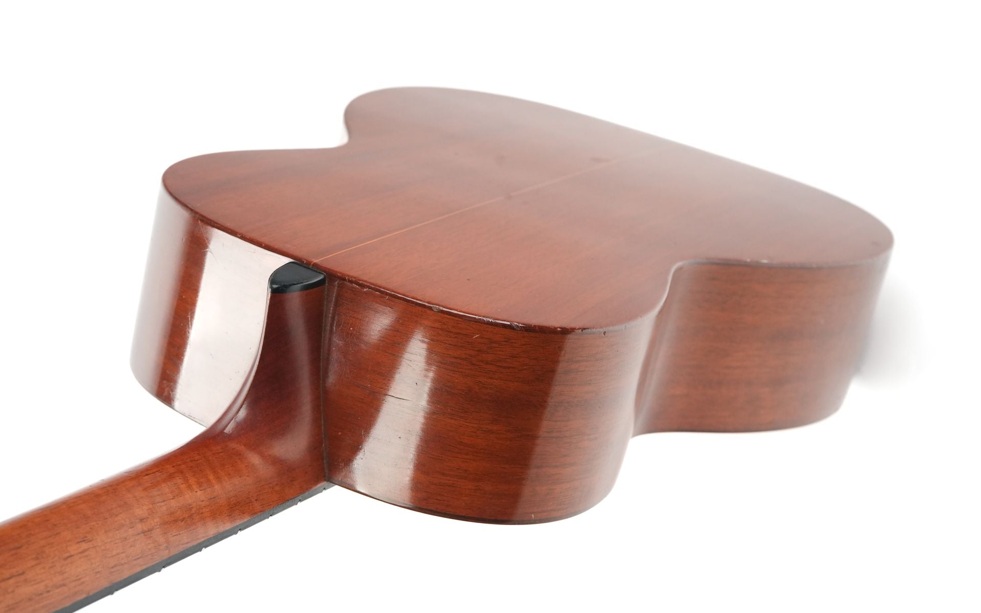 Deze Martin 017 is gebouwd in 1911, en dit is moeilijk te geloven als je de prachtige conditie van de gitaar ziet. De lak van de gitaar glanst prachtig, en toont met craquelé en speelsporen zijn gevorderde leeftijd op ingetogen wijze. Achter de niet originele brug is de center seam van het bovenblad gestabiliseerd met twee cleats aan de binnenzijde van de klankkast. Hier zien we ook dat er ooit een extra plaatje naast de bestaande smalle esdoorn brugplaat is aangelijmd, en dat laatstgenoemde is gerepareerd met nieuw ingezette stukjes voor een optimale verankering van de snaren.