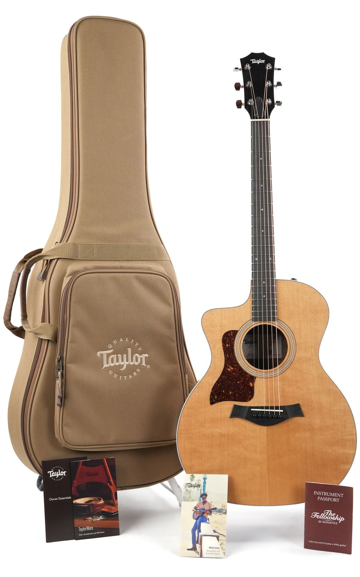 De gitaar is voorzien van een strakke witte binding, een drieringsrozet en een Venetiaanse cutaway voor gemakkelijke toegang tot de hogere noten op de toets. Inclusief een Taylor-gitaartas.