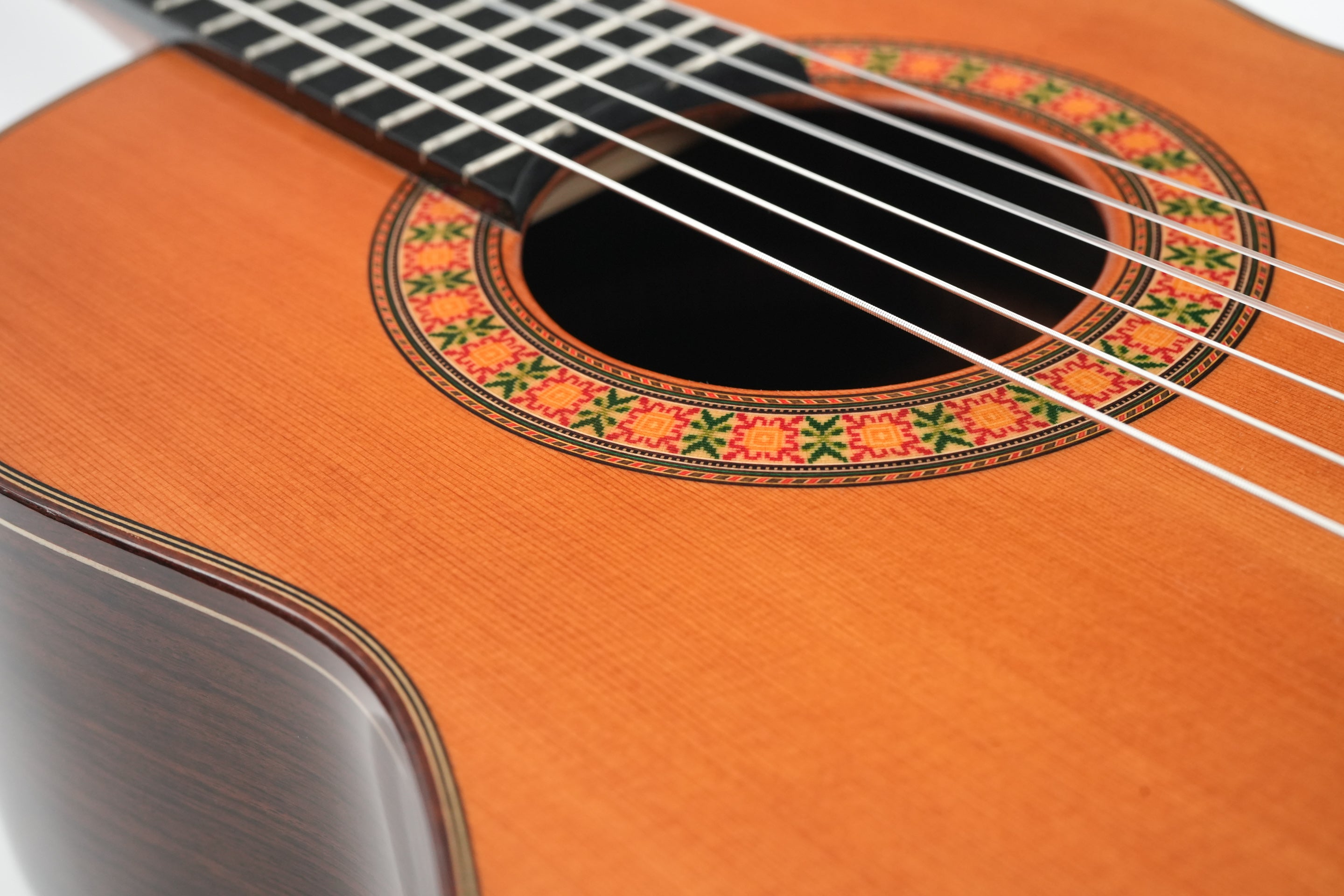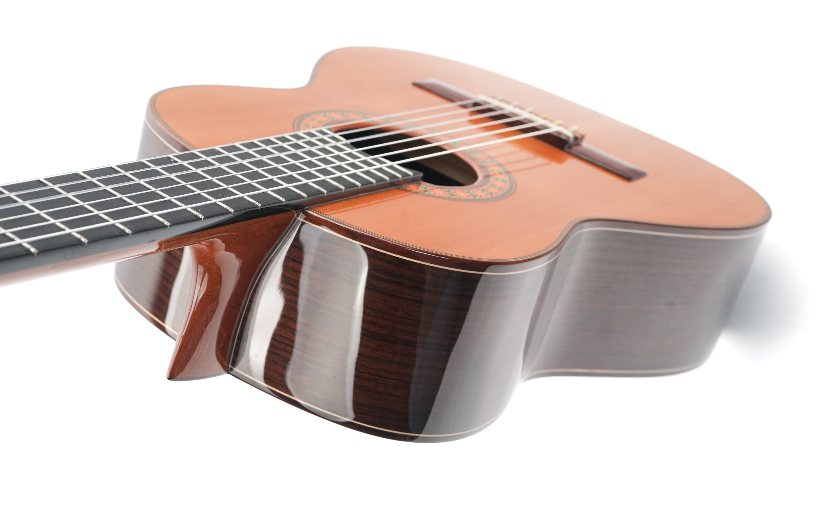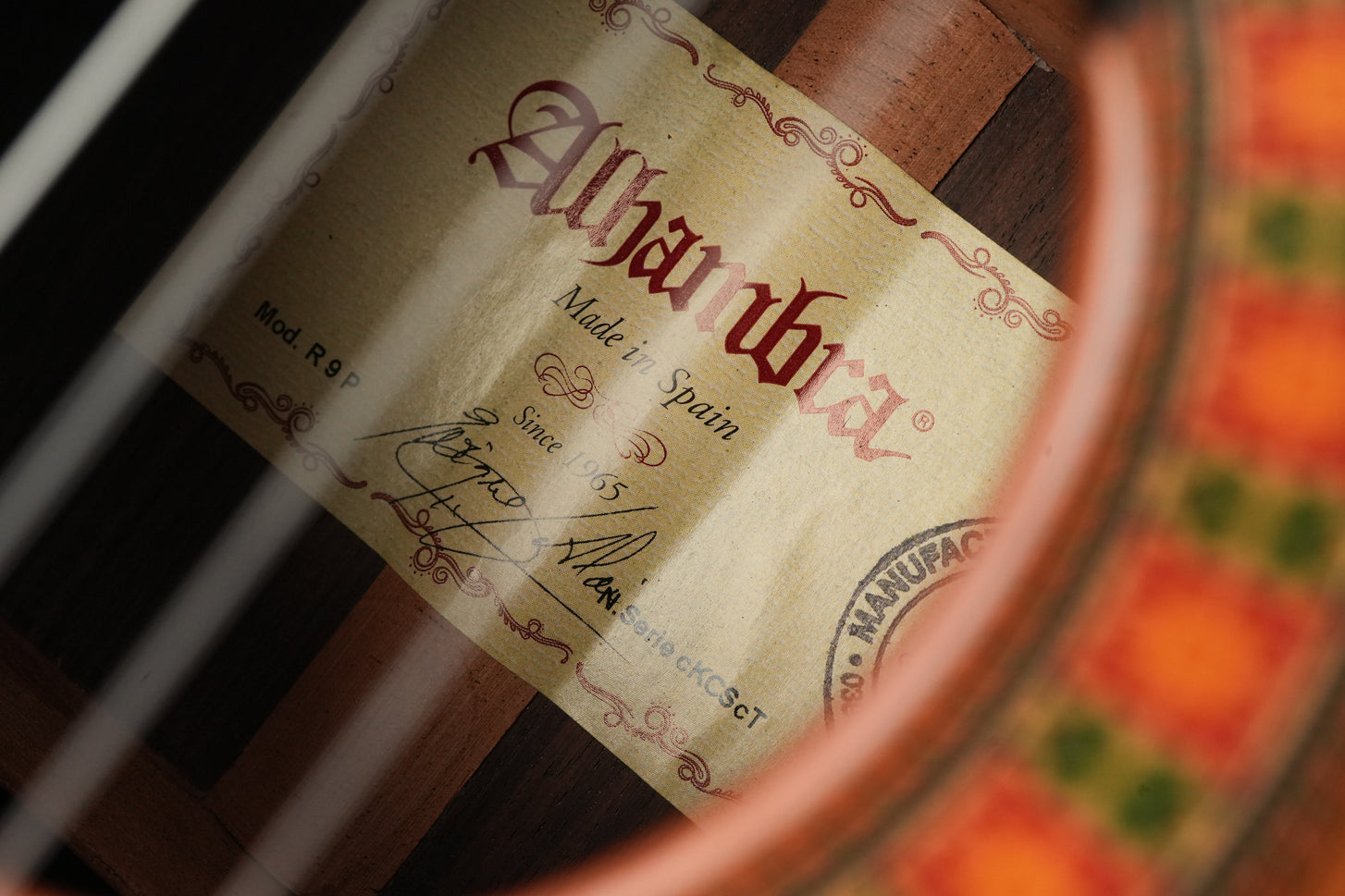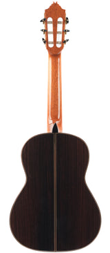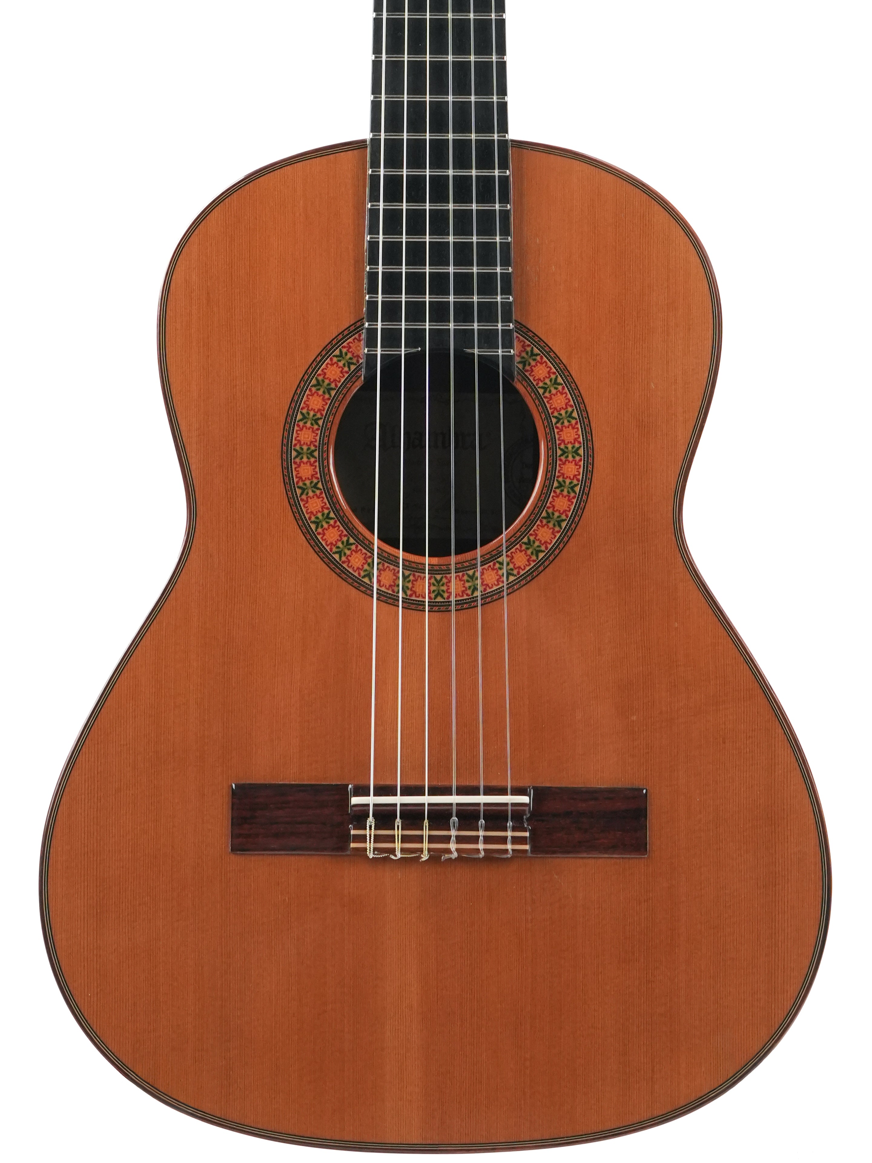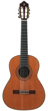 The Alhambra R9P 1/2 Size is a smaller-sized guitar and is a Requinto model. These guitars are tuned higher than regular guitars and feature a deeper body than regular 1/2 Size guitars, producing a high volume. They are excellently suited as accompaniment instruments and are used in Trío romántico groups in Latin music.But the richness of the sound is not the only top quality of this guitar: the action is also sublime; high enough to make the guitar sing, yet extremely comfortable. And the sound projection is perfect: basses, midtones, and trebles are fully balanced thanks to the Indian rosewood body with a cedar top.This 2024 Alhambra is in very good condition. The bridge has been re-glued, and there are minor lacquer imperfections visible on the side of the neck resulting from improvised position markers. Furthermore, we find several small dings on the top, along with some light buckle wear on the back of the body.The guitar comes with a TFOA passport in a hardshell case.