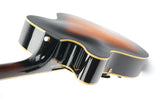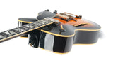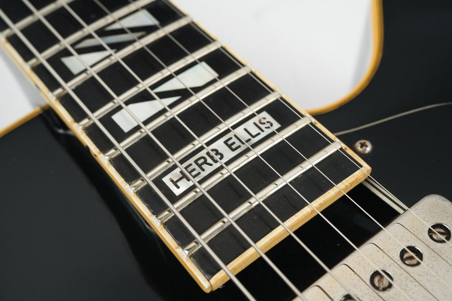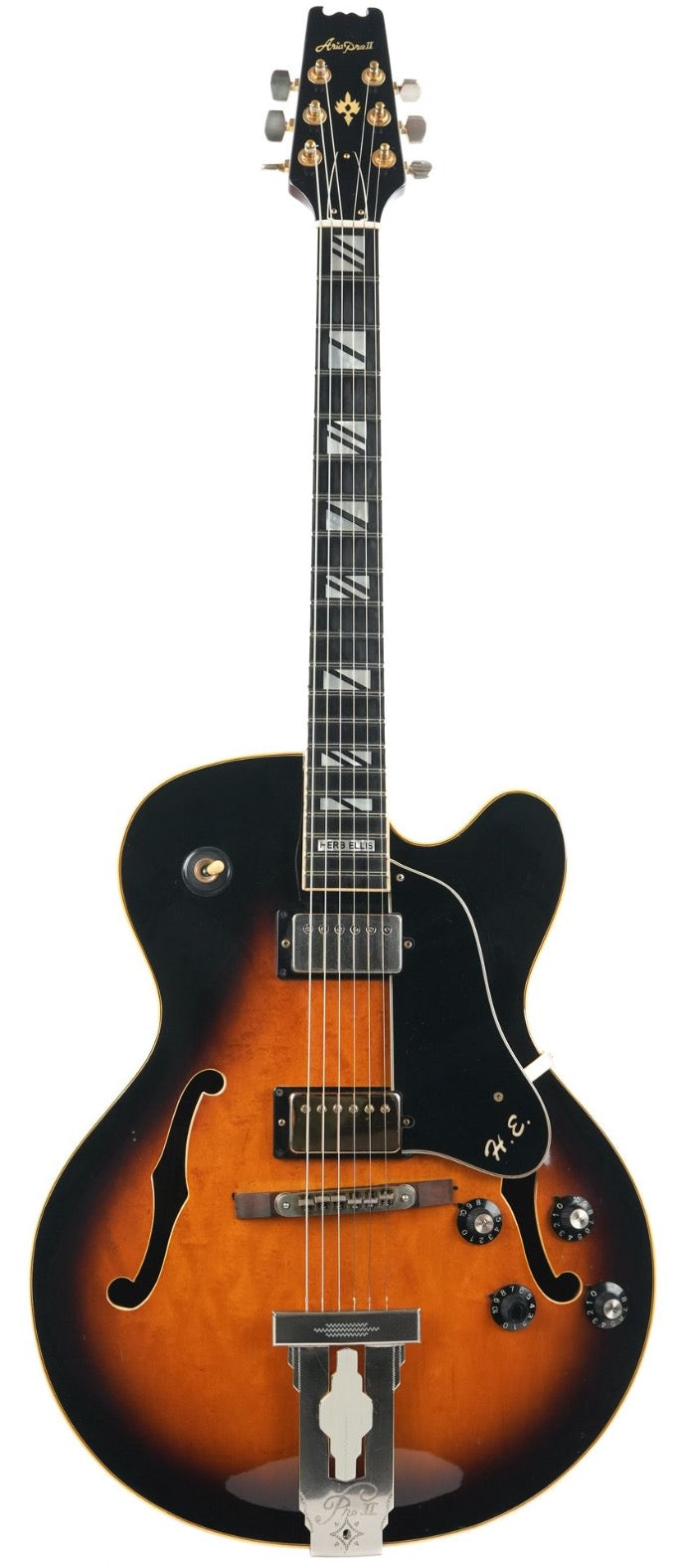 This 1983 Aria Pro II PE-175 Herb Ellis Signature Model features a maple body with cream binding, two bound f-holes, and a mahogany neck. It has a 20-fret ebony fingerboard with a “Herb Ellis” inlay at the 19th fret, three-per-side tuning machines, a rosewood adjustable bridge, an engraved “Pro II” tailpiece, and a laminated black pickguard with “H.E.” initials.