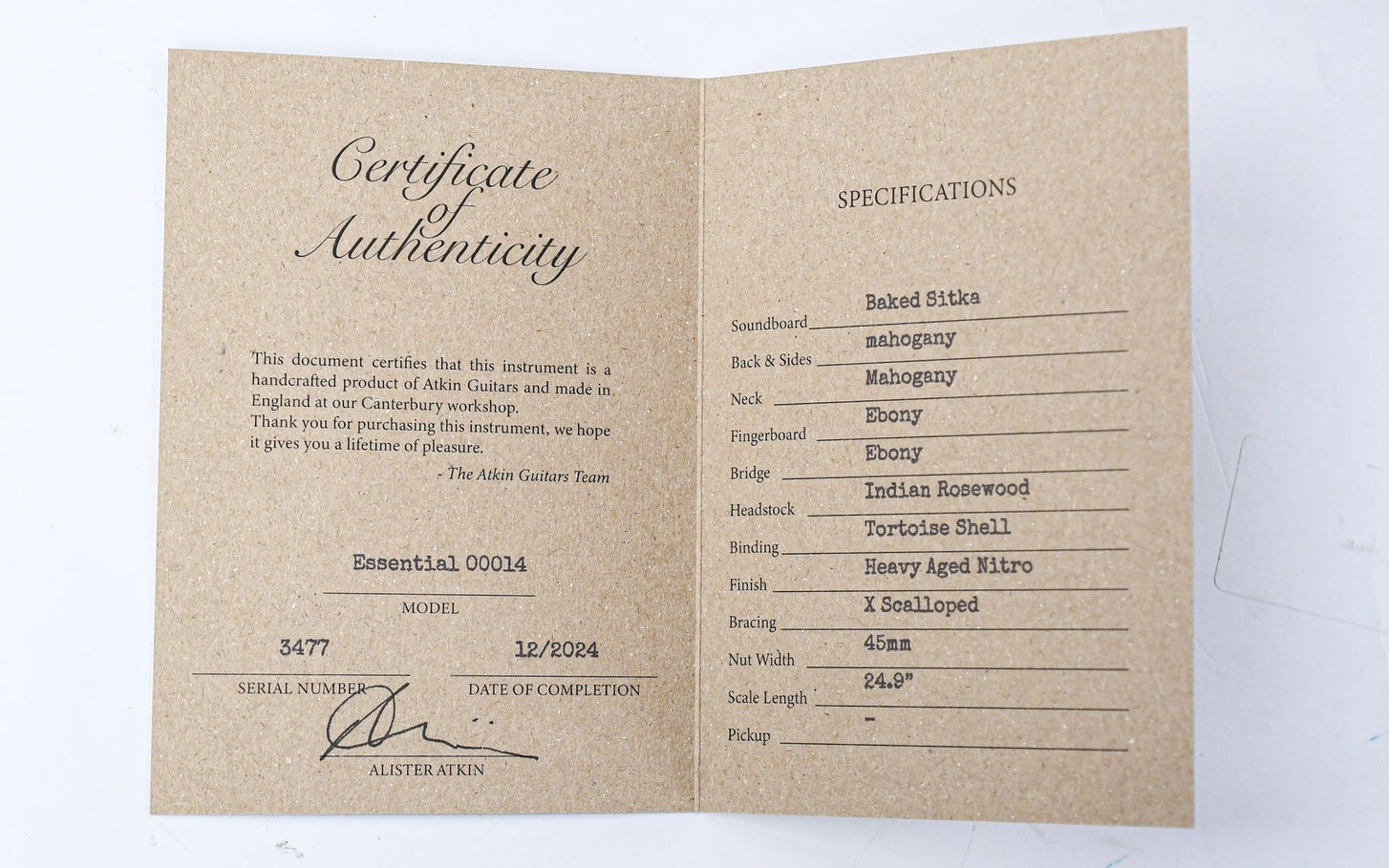 The 000 is part of Atkin's Essential Series. The guitars in this series all feature a Baked Sitka spruce top, a mahogany soundboard and an ebony fingerboard and bridge.