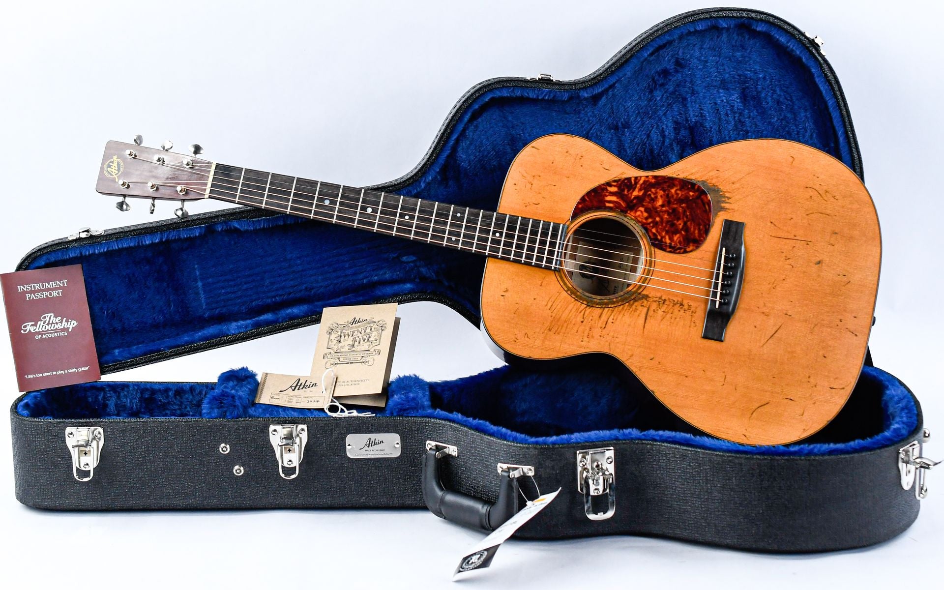 Atkin Guitars was founded in 1995 in Canterbury, England. Alister Atkin started as a one-man company, and as such built a few handmade guitars a year. Gradually, due to the great success of the guitars, the company expanded to seven employees, but the guitars have always remained handmade. The Atkin Essential 000 is a guitar that perfectly embodies Atkin's philosophy; a lightly built guitar where the tone is central.