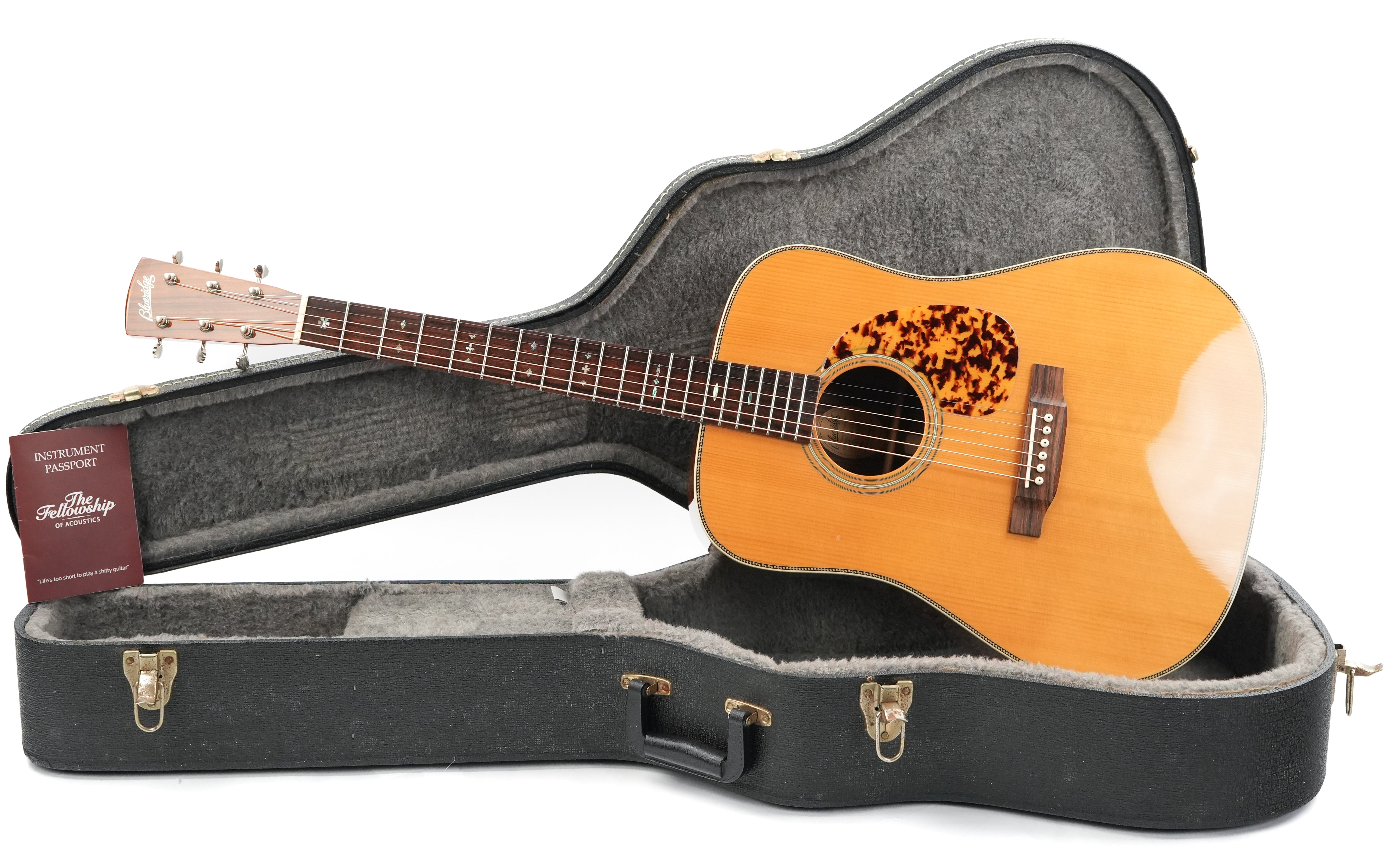 This vintage-inspired Blueridge dreadnought has it all! The great sound and great looks of the BR160 are just part of what makes it a prized vintage-style acoustic guitar. And the price is exceptionally competitive as well!It starts with a solid Adirondack spruce top that produces enormous volume with its scalloped X-braces. Santos rosewood sides and back add a strong bass to the already full sound of the spruce top. The slim mahogany neck is comfortable and features a dovetail neck joint and adjustable truss rod. Nice cosmetic features include a Dalmatian pickguard and mother-of-pearl neck and headstock inlays.This 2014 Blueridge has two dings on the top, along with an elongated scratch on the back of the body. Additionally, there are two dings at the end of the headstock, but the guitar is otherwise exceptionally clean. Comes with TFOA passport in a case.