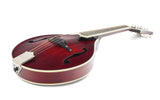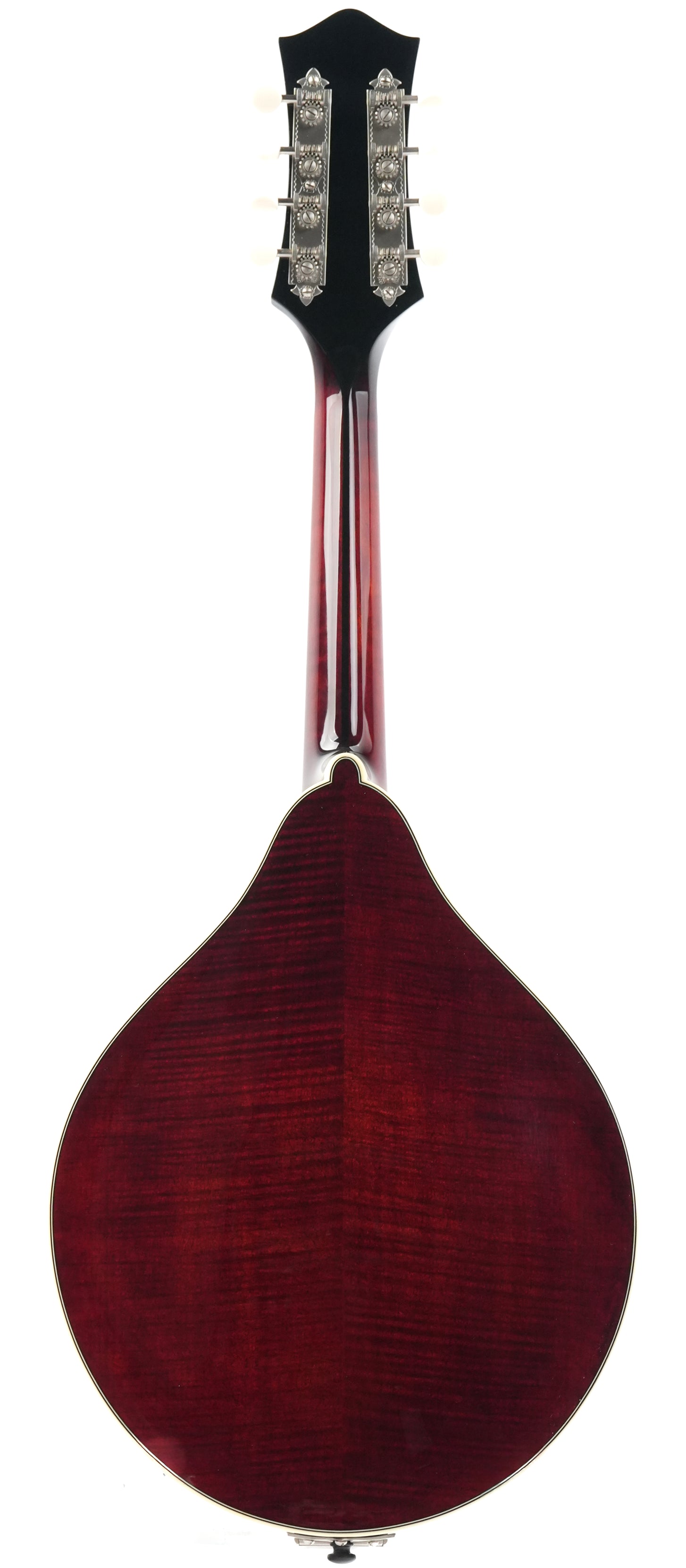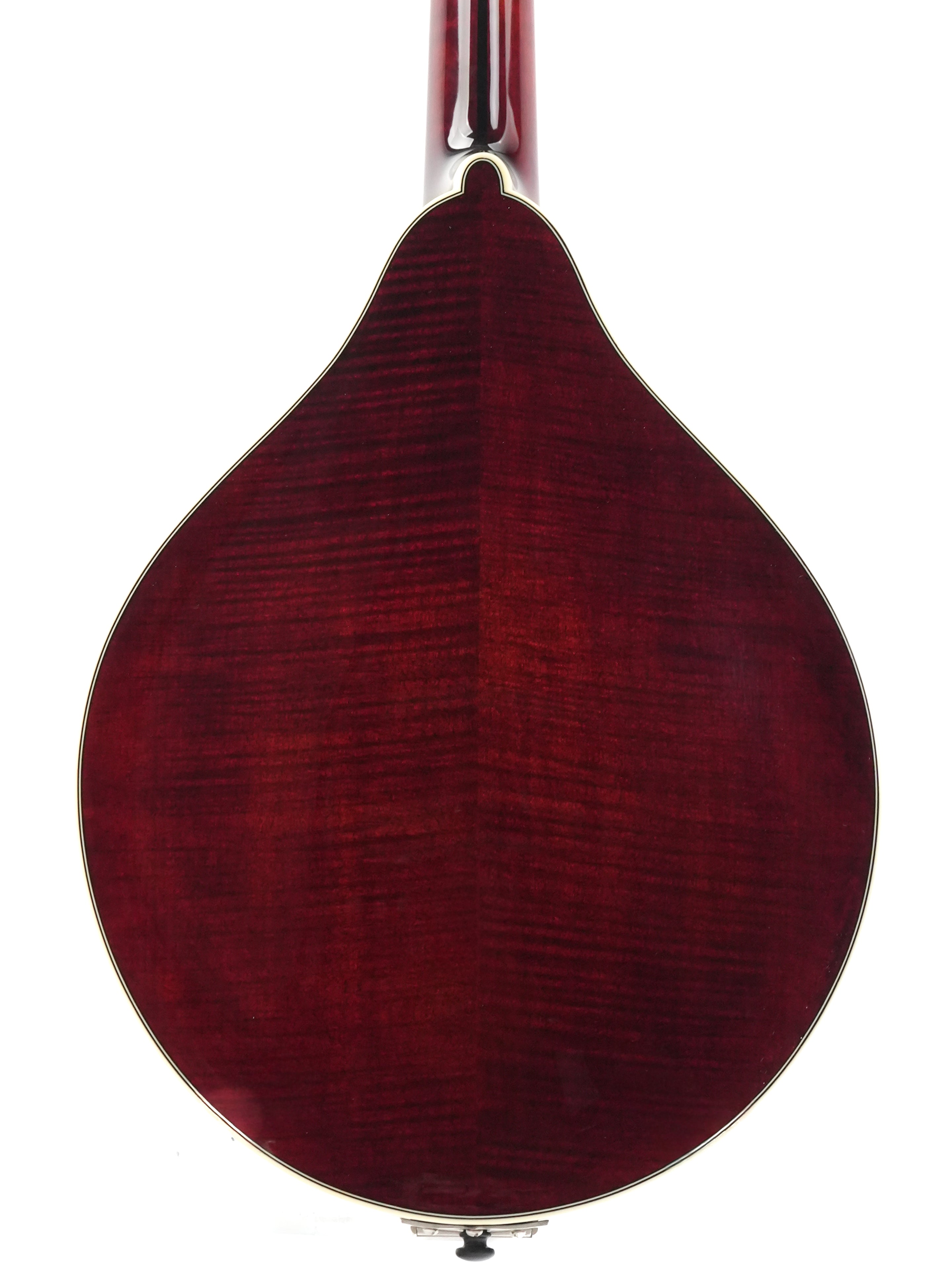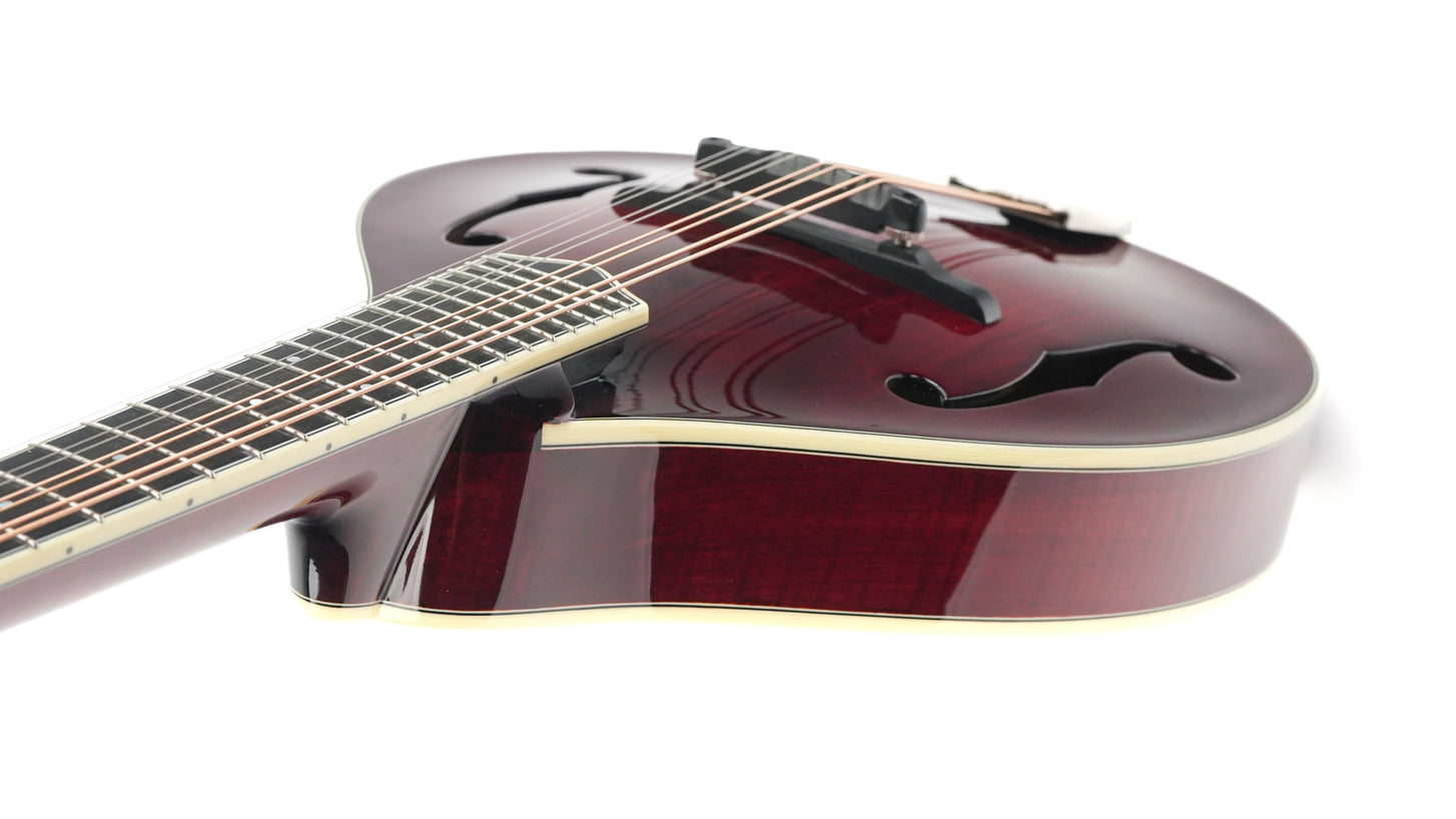 The finish is a beautiful deep Cordovan Red, and the stylish matte Bill James tailpiece adds some extra flair to the mandolin, which is further adorned with ivoroid binding. Flamed Aged Tone European maple was chosen for the neck, and together with the ebony fingerboard, it offers delightful playing comfort.