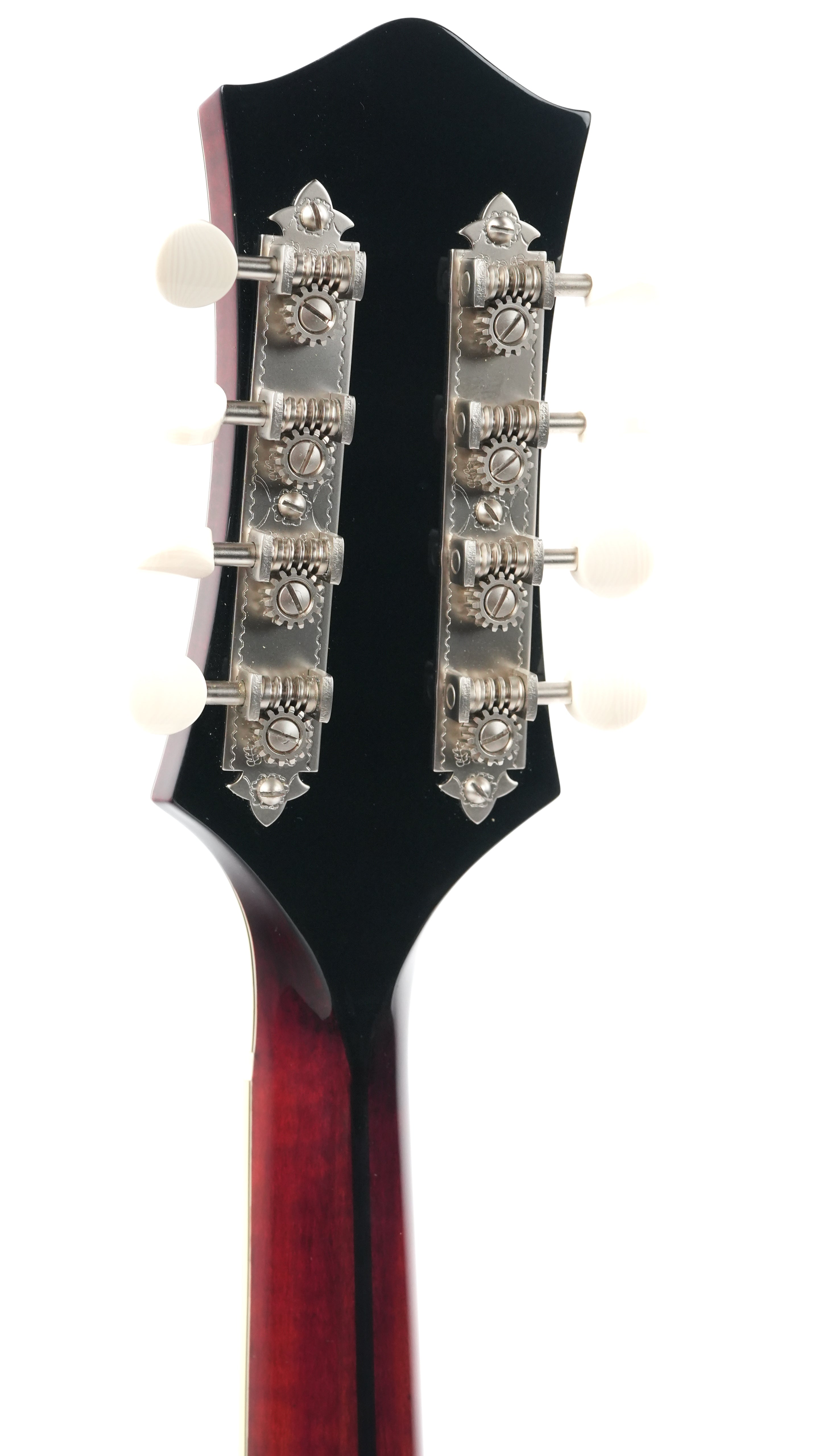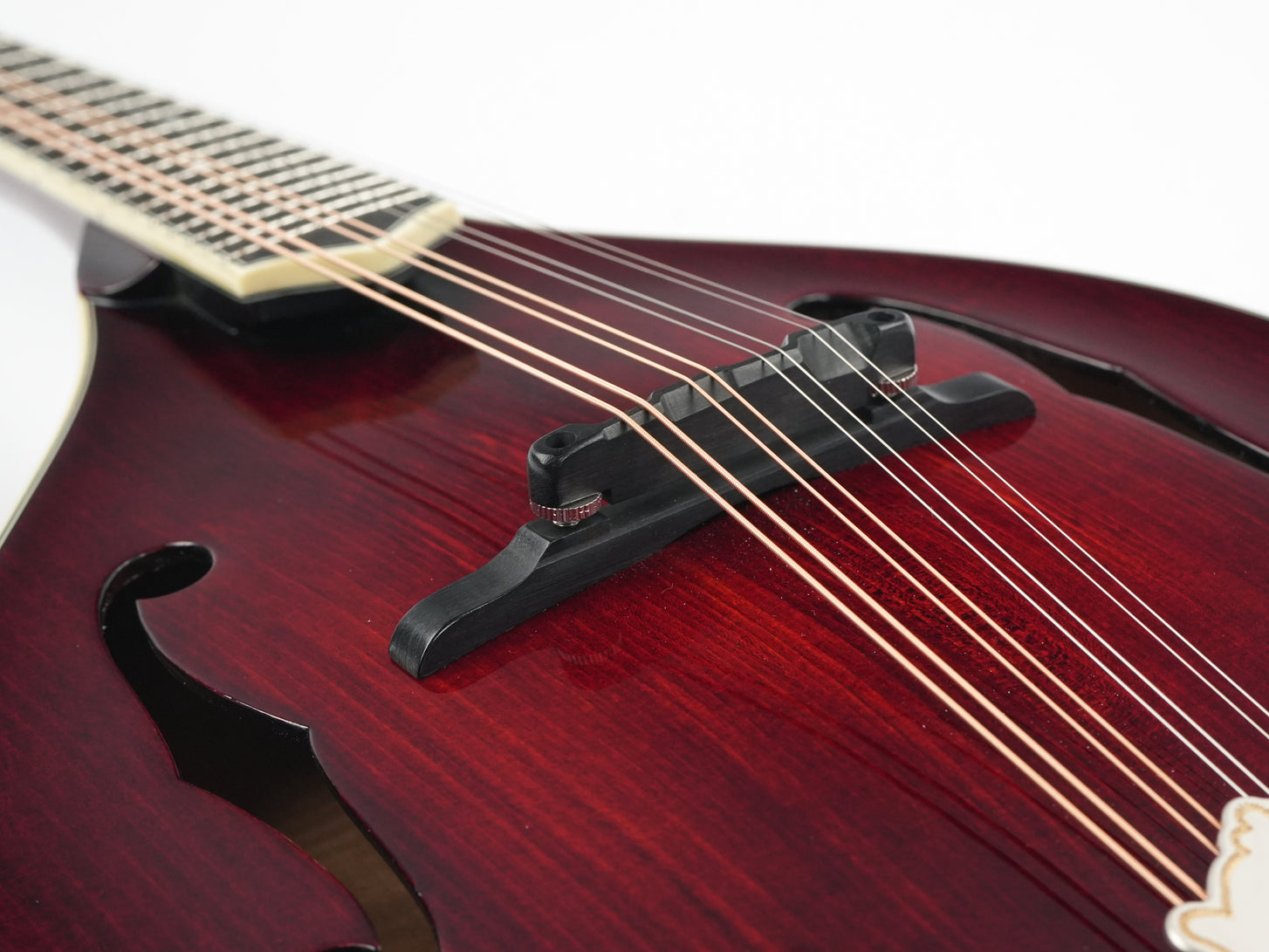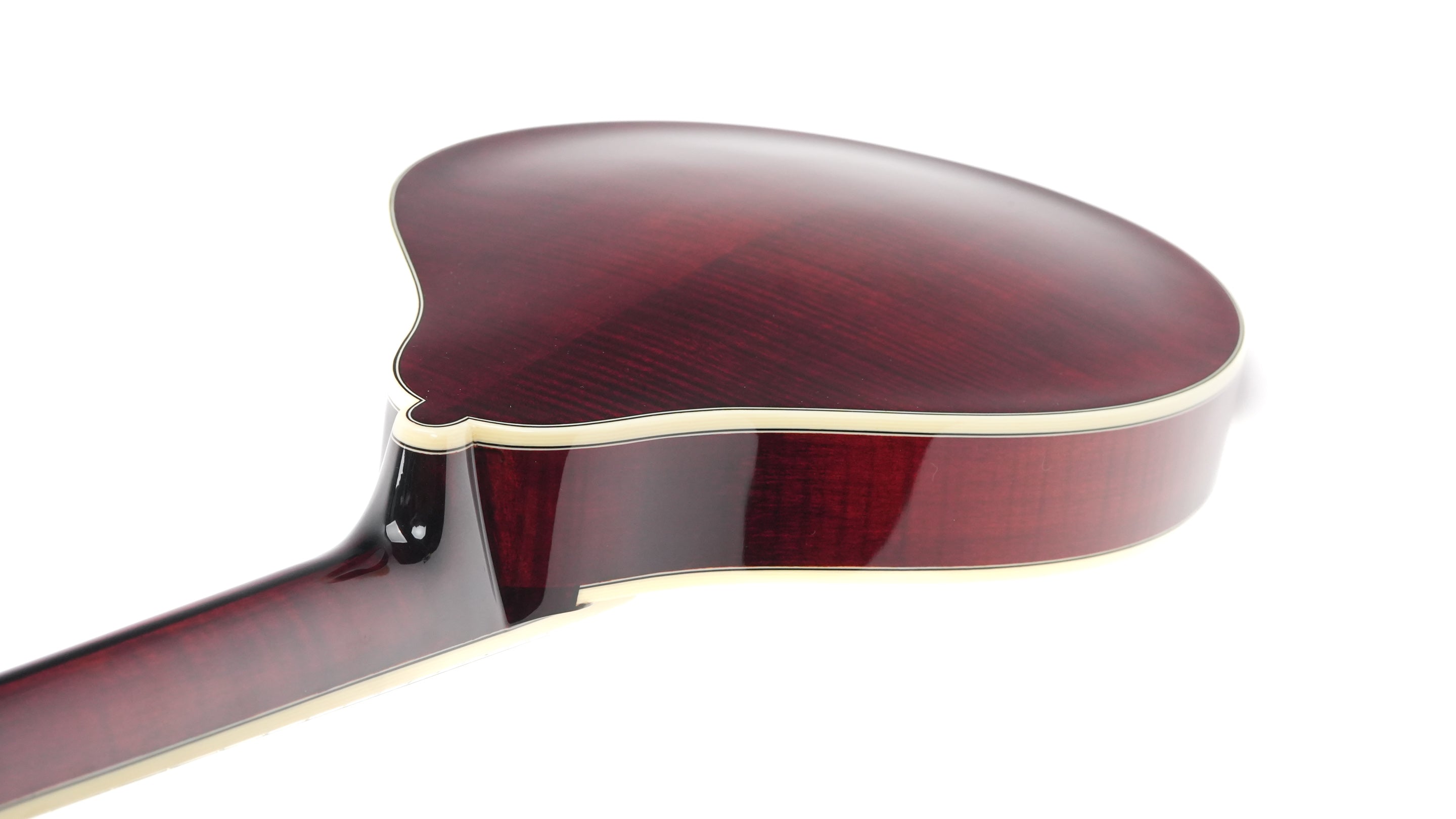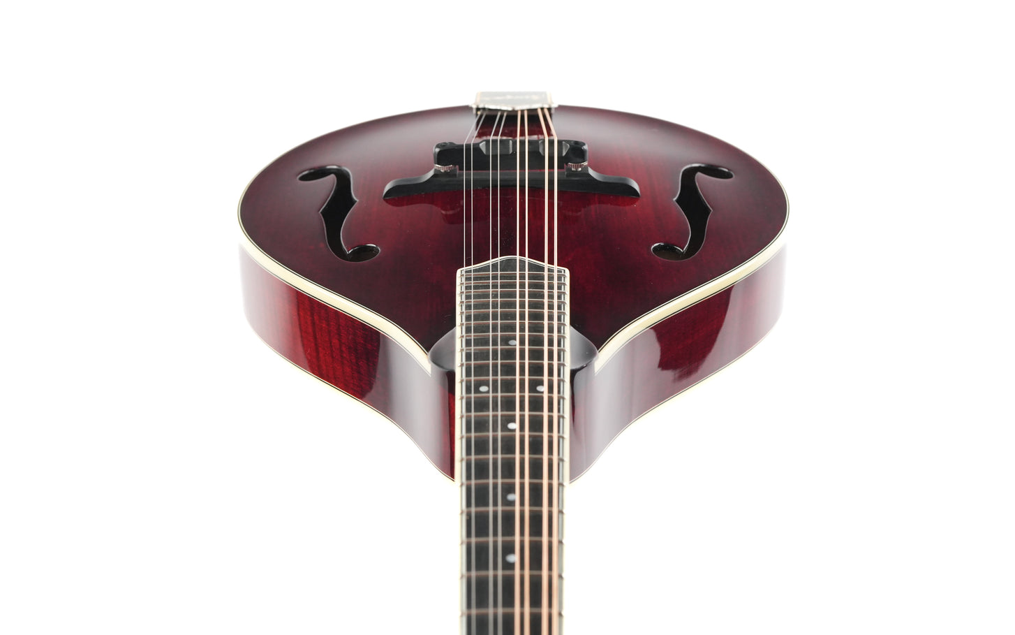 The finish is a beautiful deep Cordovan Red, and the stylish matte Bill James tailpiece adds some extra flair to the mandolin, which is further adorned with ivoroid binding. Flamed Aged Tone European maple was chosen for the neck, and together with the ebony fingerboard, it offers delightful playing comfort.