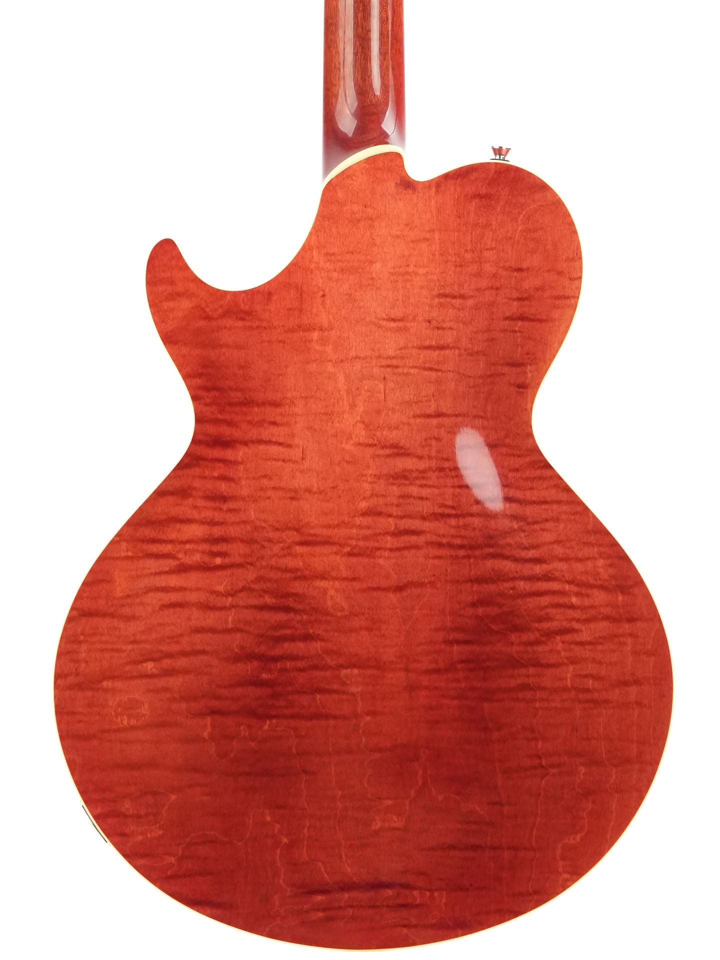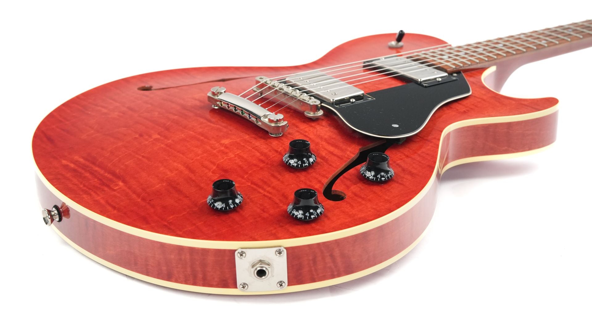 The SoCo LC features a 15" wide single cut semi hollow body with a carved laminated maple top and body. A maple center block and long neck tenon are integrated into the body to improve sustain and tonal transfer compared to more traditional semi hollow designs. The ergonomically shaped heel also provides comfortable access to the higher frets.