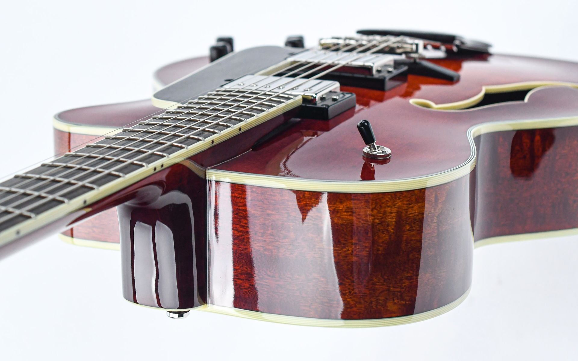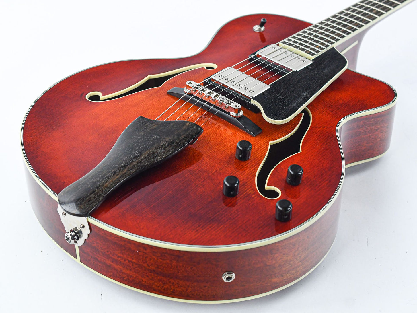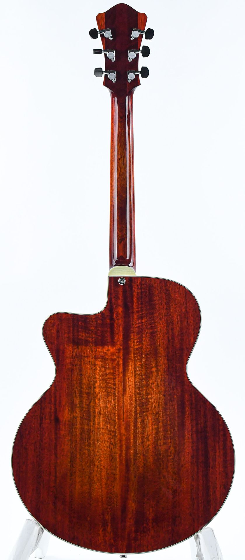 The choice of tonewoods and the time honored processes followed to craft these guitars create an organically acoustic tone that is seldom matched. Chords are full and complex while single notes are crisp and well defined. The fully hollow body design with a solid mahogany body and solid spruce top provide this deep resonant tone while the mahogany neck with a 'traditional even C' profile ensures a comfortable playability.
