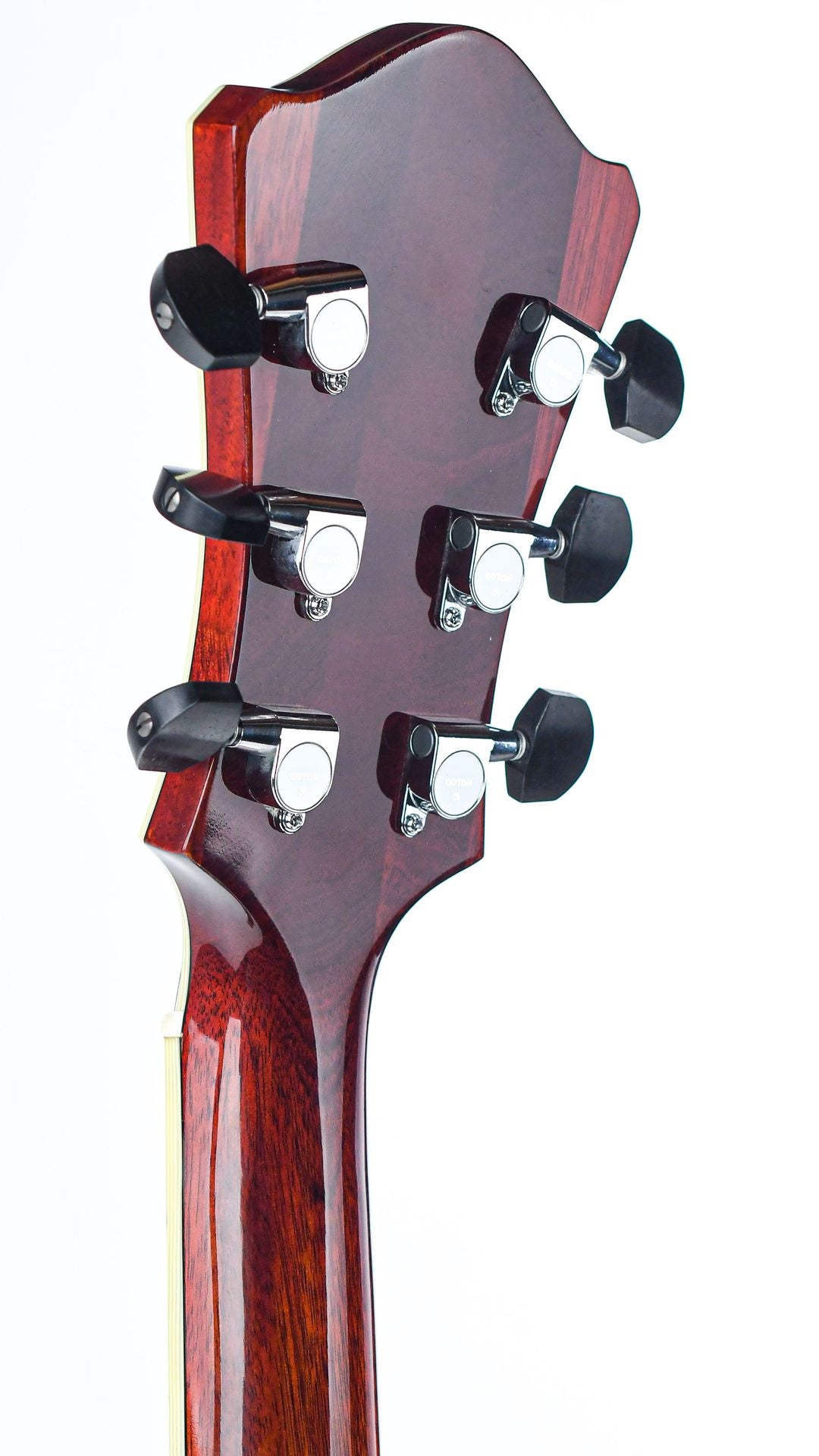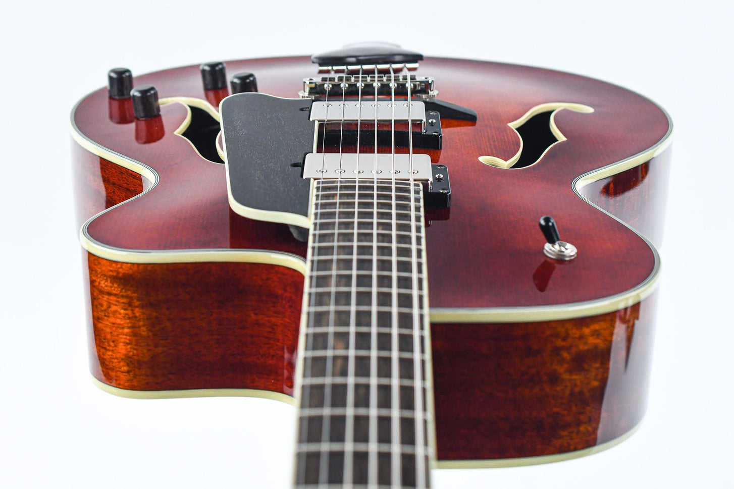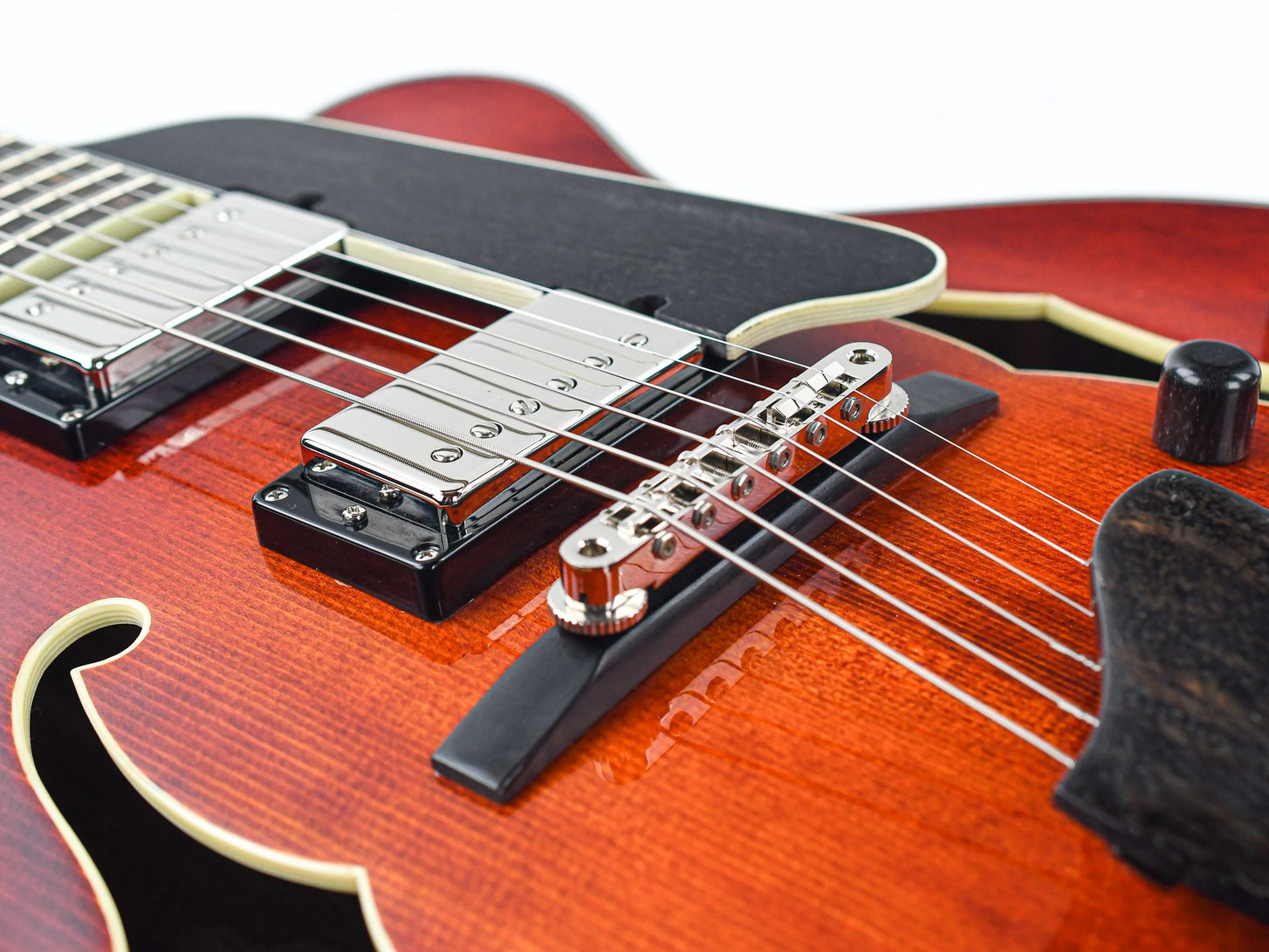 The choice of tonewoods and the time honored processes followed to craft these guitars create an organically acoustic tone that is seldom matched. Chords are full and complex while single notes are crisp and well defined. The fully hollow body design with a solid mahogany body and solid spruce top provide this deep resonant tone while the mahogany neck with a 'traditional even C' profile ensures a comfortable playability.