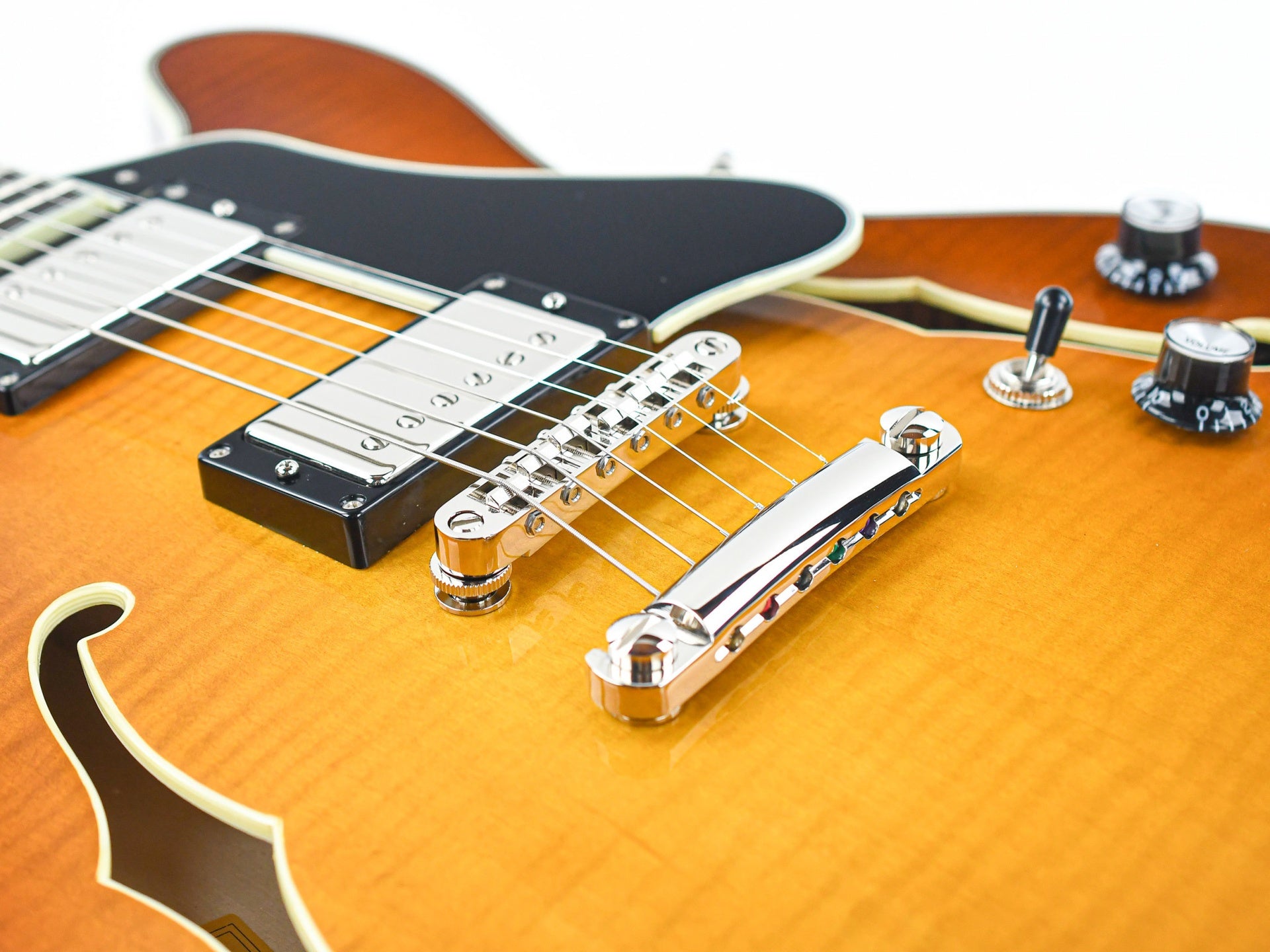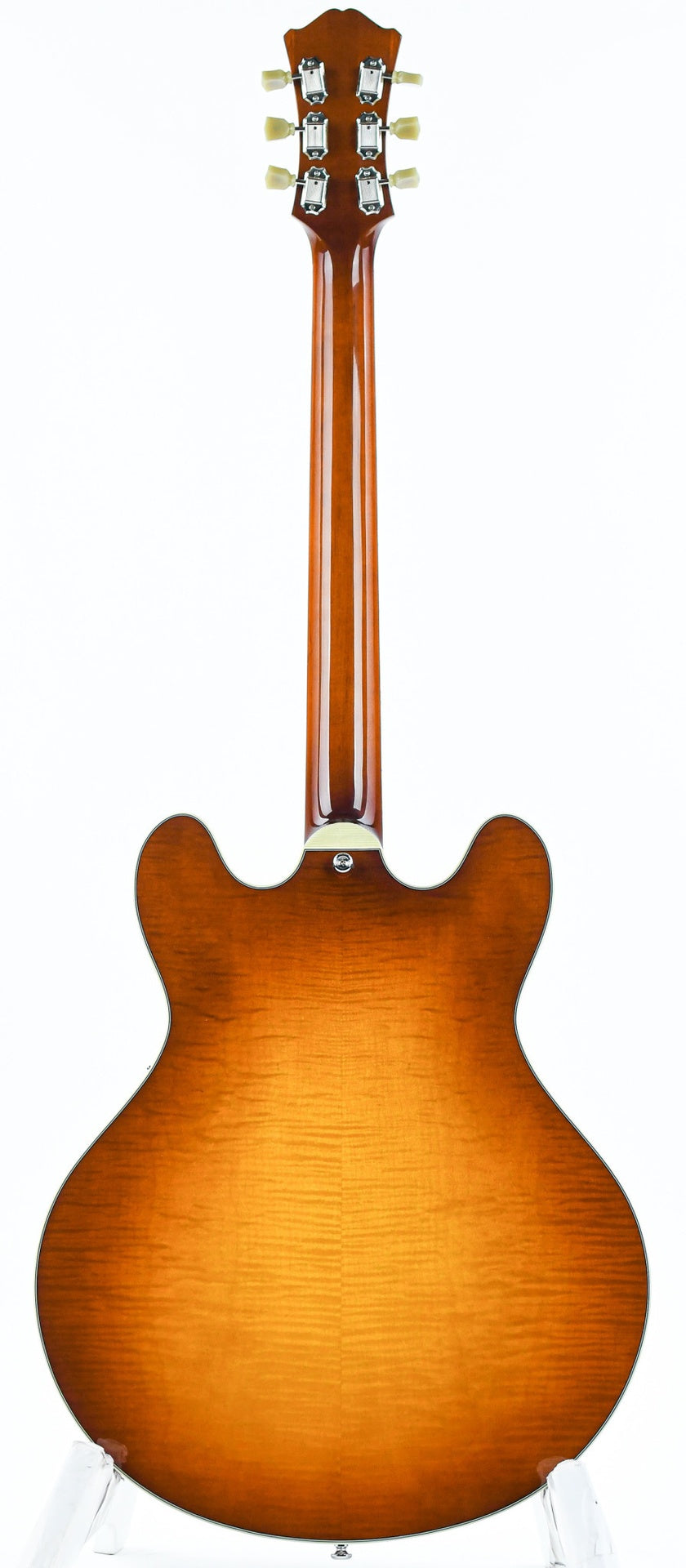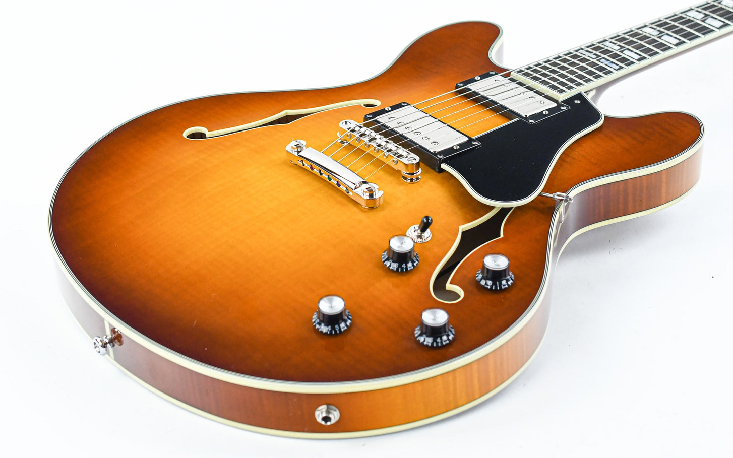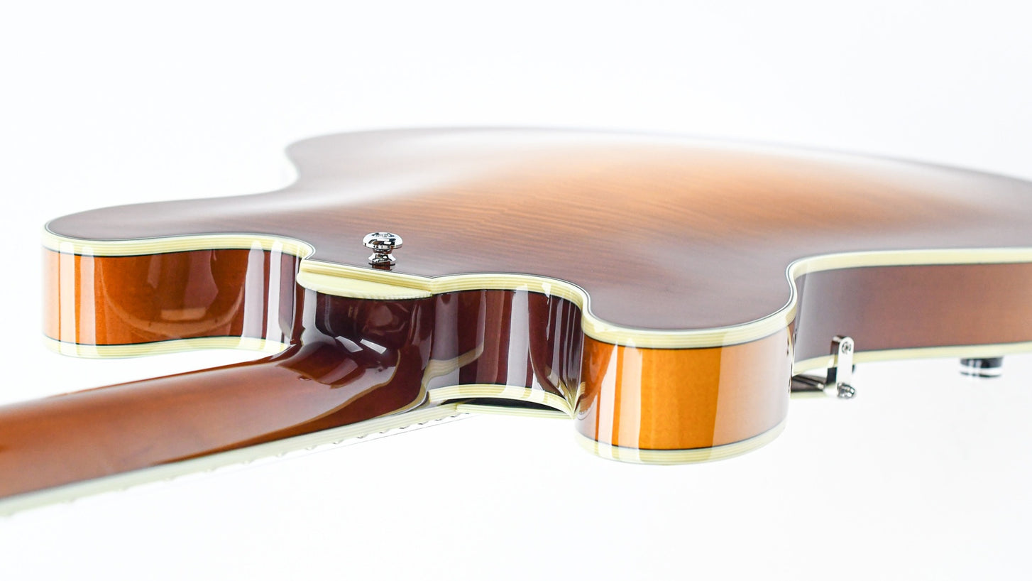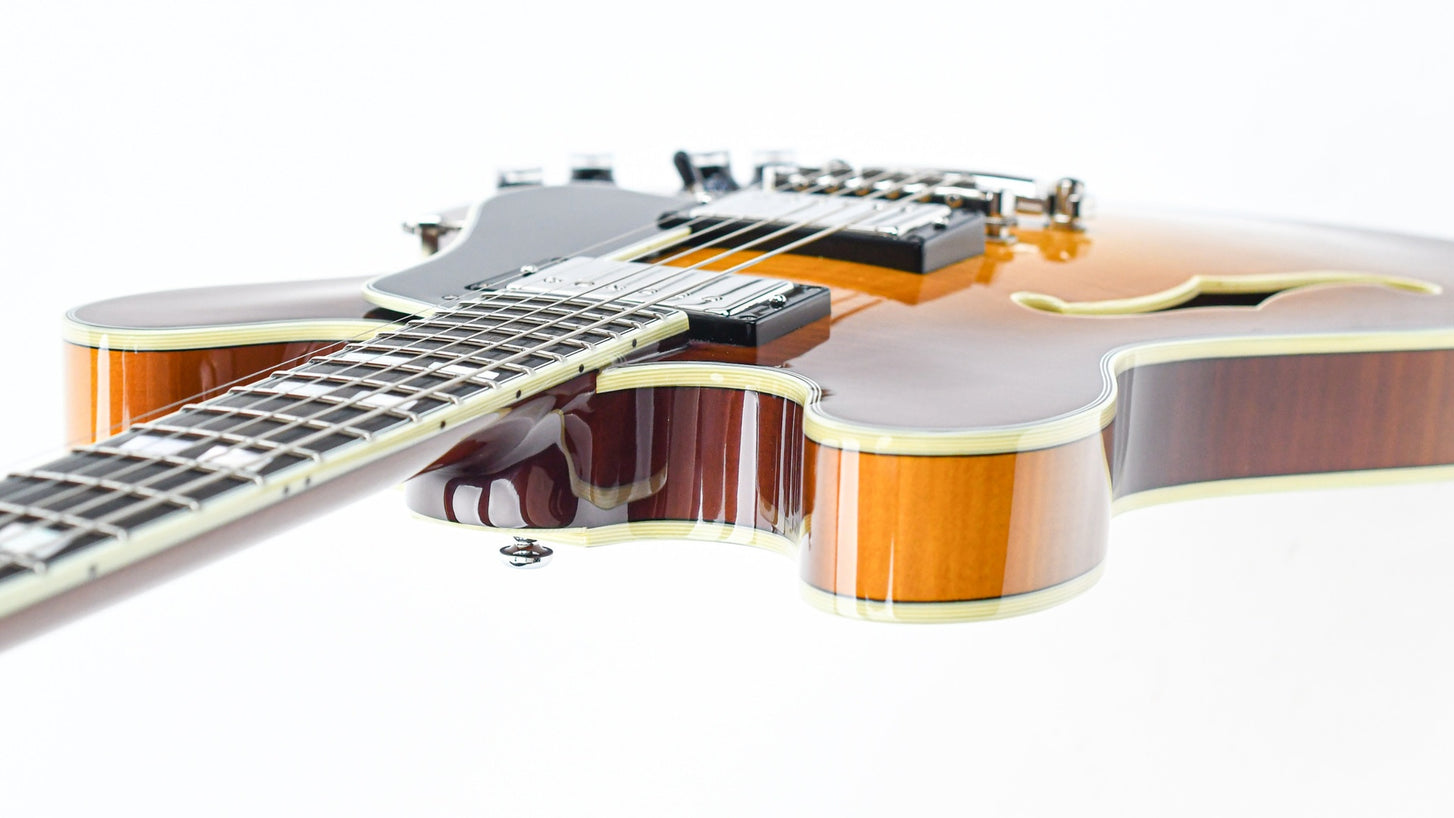 This semi-hollow guitar features a top-quality laminated maple body. It is versatile, responsive, with a lot of sound and a healthy amount of power. It has that distinctive humbucker sound provided by the Seymour Duncan Jazz and 59 pickups. The centerblock ensures that feedback is prevented and brings this semi-hollow a bit closer to a solidbody guitar.