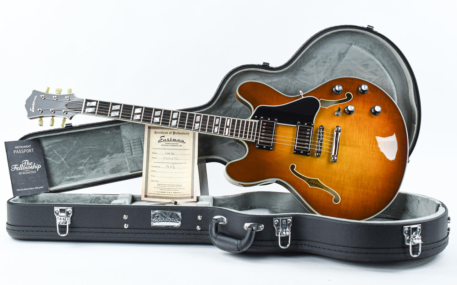 Eastman's T486 is a full-fledged 16 inch semi-hollow guitar and now comes dressed in a sleek Goldburst finish.