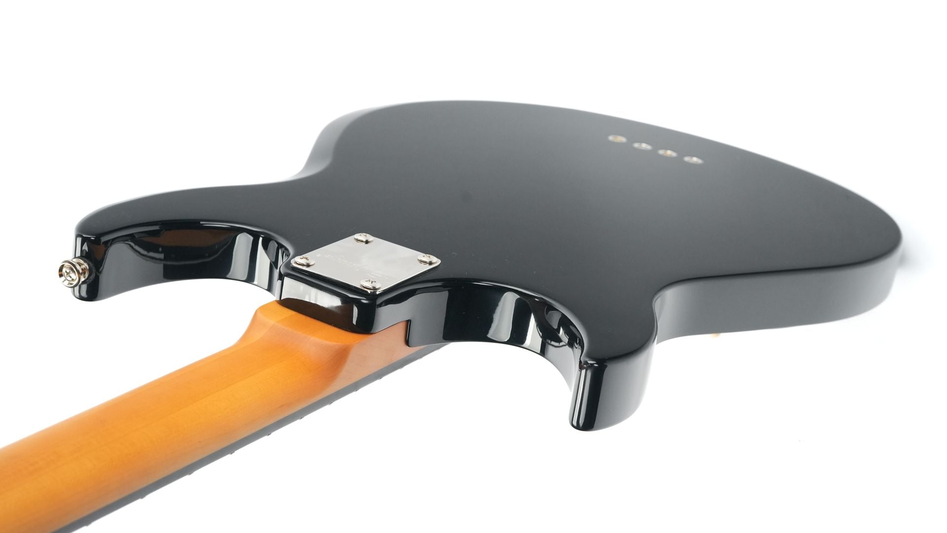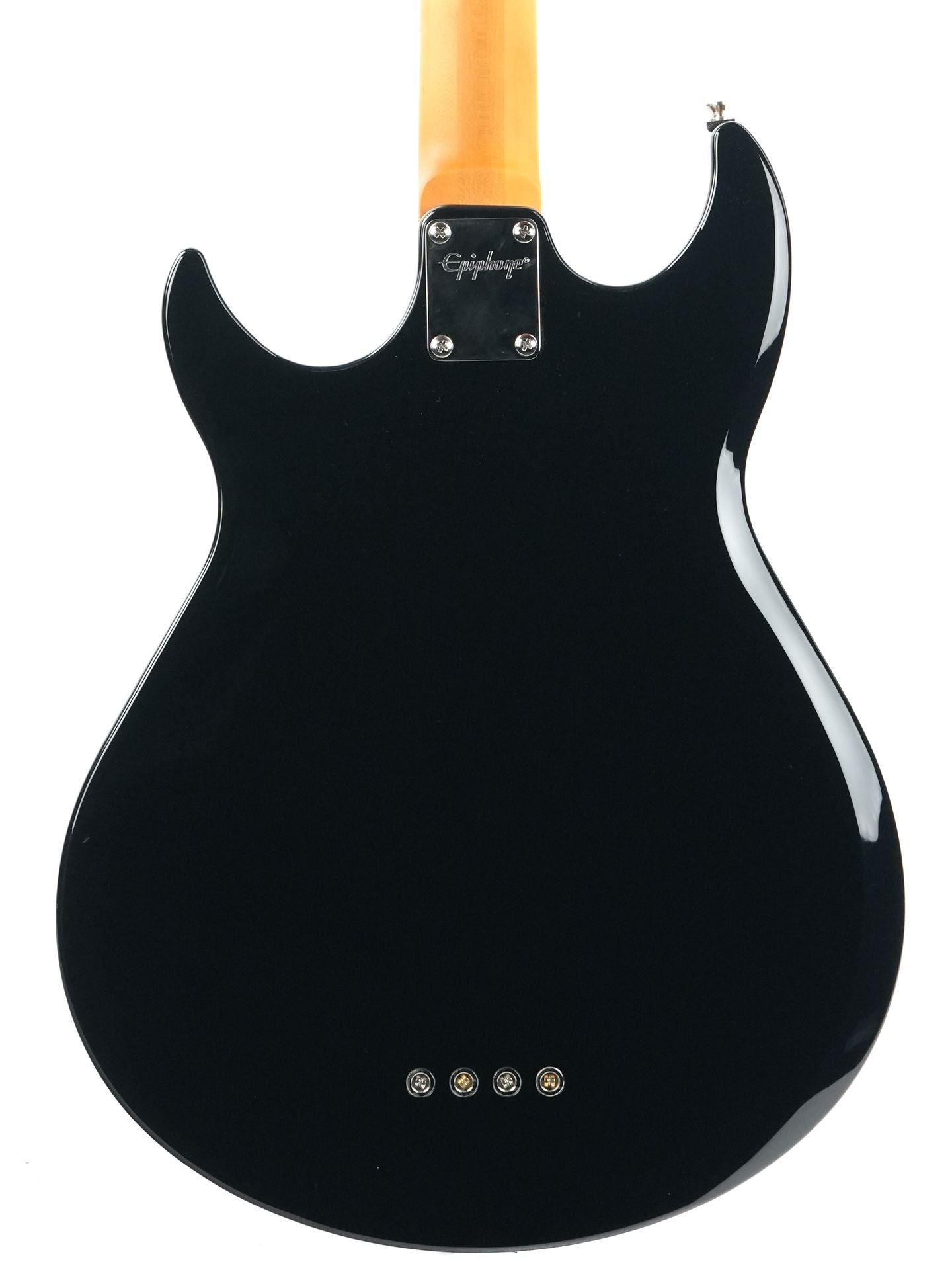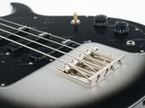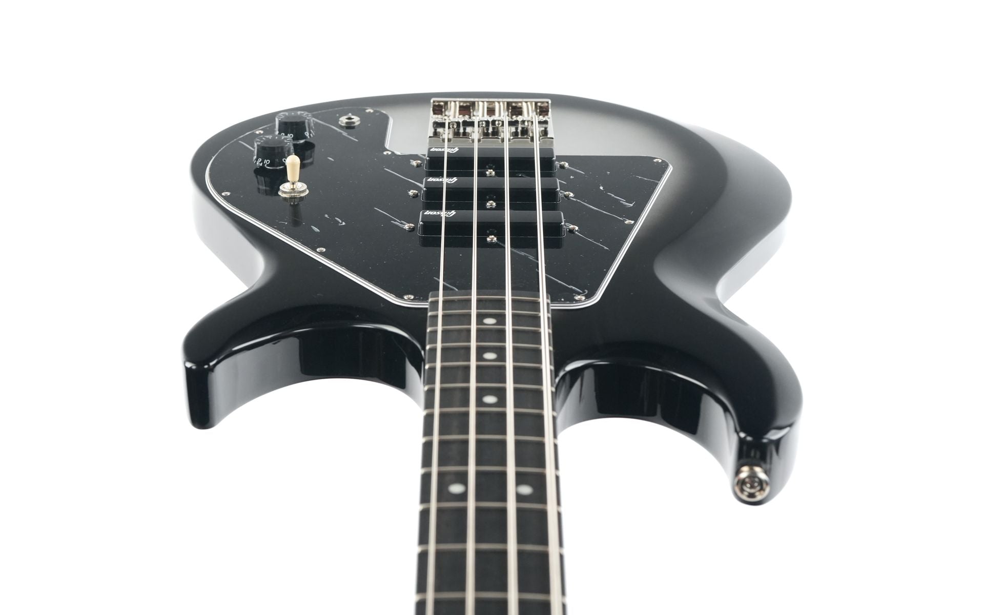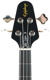 The Epiphone Mike Dirnt Grabber G-3 bass has a double-cutaway maple Grabber body. The 34” scale three-piece maple neck has an ebony fretboard (maple on the Natural-finished model) with 20 medium jumbo frets, and black abalone dot position markers adorn the fretboard. The classic Grabber “V™” headstock is equipped with open-gear bass tuners with historic clover buttons and a bone nut, while the other ends of the strings pass over a high-density Leo Quan® Badass II™ bridge for increased attack and sustain and full intonation and action adjustment, then run through the body and are anchored with string ferrules on the back of the body for excellent tone and sustain.