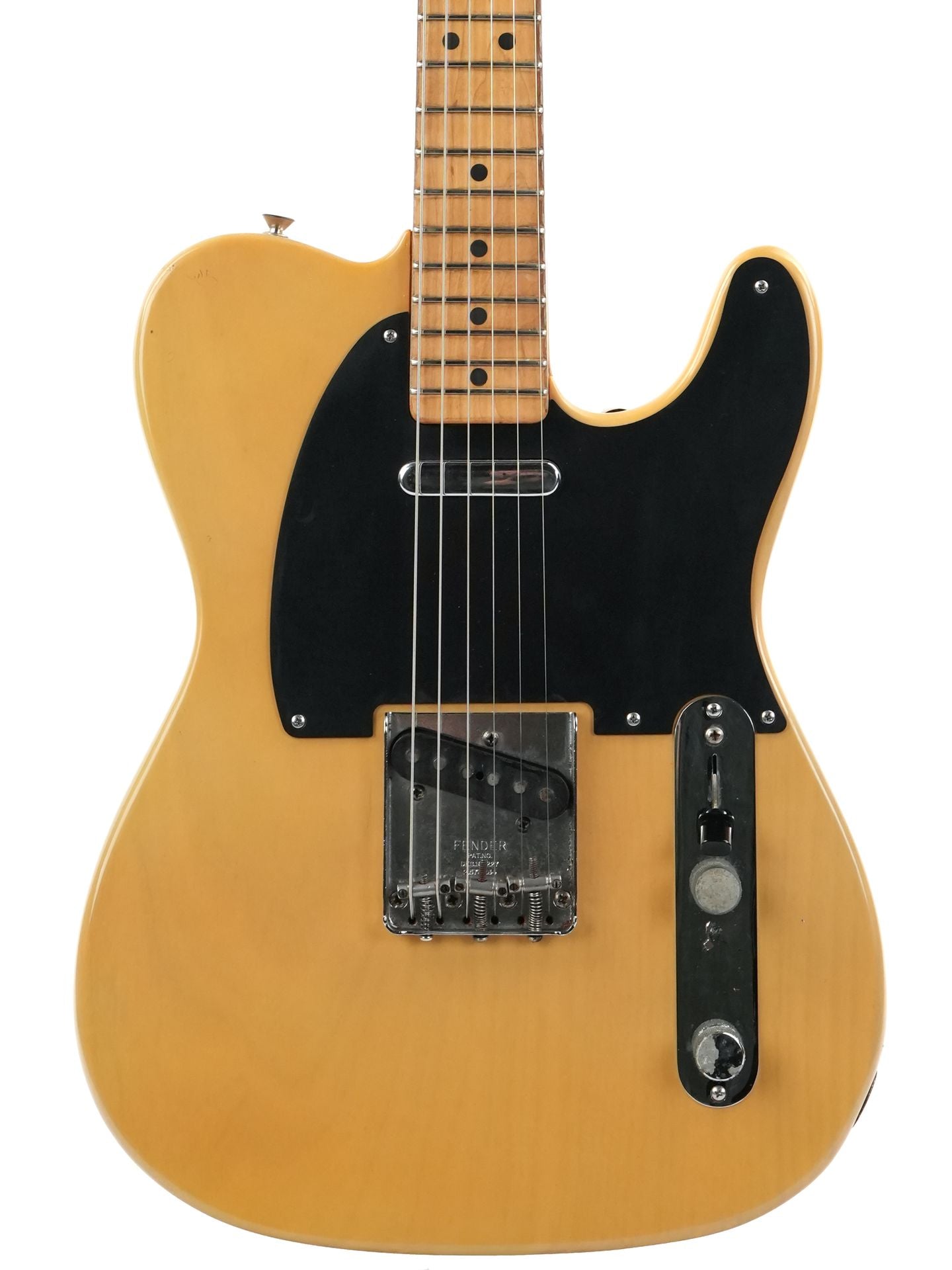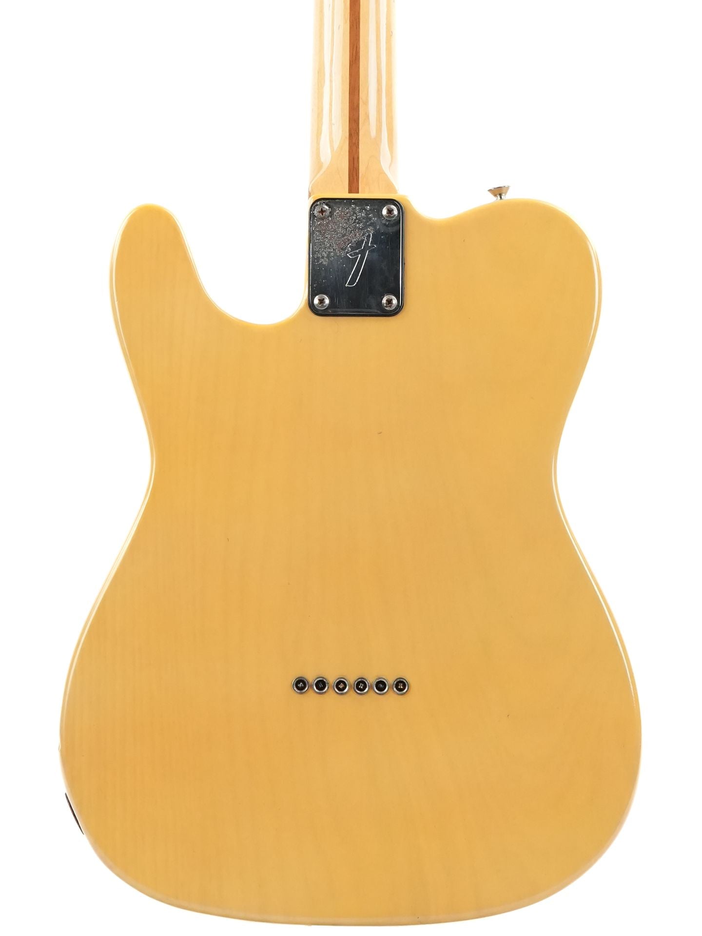 This 1978 Telecaster is no longer entirely original, just as so many Fenders have fallen victim to modifications over the years. The guitar has undergone a refinish from a non-original red finish to a nitrocellulose Butterscotch Blonde applied by Haar Guitars, making the grain of the ash body clearly visible. The pickguard has been replaced with a single-ply black one, but the original pickguard is included in the case. The guitar has had a refret at some point, and moisture has gotten under the lacquer along the edges of the fretboard, causing it to turn dark. Additionally, the nut has been replaced.