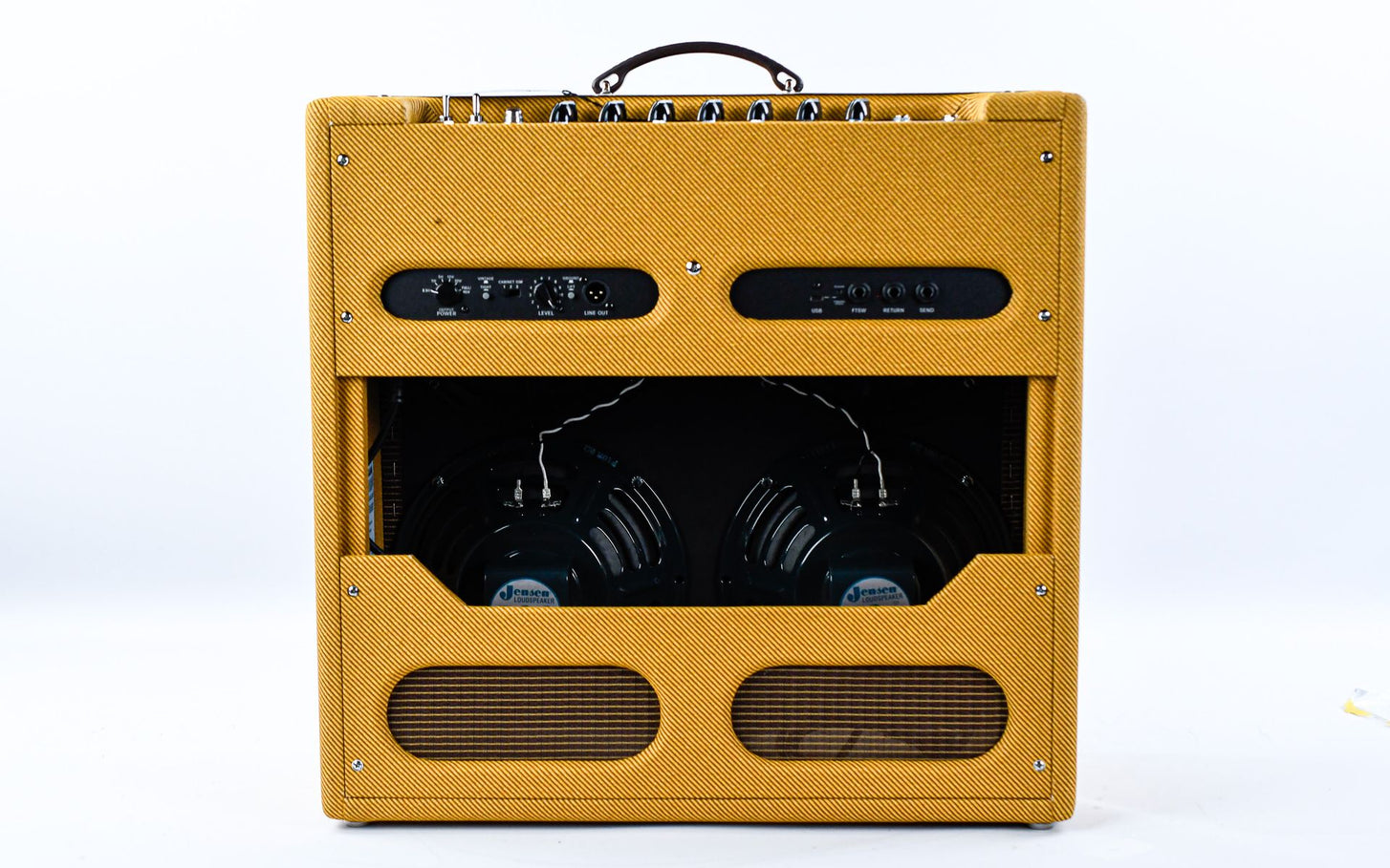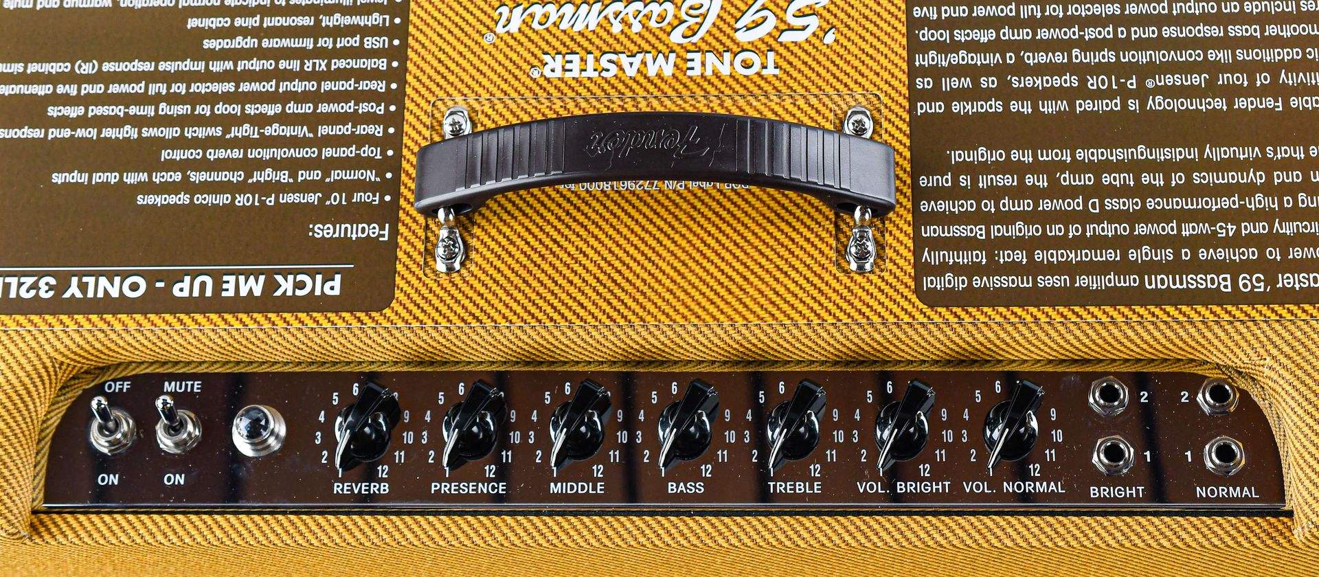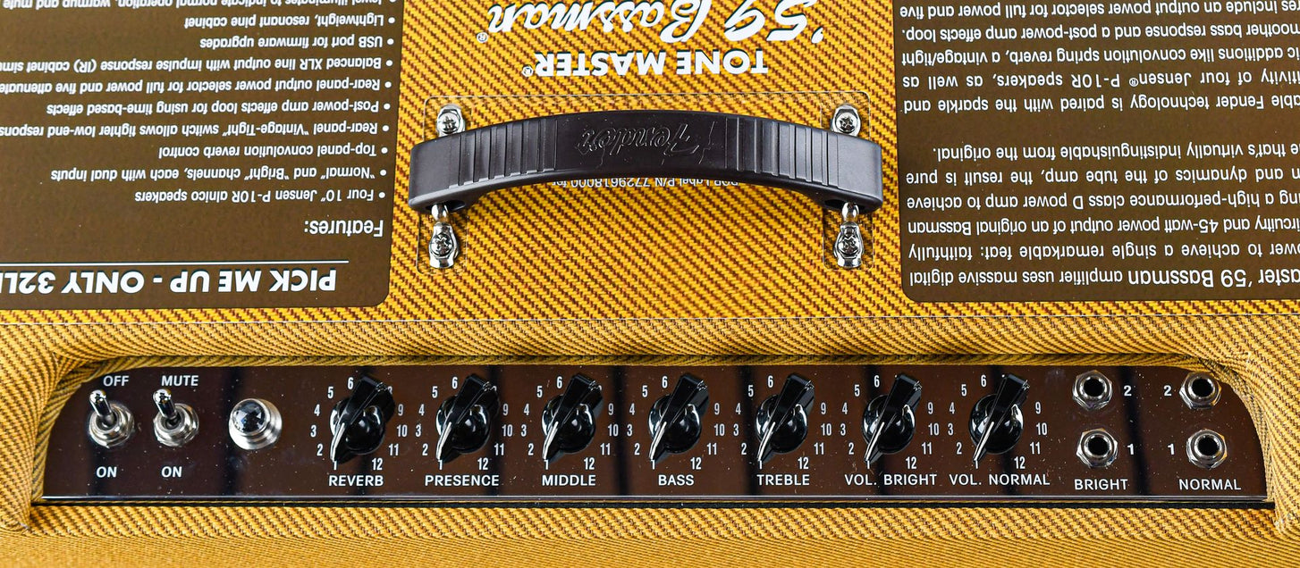 This cutting-edge Fender technology is paired with the renowned sparkle and touch sensitivity of four Jensen P-10R speakers. It also includes player-friendly features such as convolution spring reverb for a realistic reverb effect, a vintage/tight switch that adjusts bass response, and a post-amp model effects loop for greater versatility. Additional features include an output power selector with full power and five attenuated settings, impulse response (IR) XLR line output for detailed cabinet simulations, a mute switch for silent tuning, and a lightweight pine cabinet for portability.