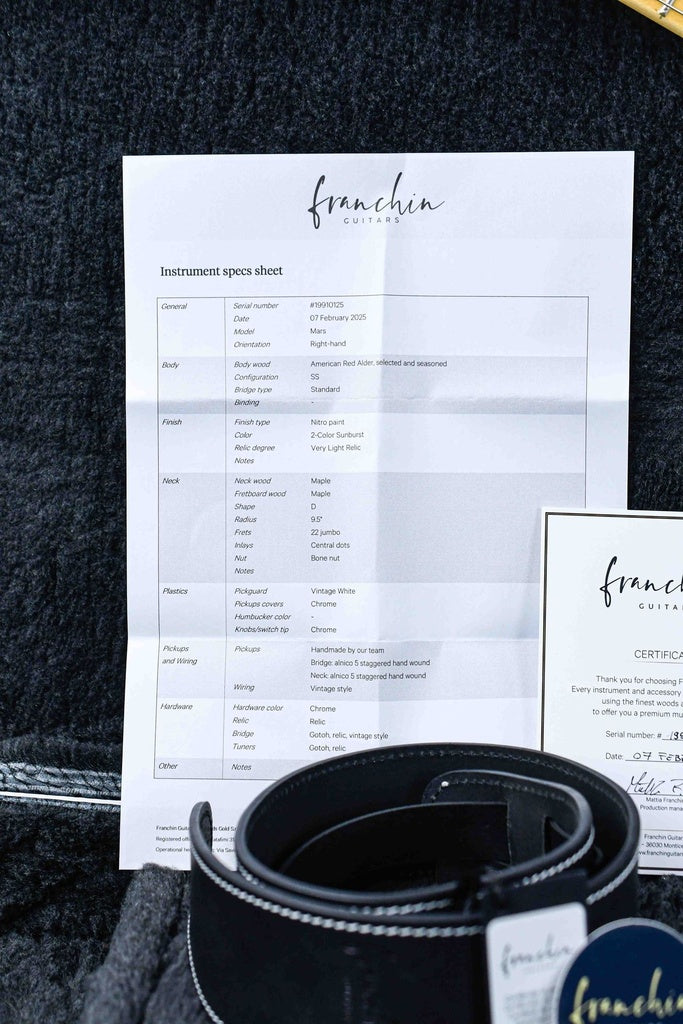 Their T-style model is called 'Mars' and this particular example is wrapped in a 2 Tone Sunburst finish, convincingly aged very lightly to give the guitar a played-in and seasoned look. However, the playability of the guitar is fully up to modern standards. And thanks to the resonant body and the single coils handmade by Franchin, the sound of the guitar is of an equally high level.