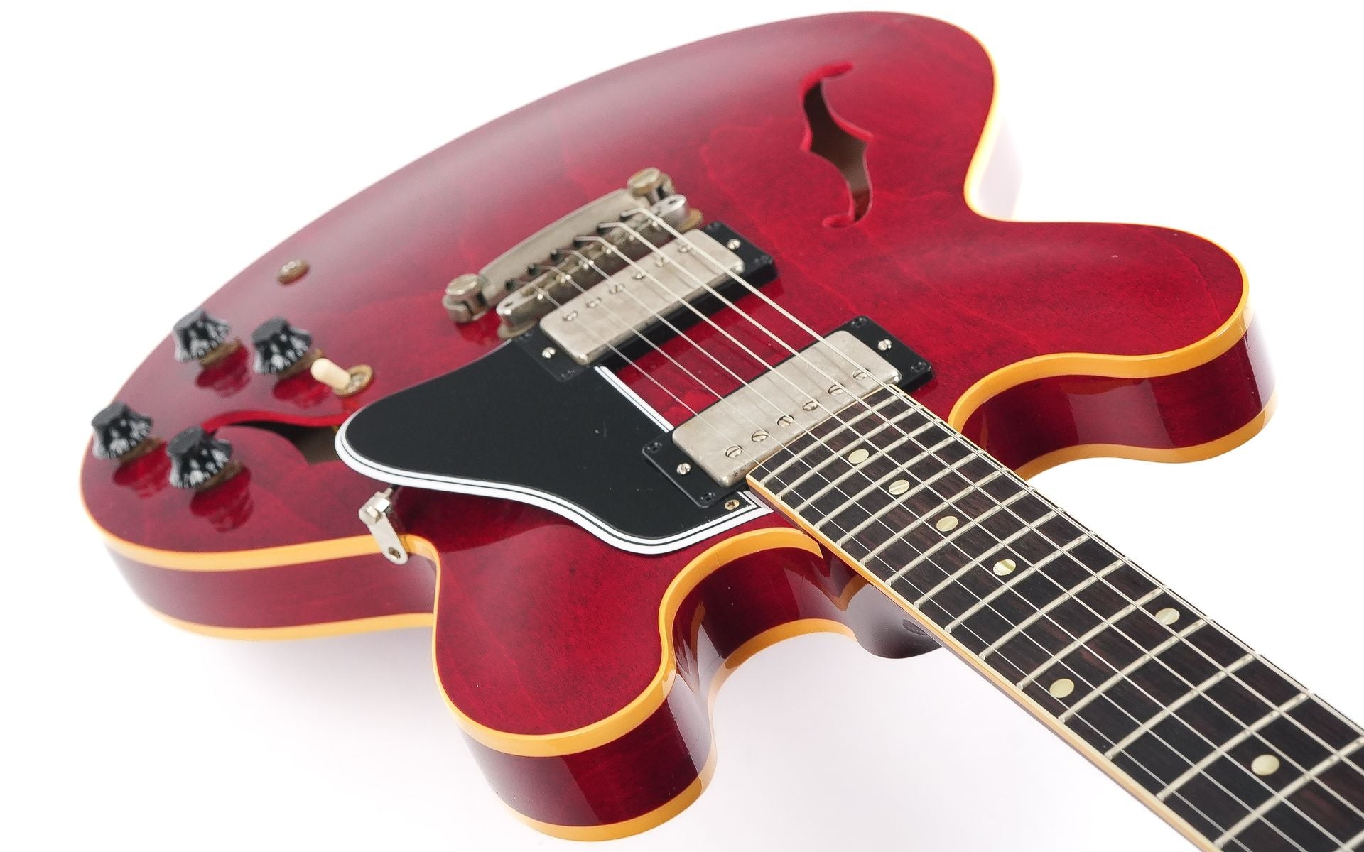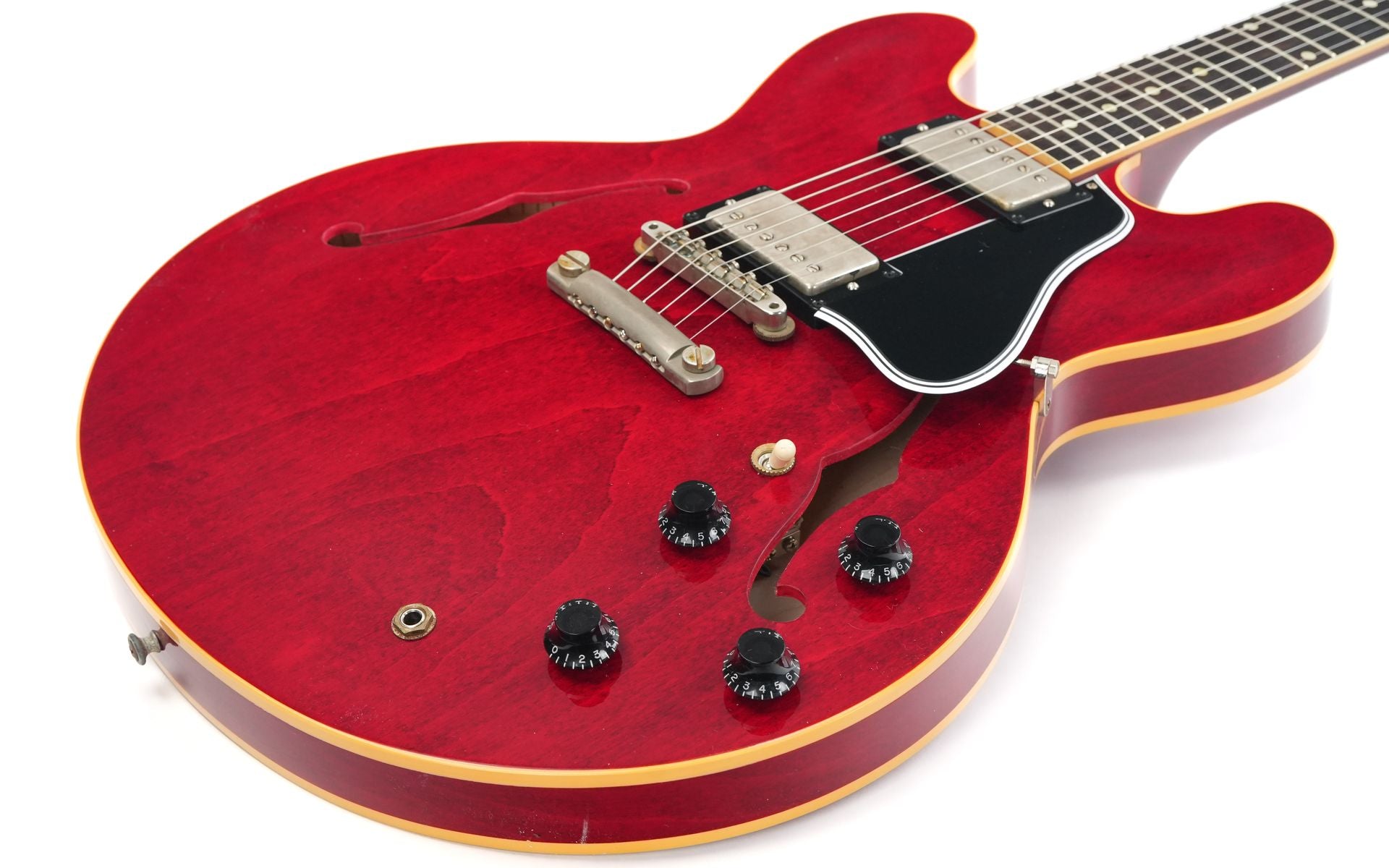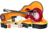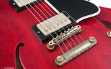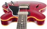 Introducing the Gibson Custom Murphy Lab 1961 ES335 Reissue Ultra Light Aged in a stunning 60s Cherry finish - an exquisite masterpiece that combines timeless design with modern innovation. Crafted to perfection, this brand-new guitar pays homage to the iconic ES335 model, meticulously aged by Gibson's renowned Murphy Lab, with a vintage appeal that captures the essence of a beloved instrument from the 1960s.Dressed in a rich Cherry finish, the 3-ply Maple/Poplar/Maple construction resonates beautifully, producing warm, full tones with excellent sustain. The Mahogany neck features a slim, tapering 60s C-profile, designed for maximum playability and comfort. Topped with an Indian Rosewood fingerboard, this guitar offers a buttery-smooth feel.Equipped with a pair of Custombucker Alnico 3 pickups, this guitar delivers a wide range of tones that are both clear and expressive. The 2 volumes, 2 tones, and 3-way toggle switch provide versatility to explore different sonic landscapes, making it a perfect companion for genres from blues to jazz. It comes in a case with TFOA passport.