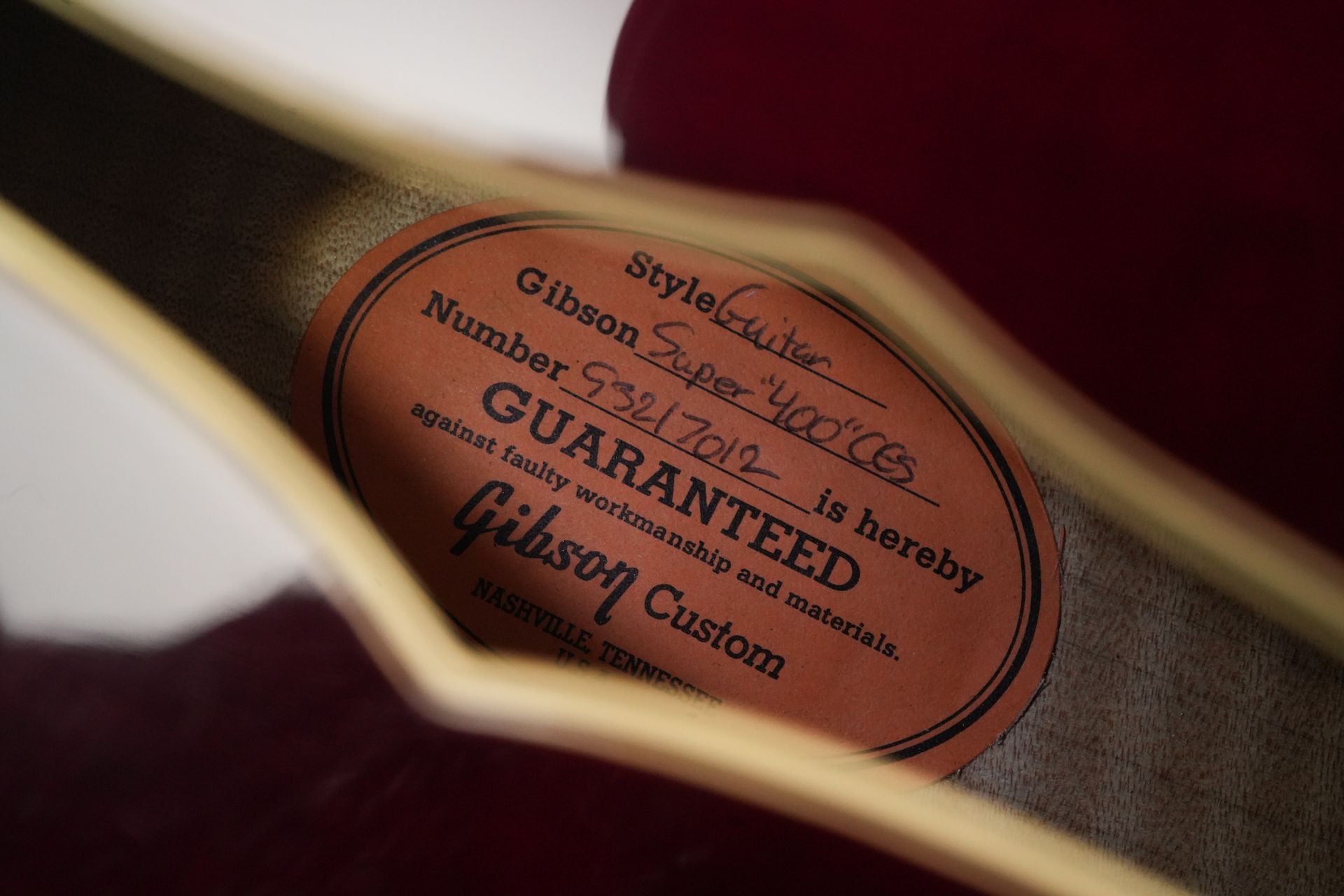 The guitar has that characteristic warm jazz tone for which the Super 400 is known, with beautiful sustain and articulation in every note. The instrument responds instantly to your touch and offers a dynamic range that effortlessly translates both subtle chords and powerful single-note runs. Over the years, the guitar has accumulated some playwear and subtle weather checking. The gold finish on the hardware and pickups is also weathered in some places, but otherwise this beautiful Gibson is exceptionally clean.