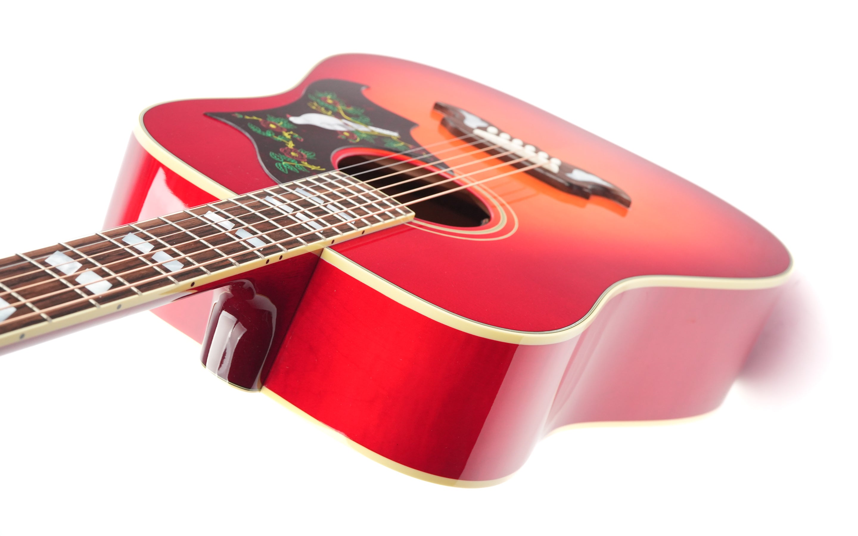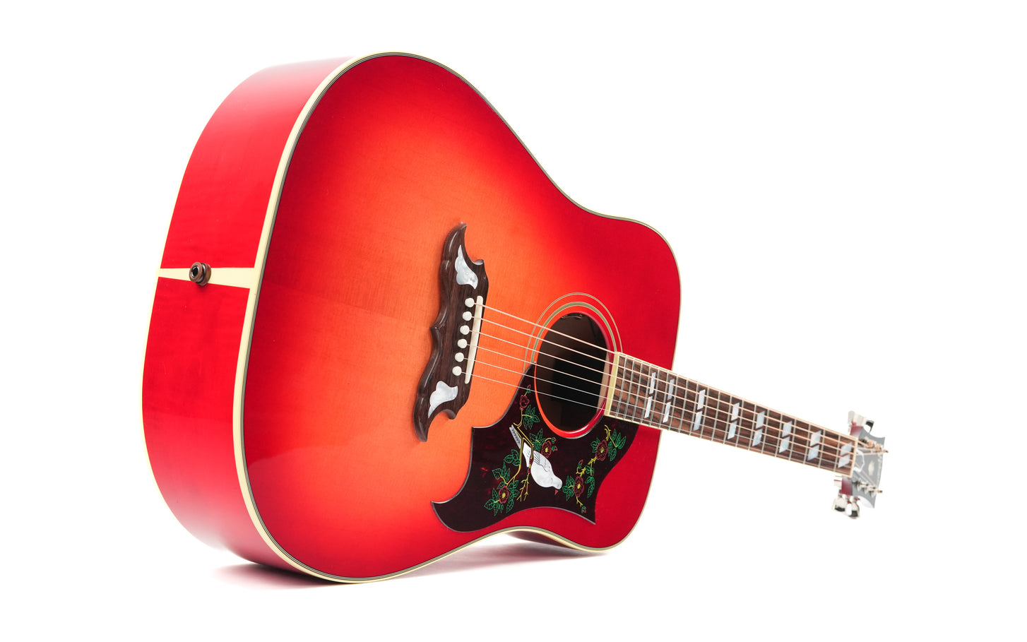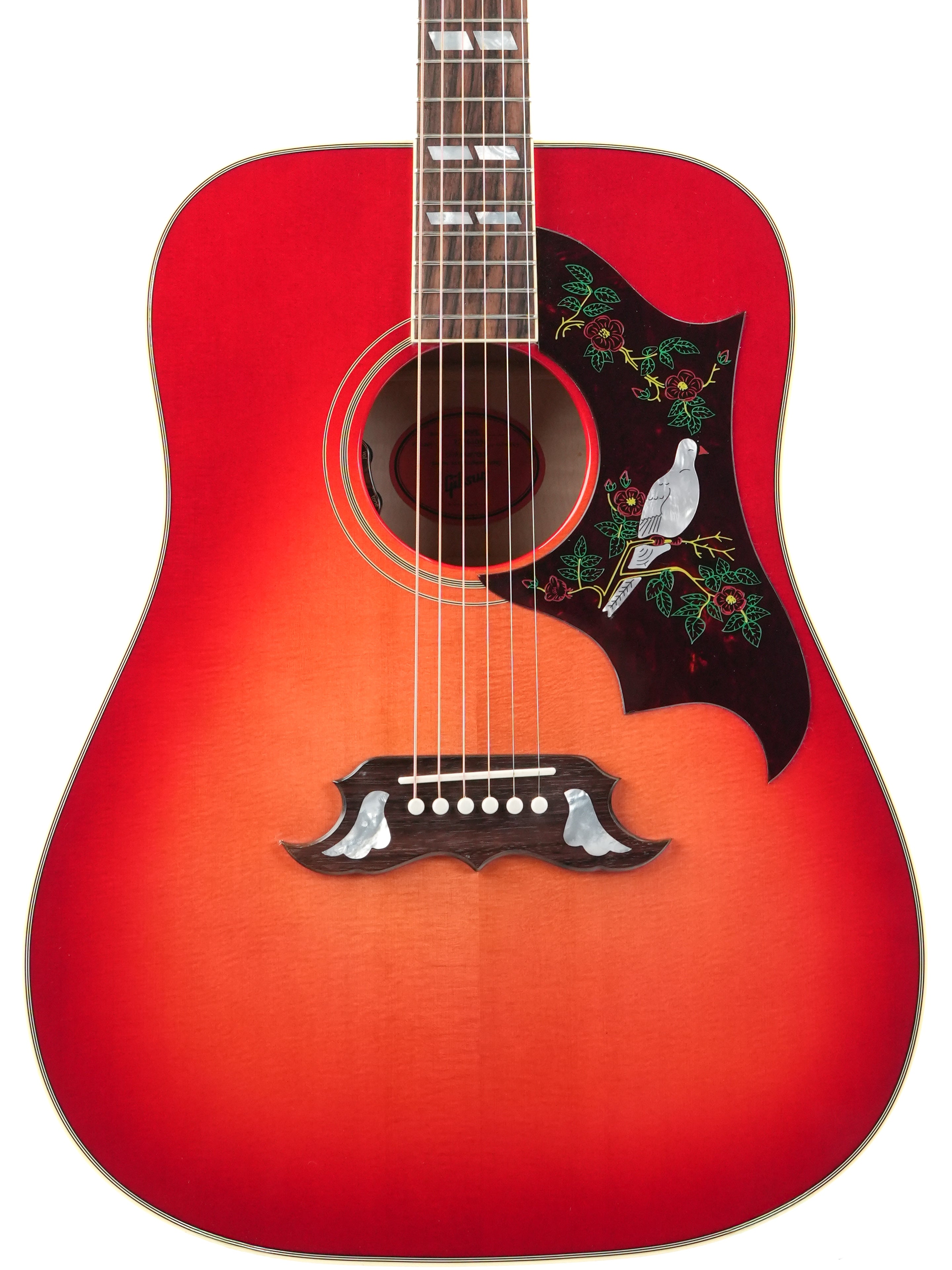The Gibson Dove Original in Vintage Cherry Sunburst is one of those guitars you recognize immediately, even before you’ve played a single note. The combination of the dreadnought design, the pronounced cherry burst, and the richly detailed pickguard with inlaid dove gives this model a distinct identity within the Gibson acoustic line.