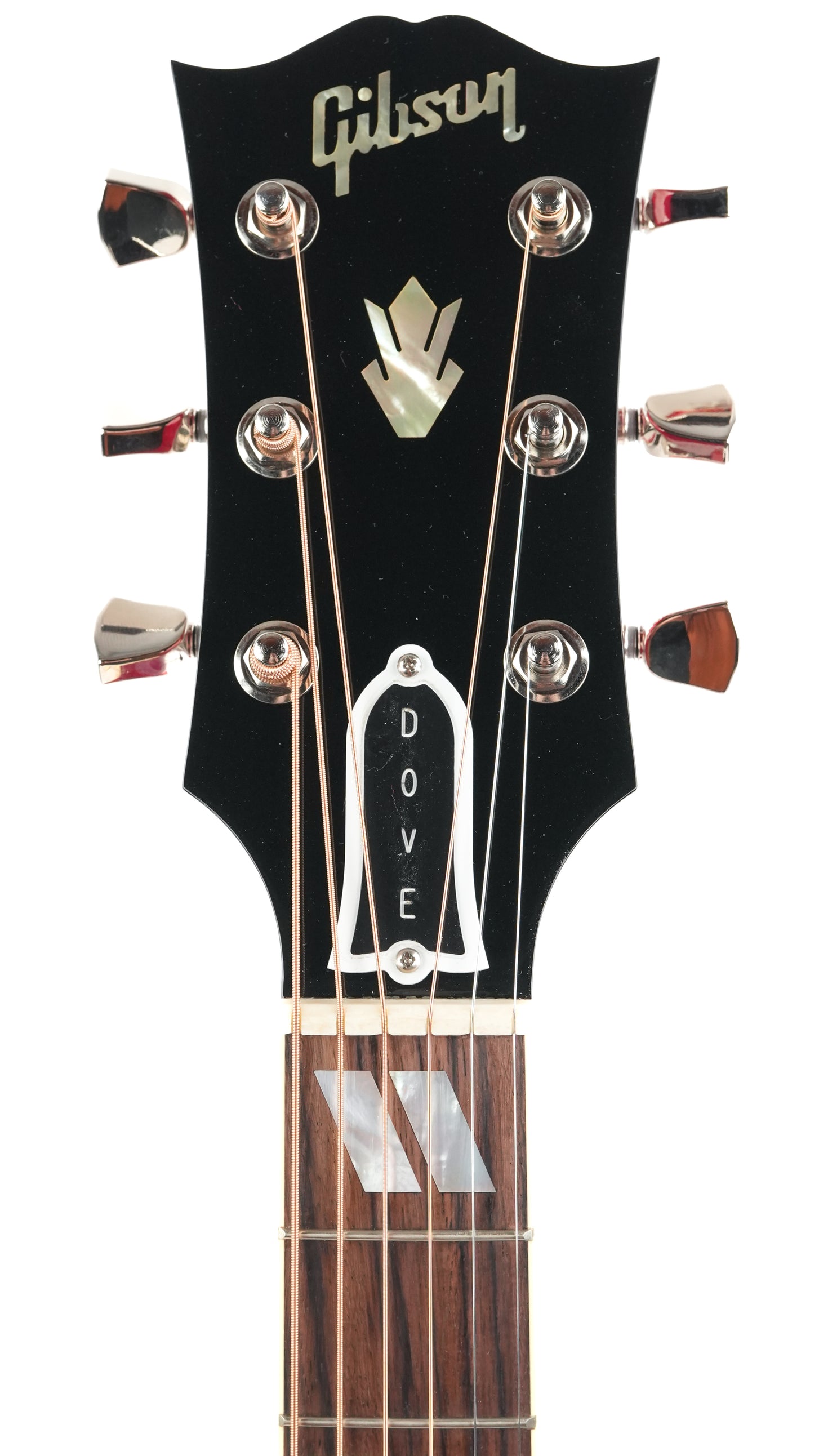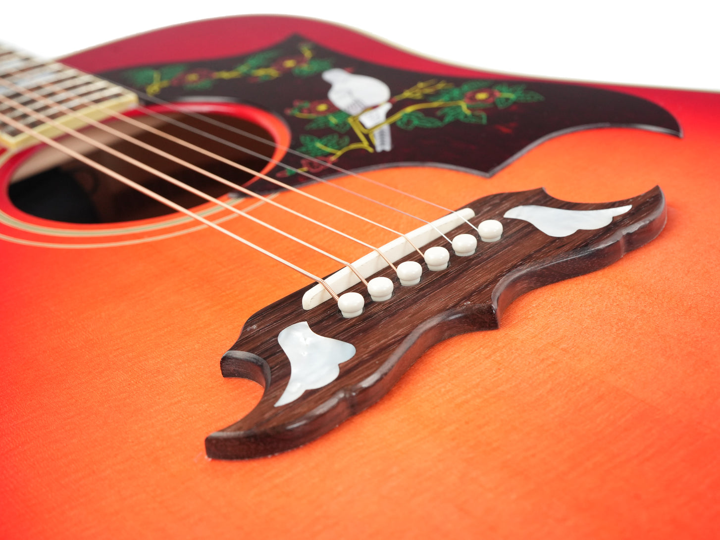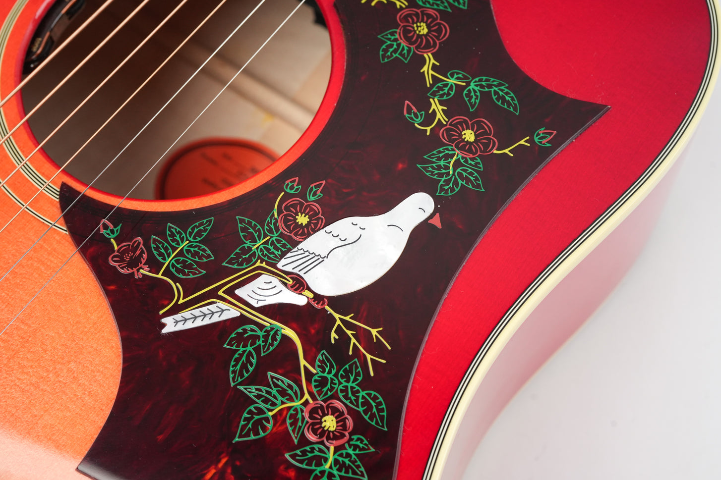 The Gibson Dove Original in Vintage Cherry Sunburst is one of those guitars you recognize immediately, even before you’ve played a single note. The combination of the dreadnought design, the pronounced cherry burst, and the richly detailed pickguard with inlaid dove gives this model a distinct identity within the Gibson acoustic line.