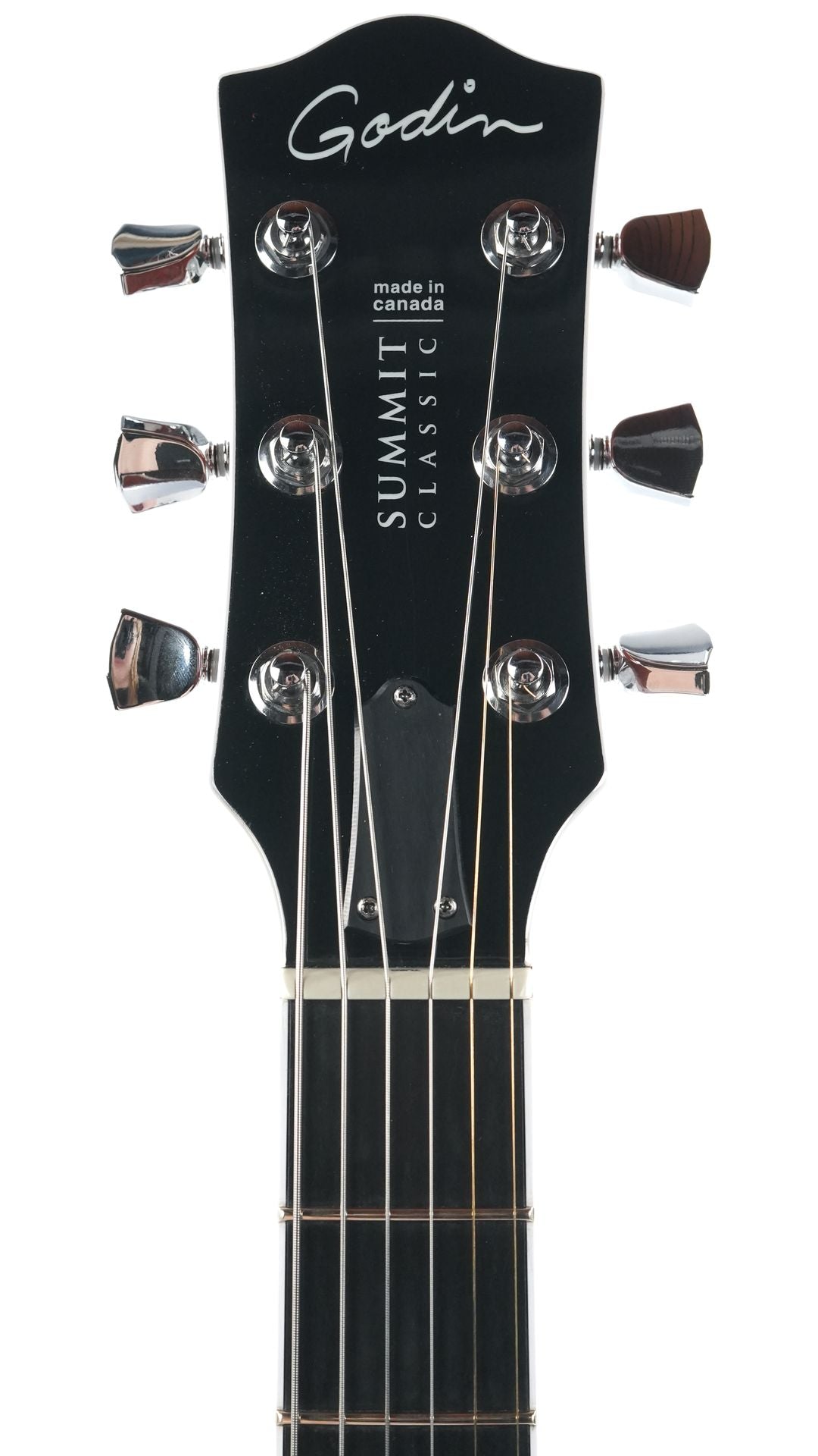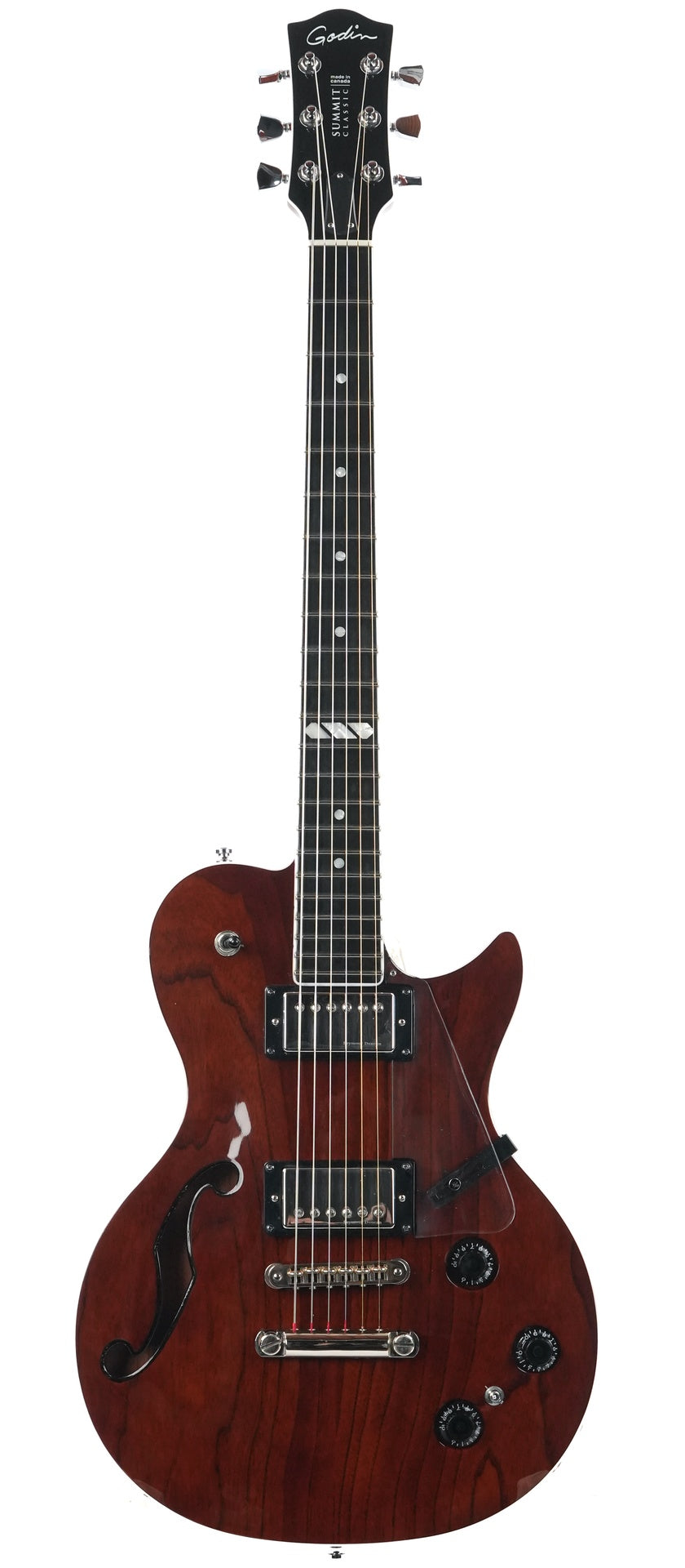 This 2019 Godin features a transparent pickguard, and the tuners have been replaced with Grover locking tuners. The guitar has only minor playwear and comes with a TFOA passport and a Godin hardshell case.