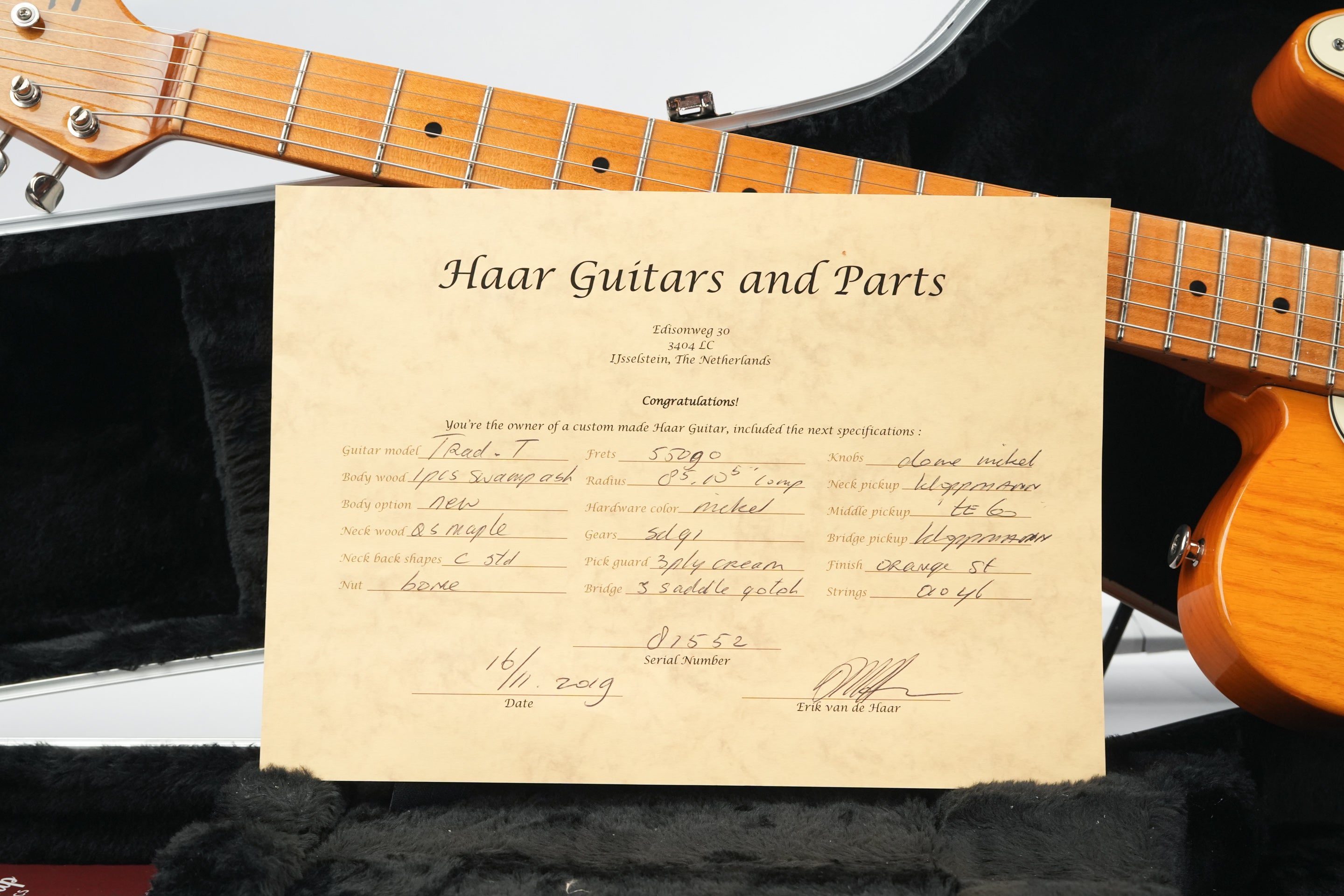 The compound radius from 8" to 10.5" ensures comfortable chord playing in the lower positions while still allowing for smooth bending higher up the neck. The two Kloppmann TE60 pickups are the heart of this guitar. Ernst Kloppmann’s TE60 design pays tribute to early 1960s Fender-style single coils: clear, glassy, yet with enough body to never sound thin.This 2019 Haar shows visible signs of use, particularly on the body. There are some dings on the back near the input jack, along with general playwear across the instrument. Nevertheless, it remains in excellent condition and comes in a case with its spec sheet.