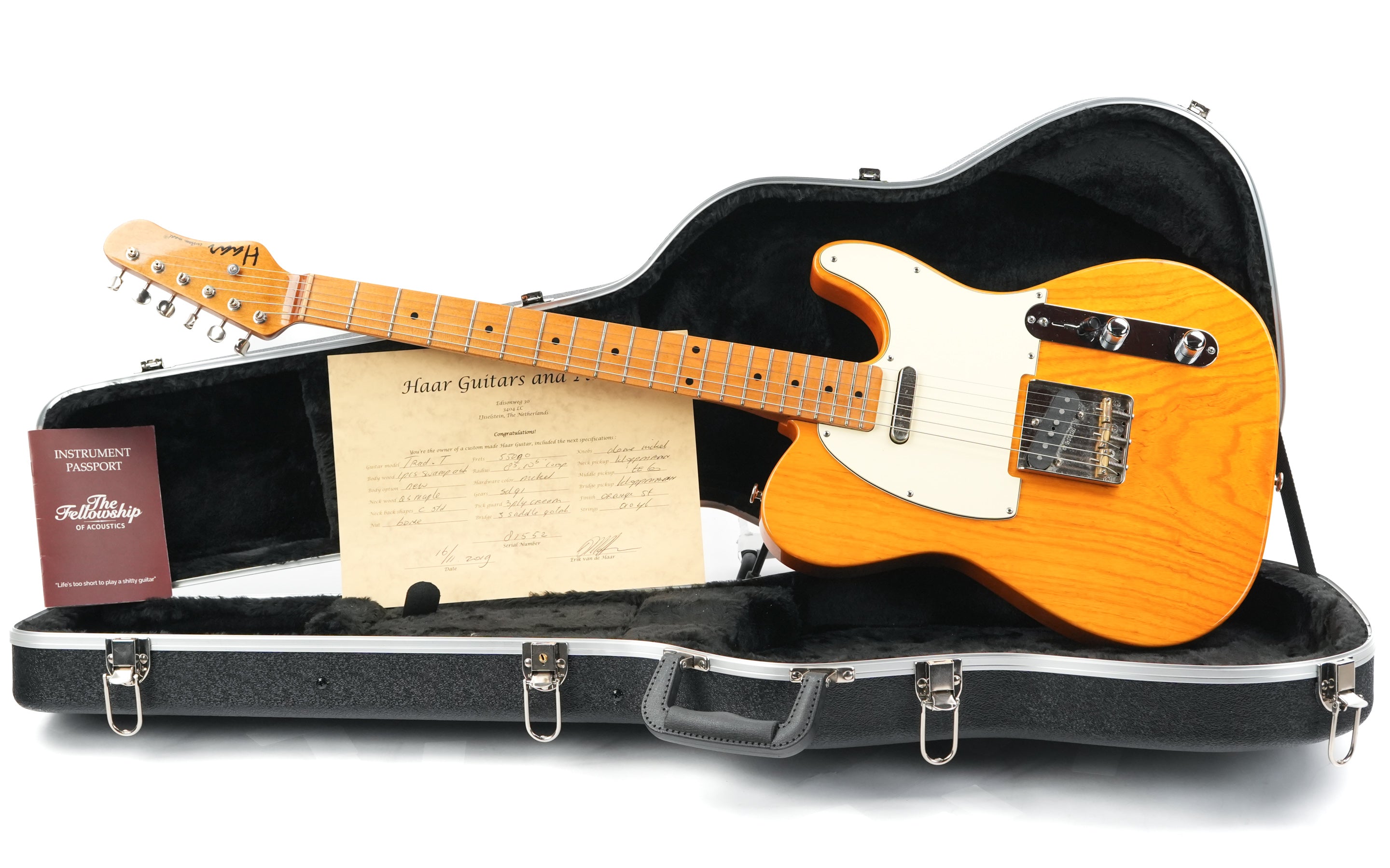 This Haar Traditional in Orange Stain is a Tele-style guitar that shows what happens when a skilled Dutch luthier puts his own spin on a classic design. Equipped with Kloppmann pickups, a compound radius, and a swamp ash body, this Trad T delivers a playing experience that convinces you instantly.