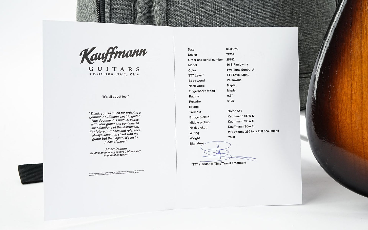 The guitar is particularly light due to the Paulownia body, and is also very stable and reliable thanks to the Gotoh bridge and tuners. This 56 S plays like butter thanks to the C-shaped neck profile and the 9.5 inch fingerboard, and the sound is incomparable and unmistakable thanks to Kauffmann's own Slightly Overwound single coils!