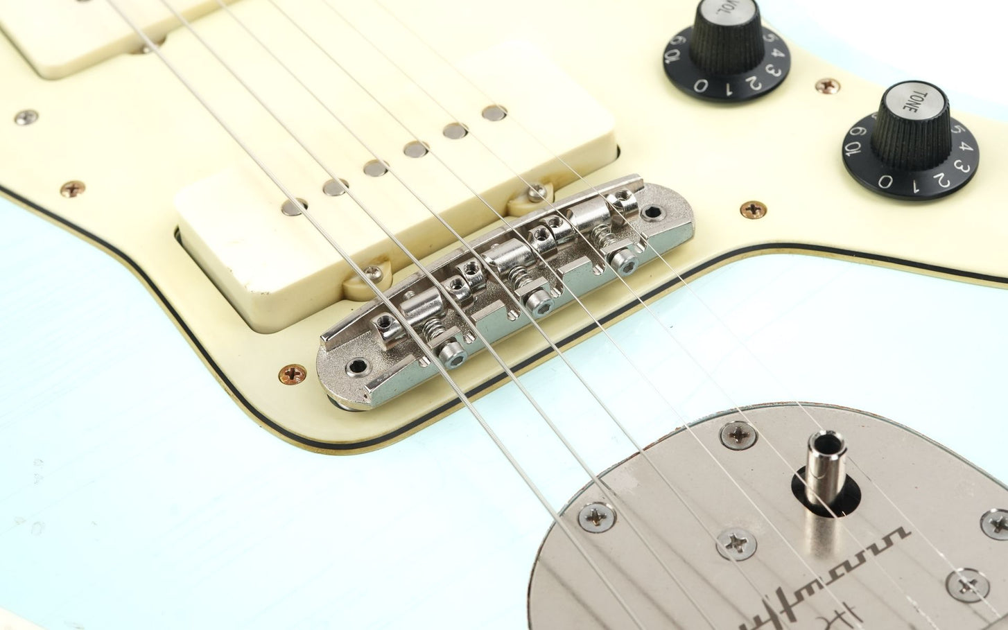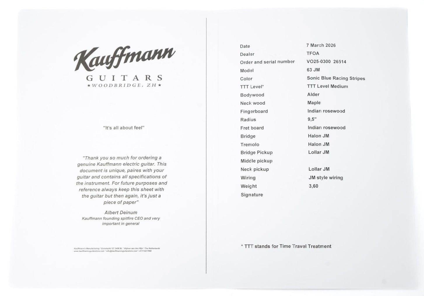 Dat vintage gevoel wordt verder versterkt door Kauffmann’s medium aging, terwijl de Competition Stripe en Sonic Blue finish zorgen voor een opvallende en karaktervolle uitstraling.