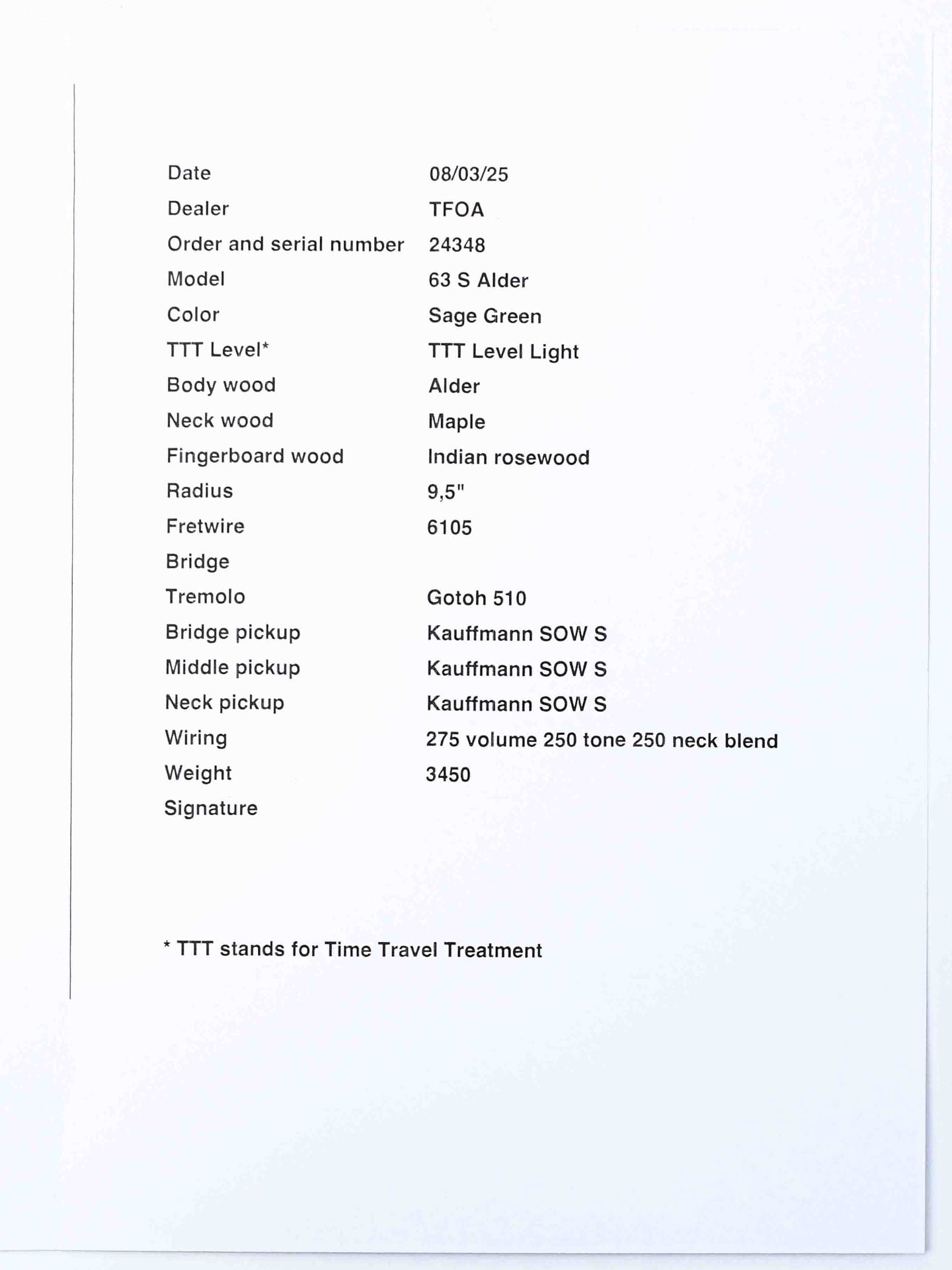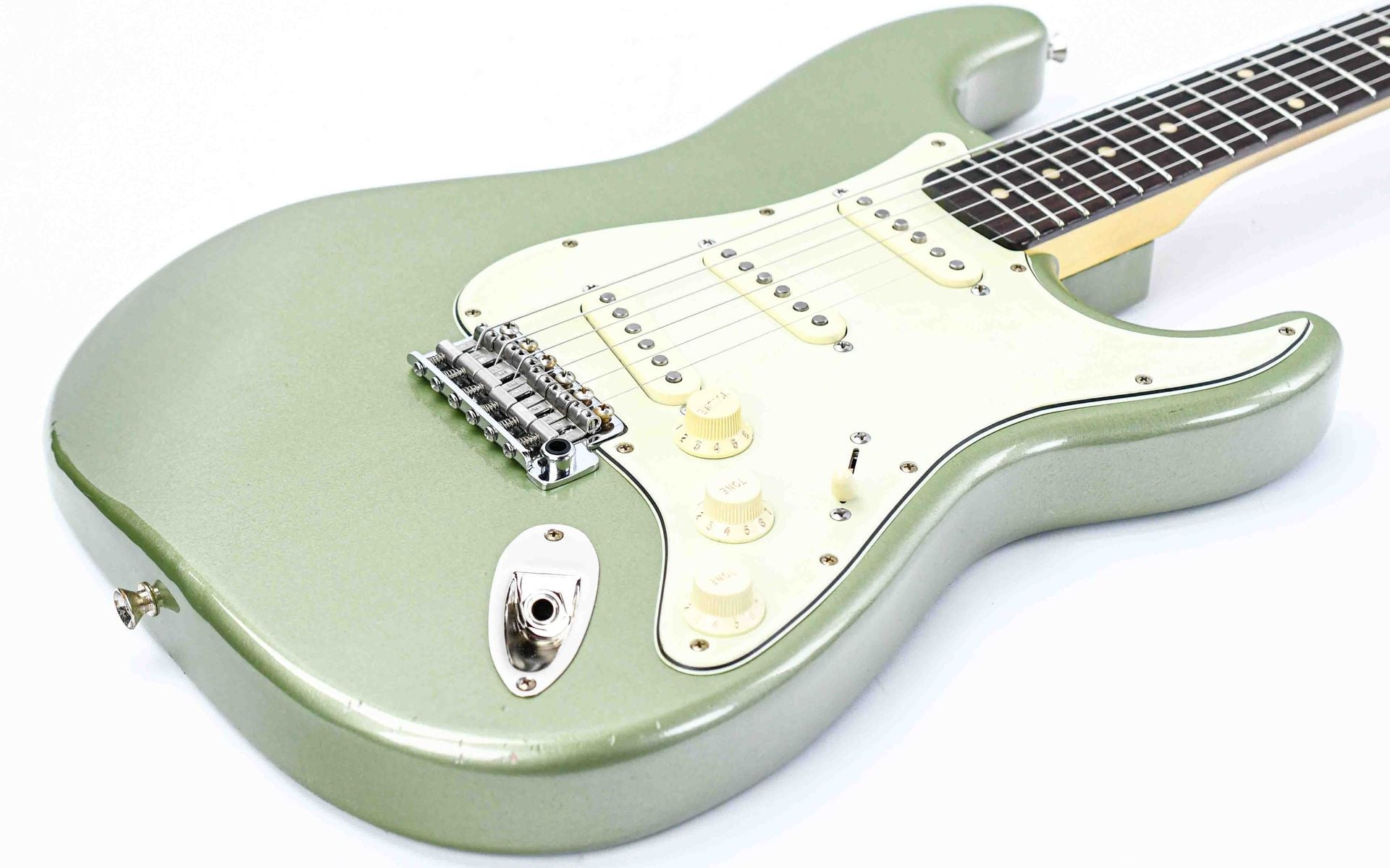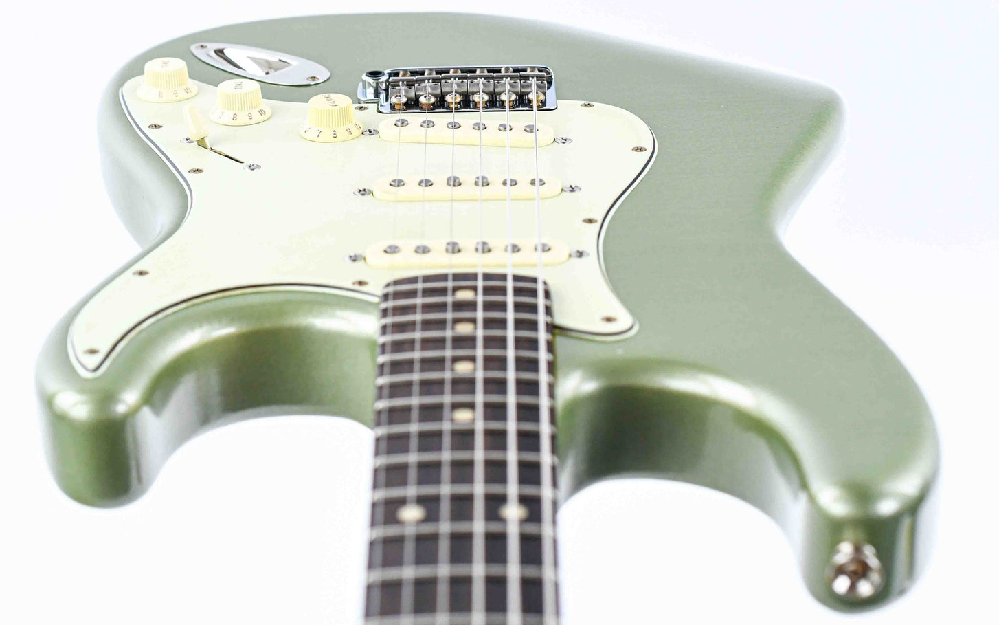This model features an alder body finished in a stunning Sage Green, complemented by a beautifully executed relic treatment for a worn-in, road-ready aesthetic. Solid Gotoh hardware guarantees long-term tuning stability, while Kauffmann’s own Slightly Overwound S pickups deliver the rich, dynamic tones that make this guitar truly stand out.