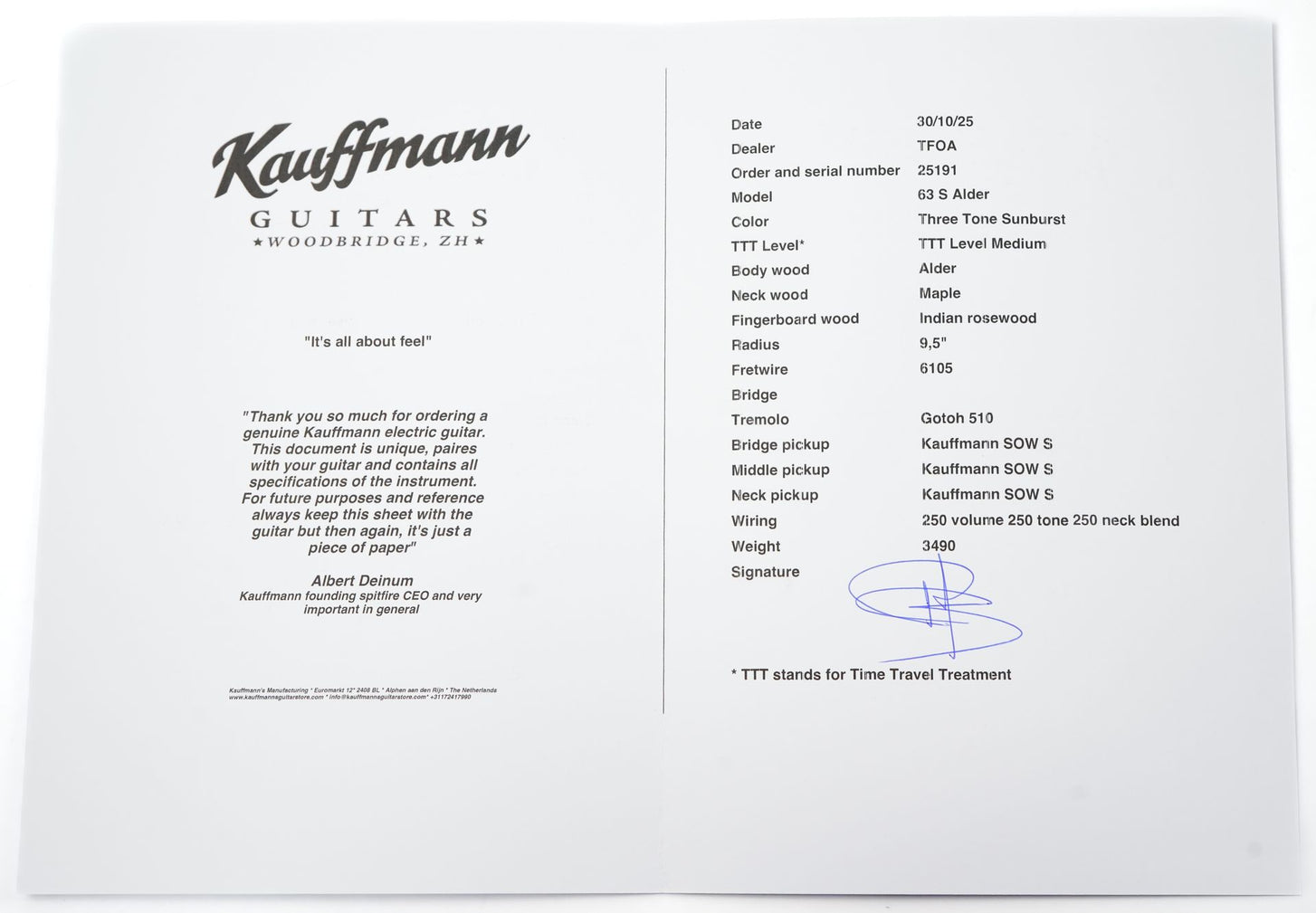 The guitar comes with a TFOA passport and a gig bag.