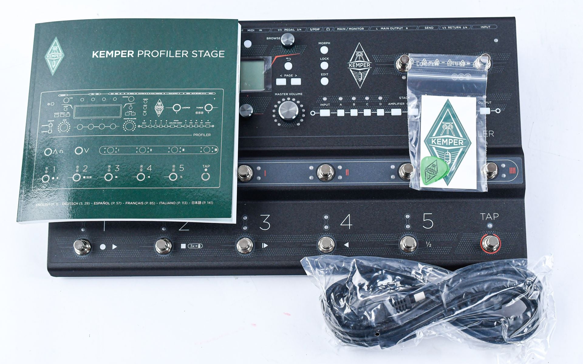 The Kemper Profiler Stage combines the complete Profiler system with an integrated Remote-quality footswitch in one robust floorboard. Ideal for rehearsals, studios and compact touring. The design offers connections for four additional expression pedal options, two FX loops, stereo outputs to PA and mono or stereo monitoring through guitar cabs. Lightweight, built to last and designed for maximum flexibility on the road.