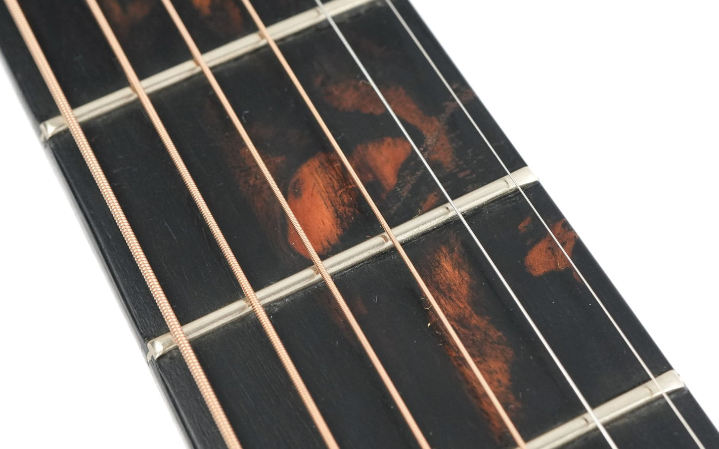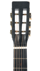One thing that is absolutely certain is that it is approximately 145 years old and that it hasn't come through the past century entirely unscathed. The bridge has been replaced, as have the saddle, bridge pins, and nut, and a refret has also been performed at some point. Inside the soundboard, we can see that several cracks in the top have been repaired with glued-in cleats, the bridge plate has been repaired, and one of the braces has been reglued. Finally, on the back of the headstock, a repair to the headstock joint can be found.