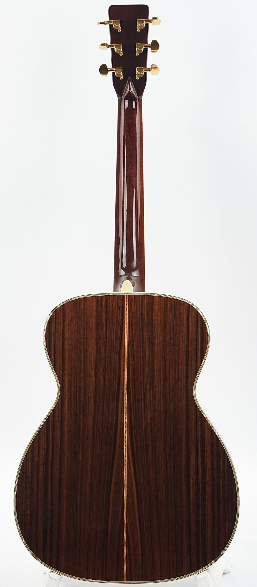 The solid rosewood back and sides provide warm, deep basses and complex overtones, while the solid spruce top with scalloped X-bracing ensures a direct and articulate response. The signature luxurious abalone inlay of the Style 45 series, combined with the comfortable playability of the Orchestra Model shape, makes this guitar a true gem for any player.