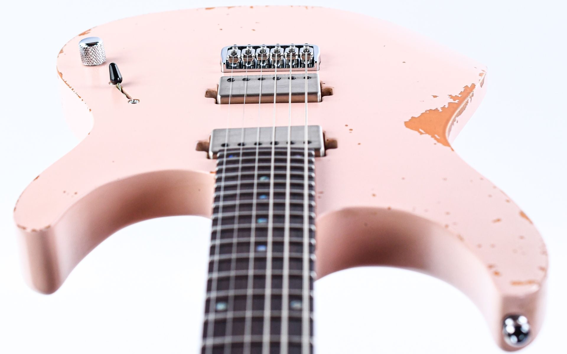 The Mayones Aquila V24 S 6 in Aged Shell Pink is a modern interpretation of the classic superstrat, where Polish craftsmanship meets contemporary specifications in a striking pink finish!
