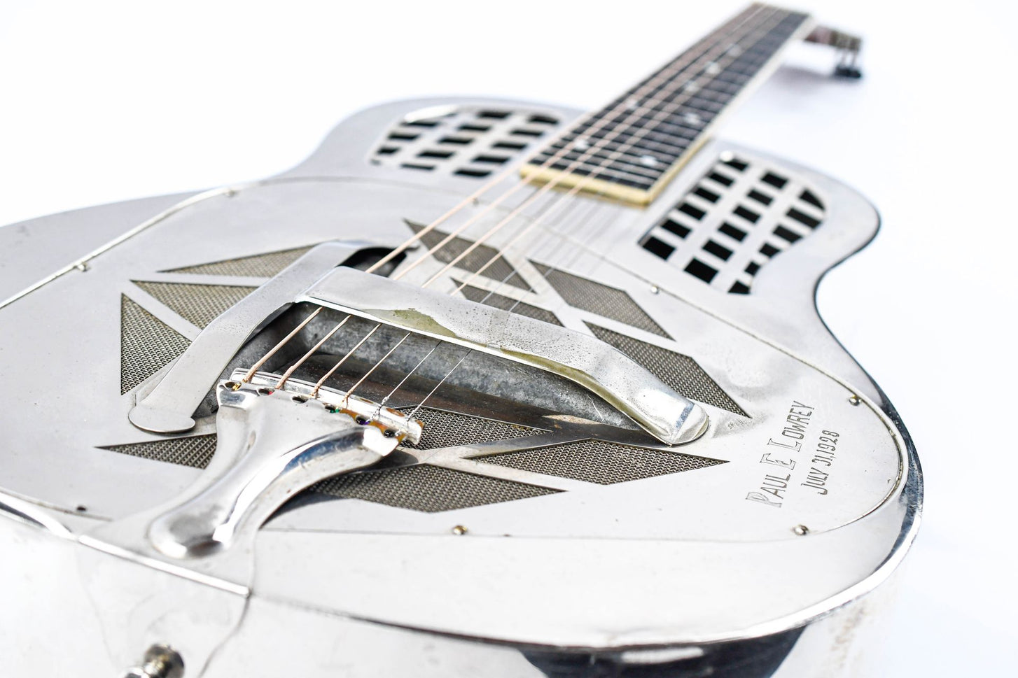 For an instrument that is 97 years old, this Tricone is in excellent condition. The guitar has of course collected playwear and patina, and the back of the body is dented. There is also an engraved name and date on the front; Paul E Lowrey, July 31 1928. This National Tricone is a rare opportunity to own a piece of American guitar history that not only has historical value, but is also simply an impressive musical instrument!