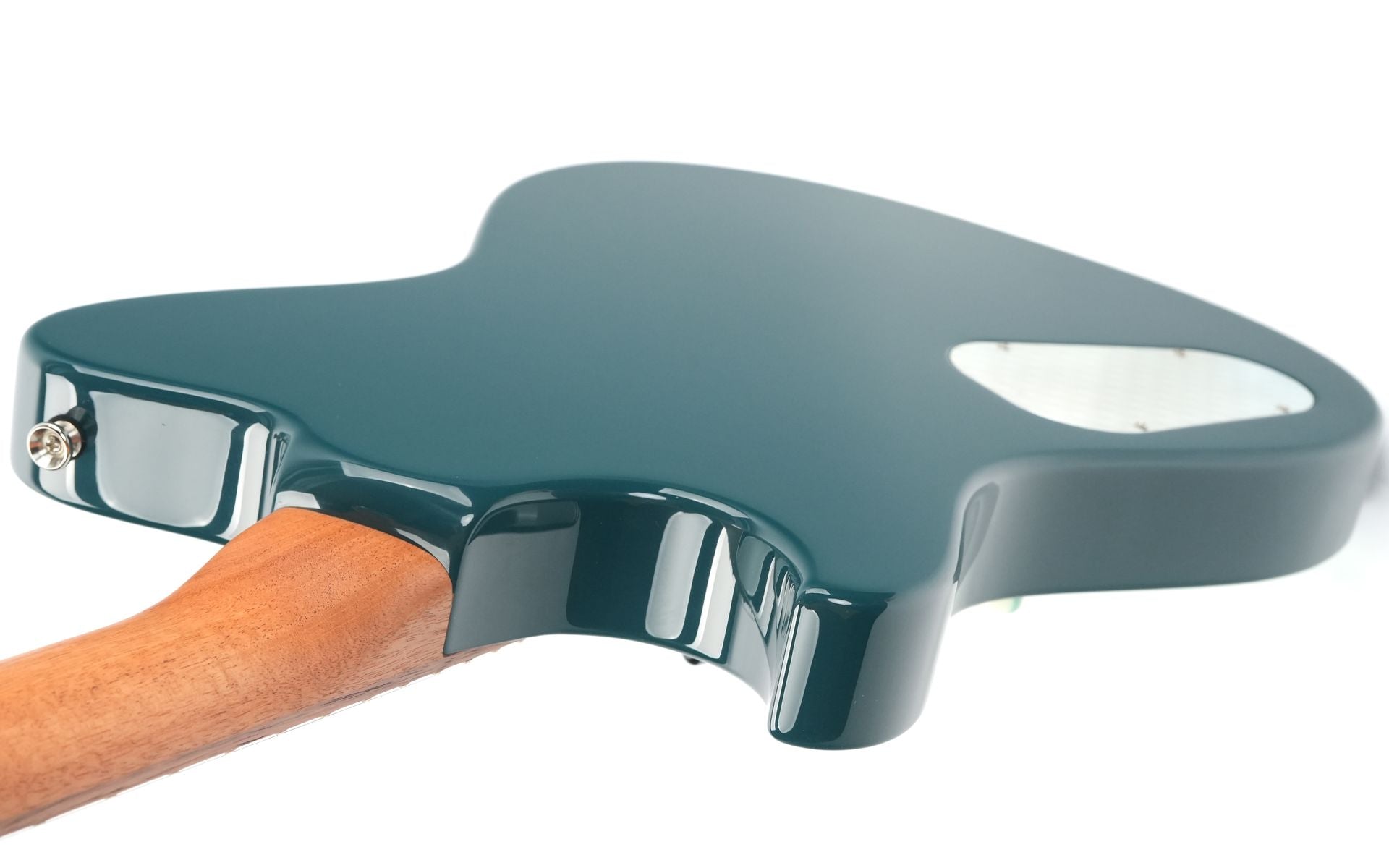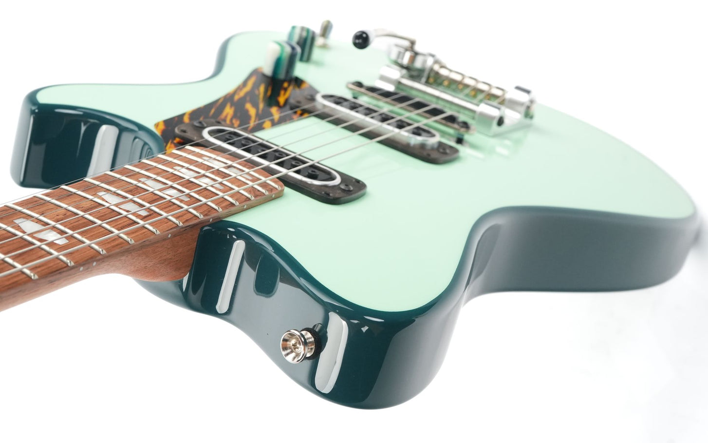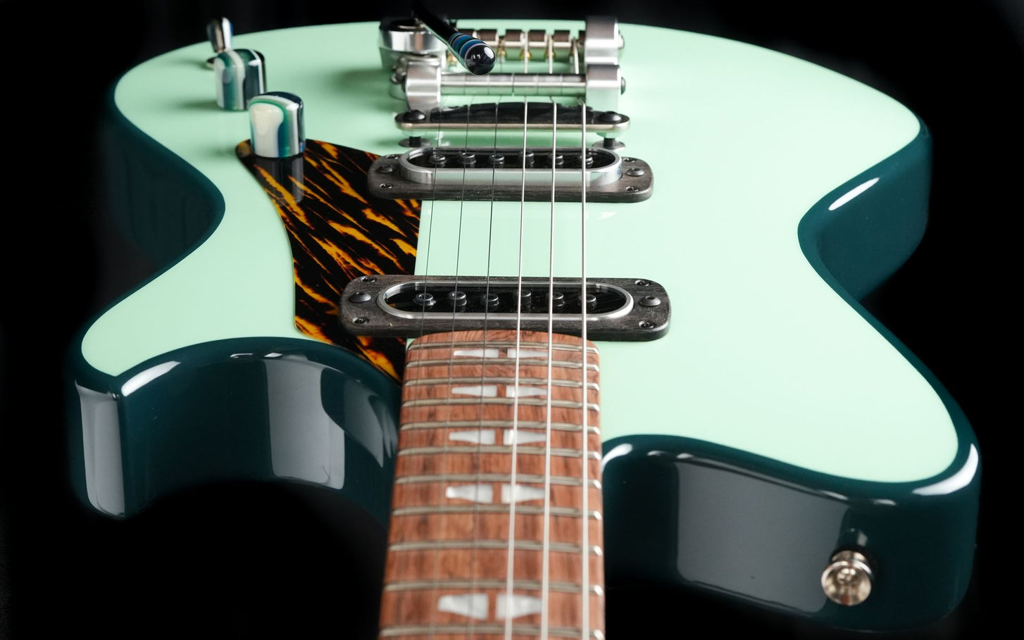 This A-Type has an Urban Ash body topped with a select maple top. The guitar features a very cool Mint Green finish and further elegant details in the form of a firestripe pickguard and unique knobs made of layers of surfboard resin. The CamTail Vibrato and the steel bridge with ebony saddle, designed by Andy himself, are accompanied by two PF42 single coil pickups with a solid, clear sound.
