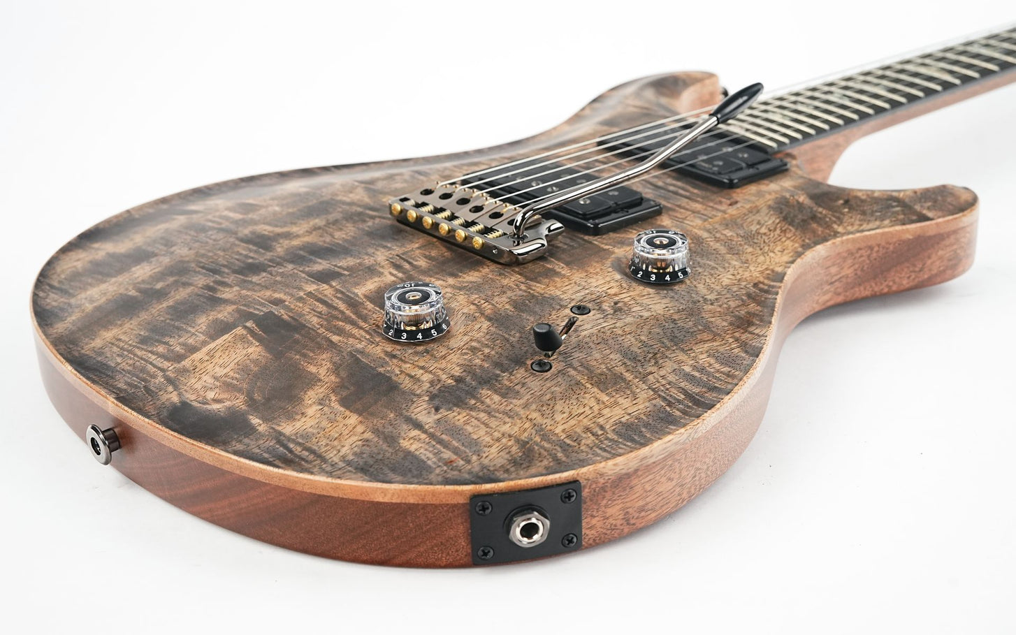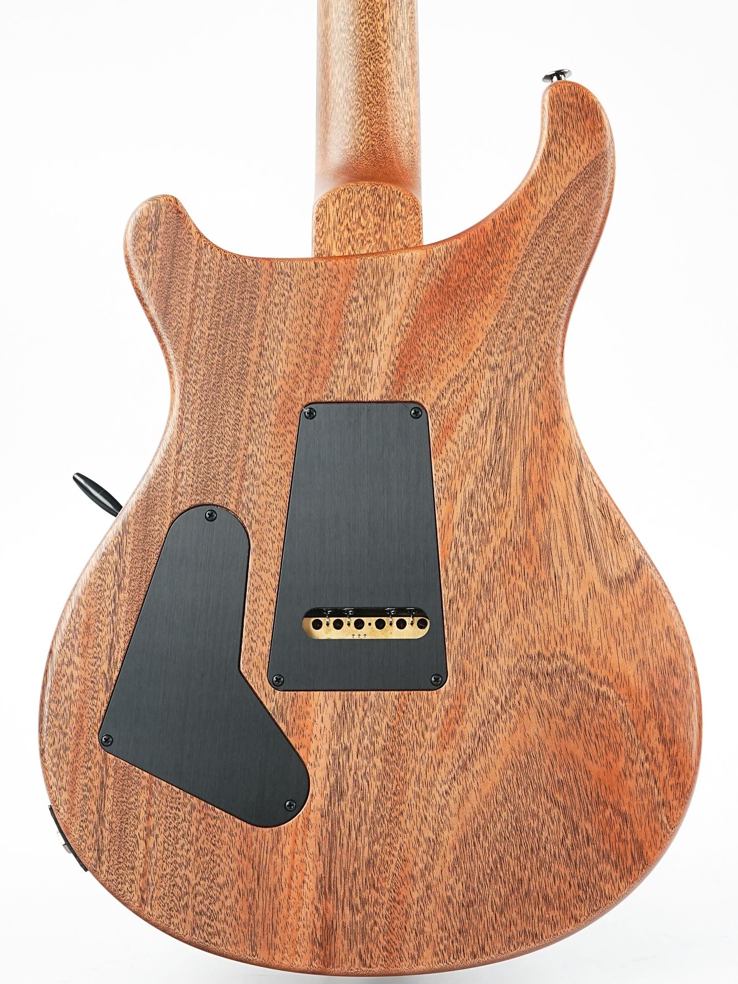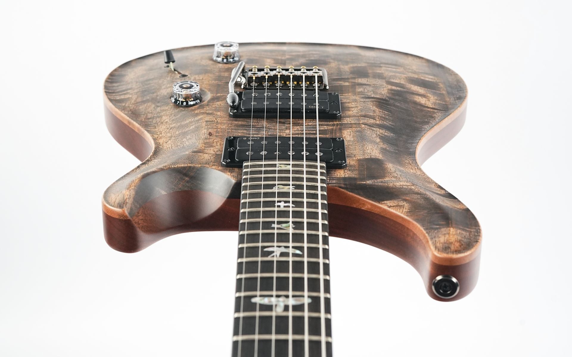 Most notably, this limited edition exchanges the Custom 24’s classic maple for a striking figured mango top. Mango wood retains much of the sound characteristics as maple while bringing an almost “quilted” look to these guitars. The satin nitro finish adds to the guitar’s unique aesthetic appeal by bringing a more natural vibe to the instrument – along with great feel and resonant tone. The ebony fretboard and headstock veneer feature PRS “Old School” birds with outlines and a PRS “Pre-Factory” eagle on the headstock, which both pay homage to early PRS guitars.