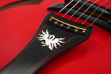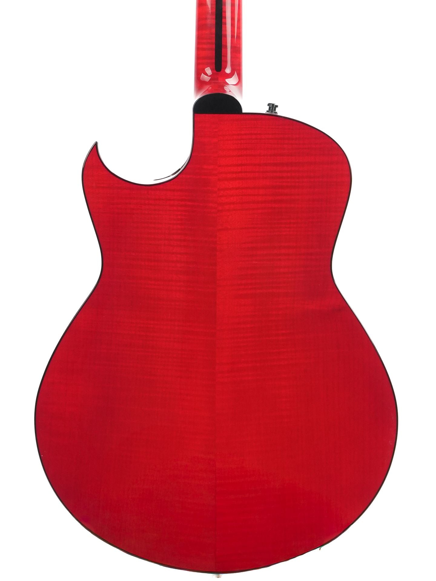 Finished in a striking red and with a matching Calton case, this Marchione is a guitar that loves to command attention. The flamed maple body is paired with a spruce top, and the bridge, tailpiece, pickguard, fingerboard, and headstock overlay are made of exceptionally beautiful ebony. By using the finest materials, this Marchione is in a class of its own in terms of both sound and playability; with their experience and attention to detail, Marchione also manages to build a stable, reliable, and easy-to-play neck time and time again.