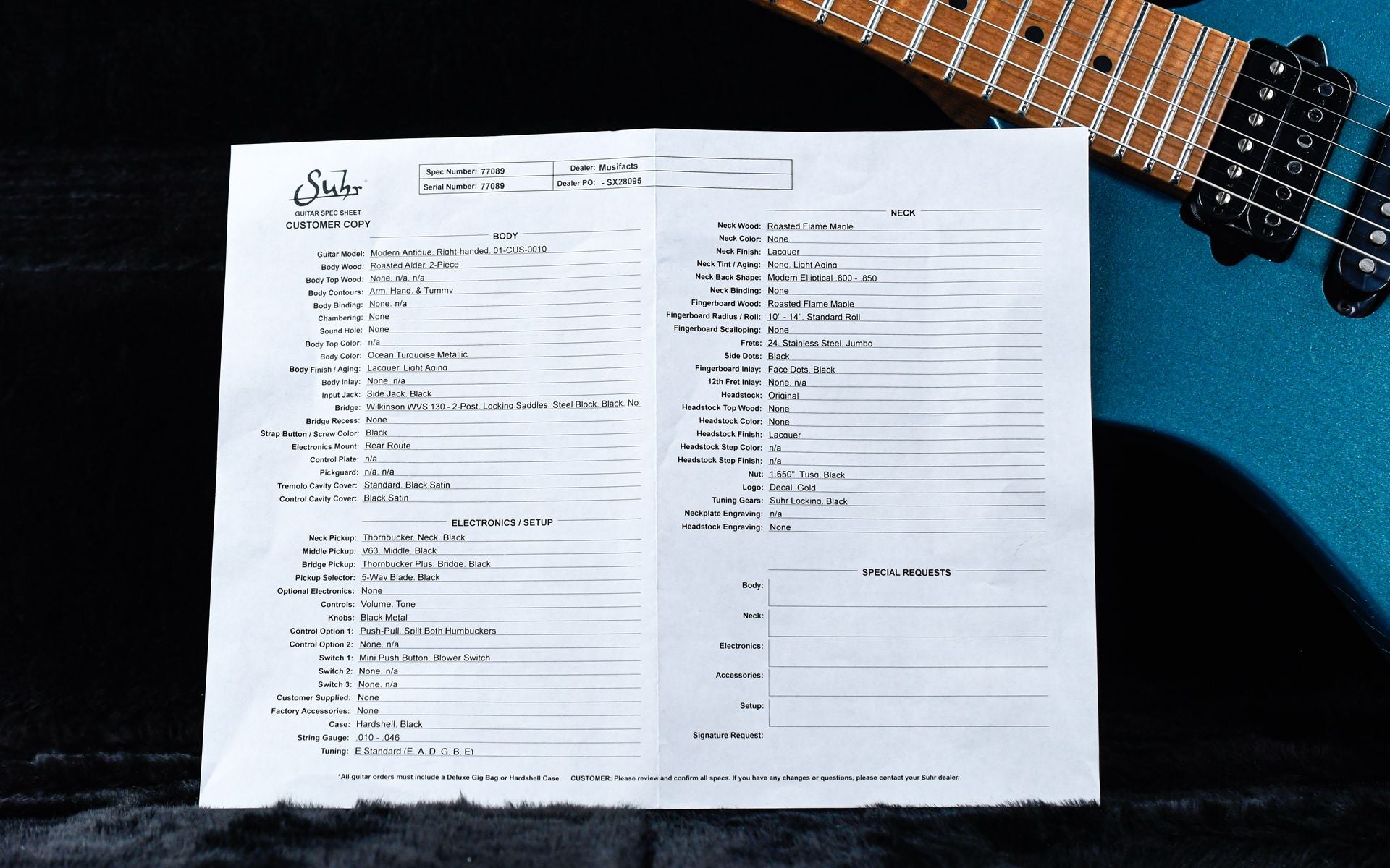 A small push button between the volume control and selector switch acts as a blower switch, sending the bridge pickup directly to the output jack with a simulated volume and tone load for instant clarity and bite. This Suhr comes in a hardshell case with a TFOA Passport.